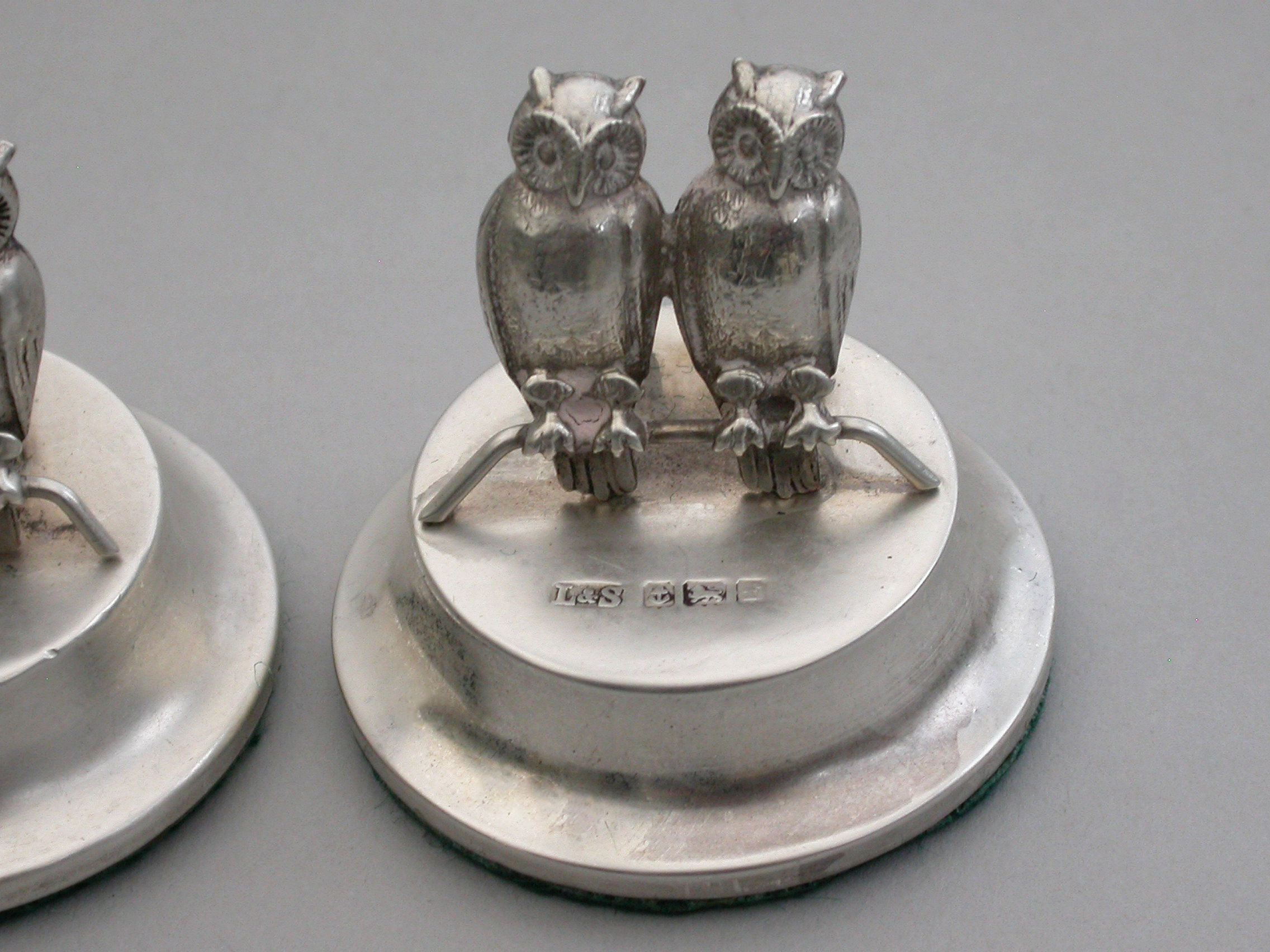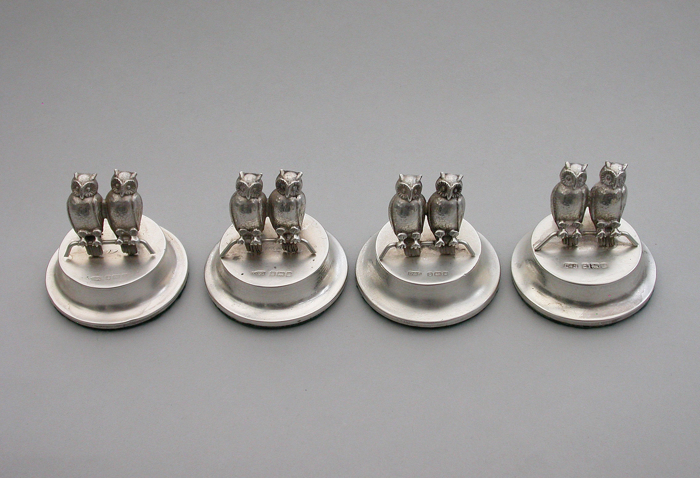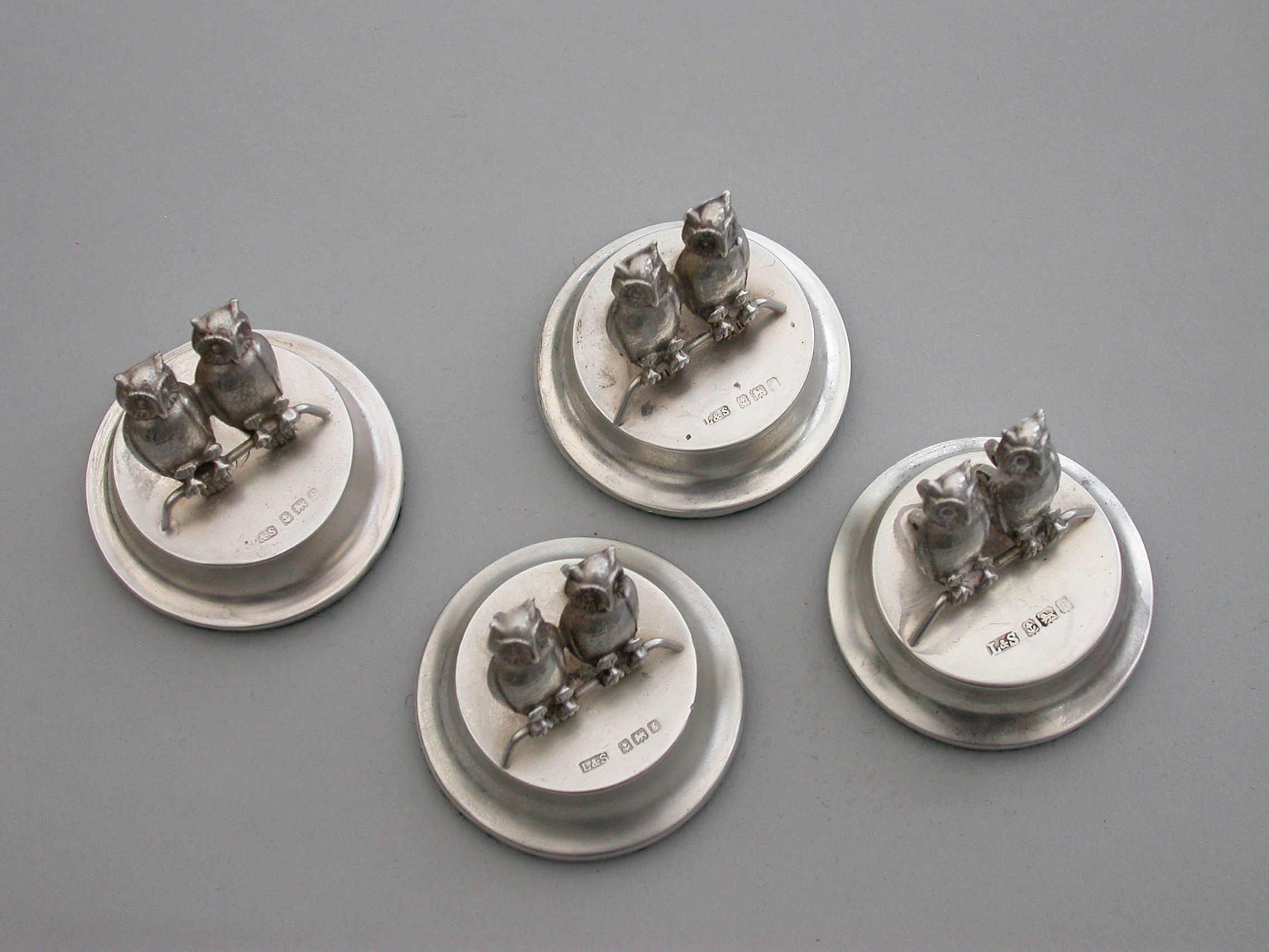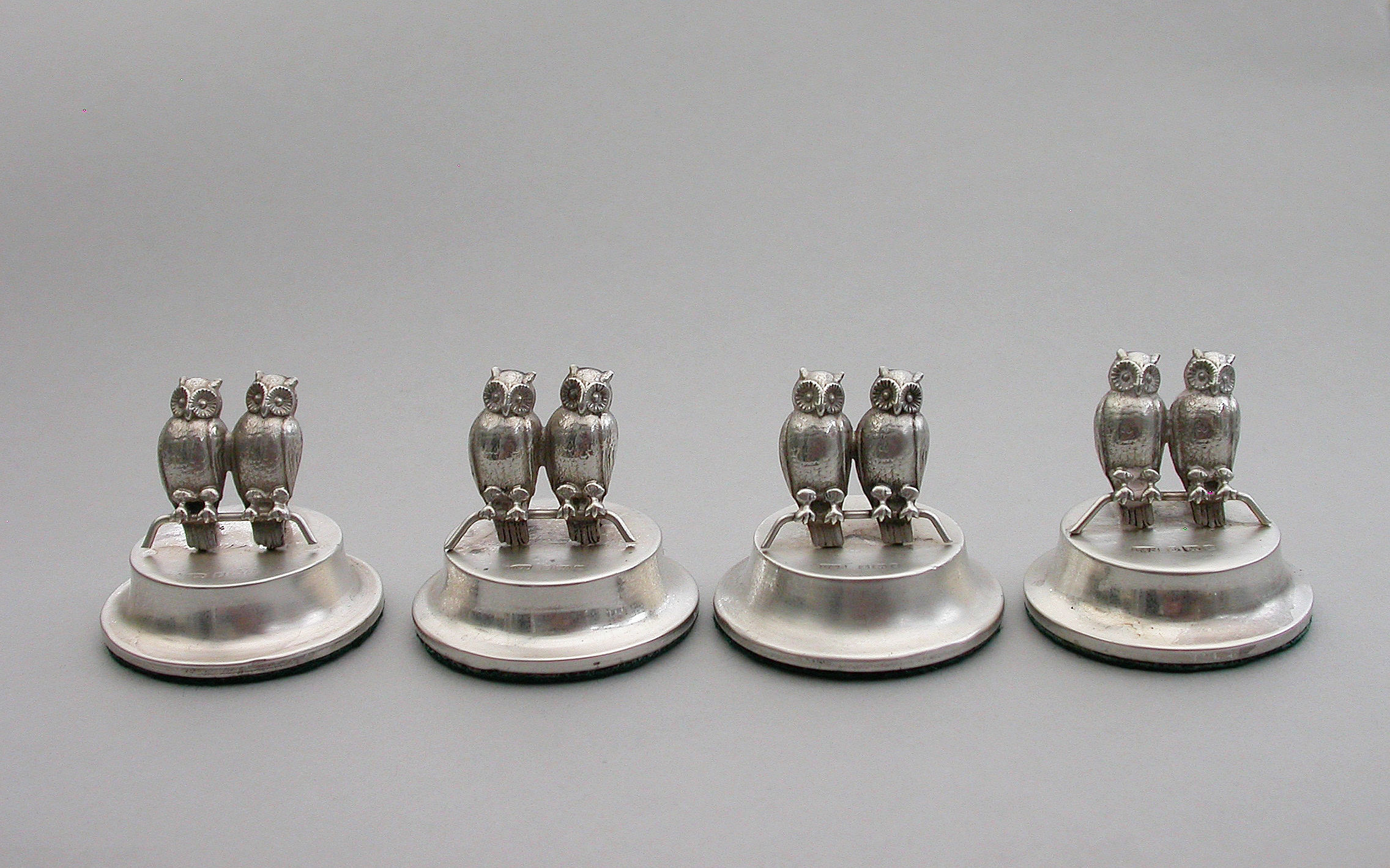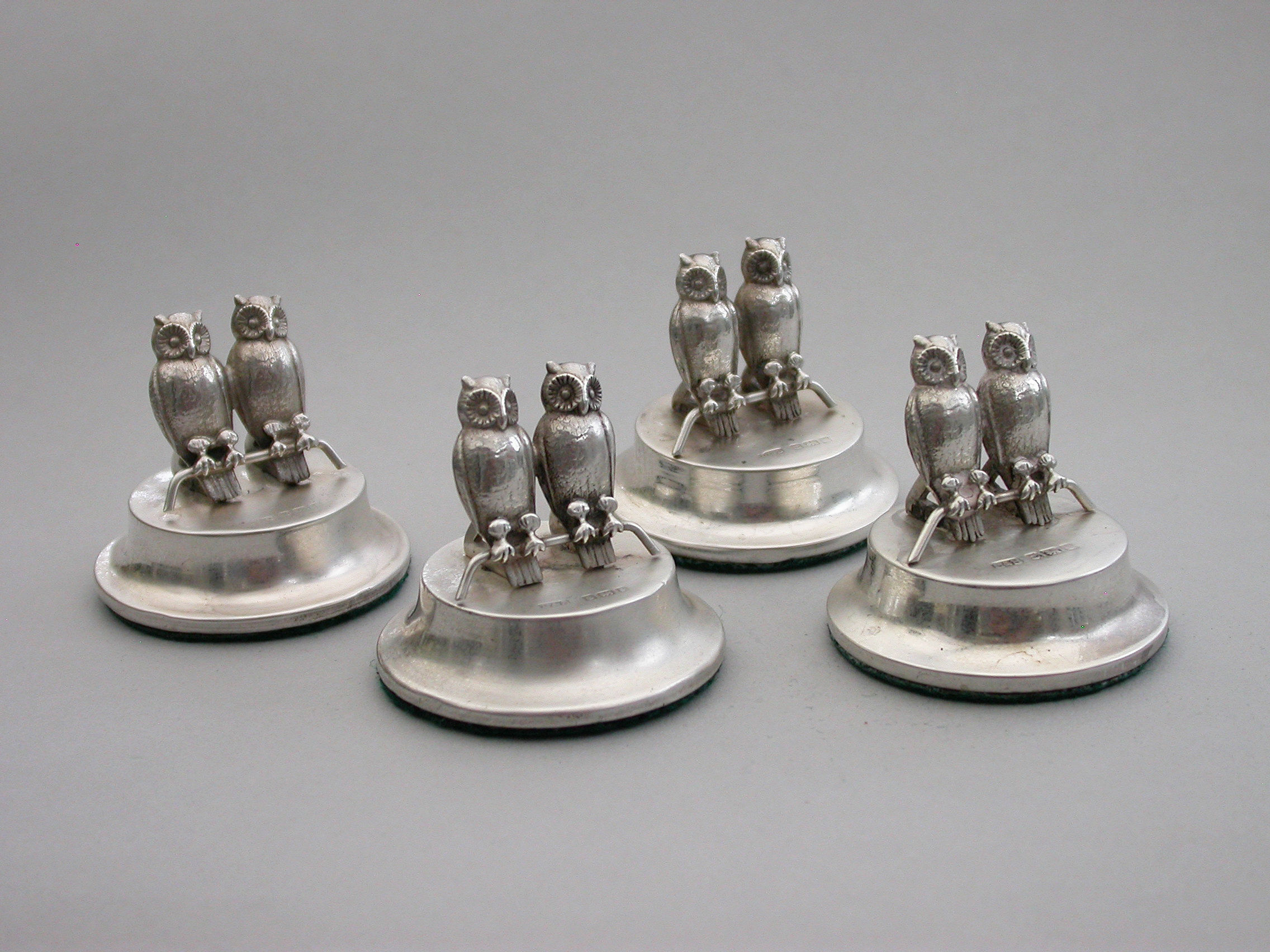 A good set of four Edwardian silver Menu holders modeled as pairs of owls sitting on perches, on filled circular pedestal bases.