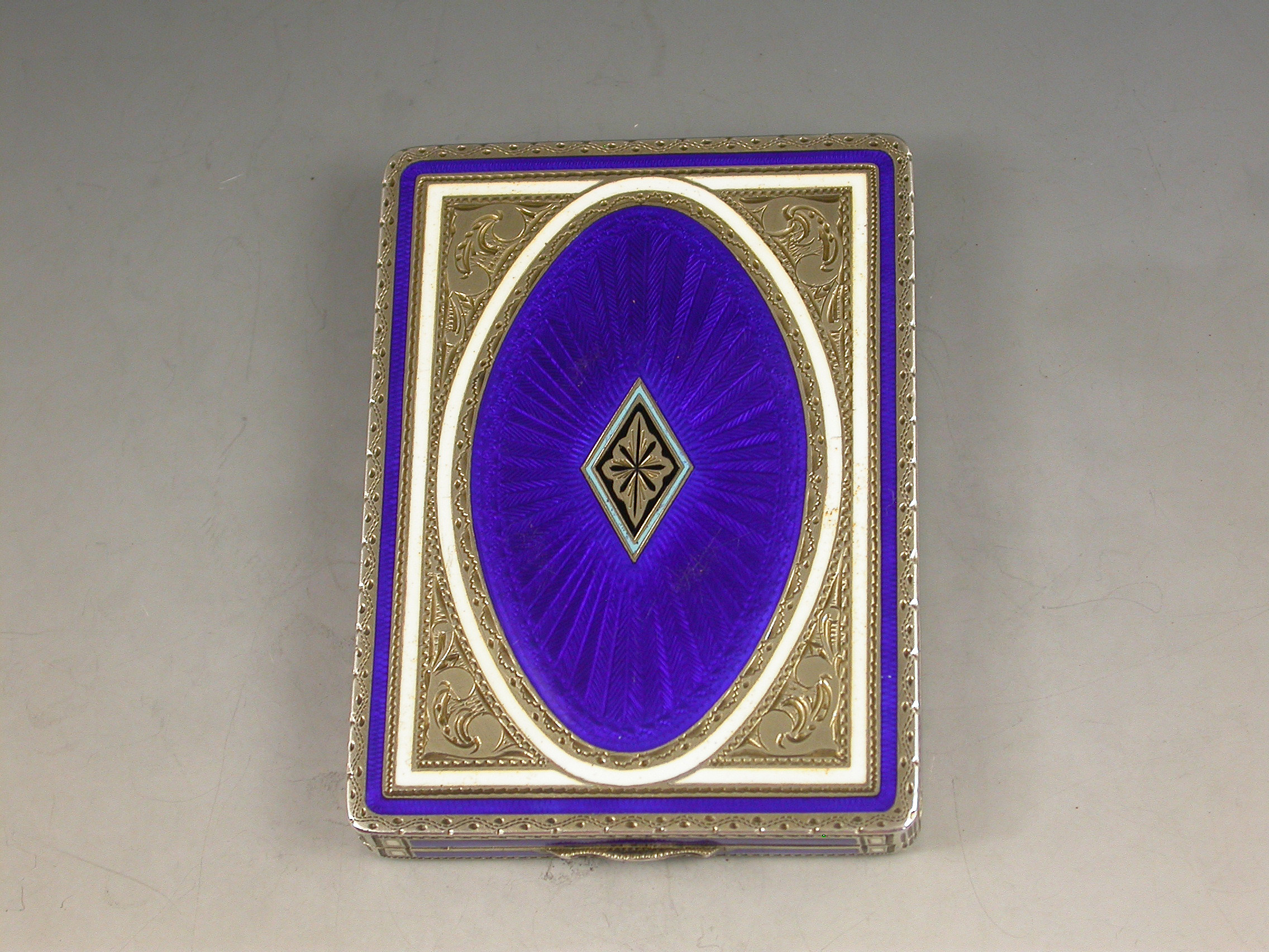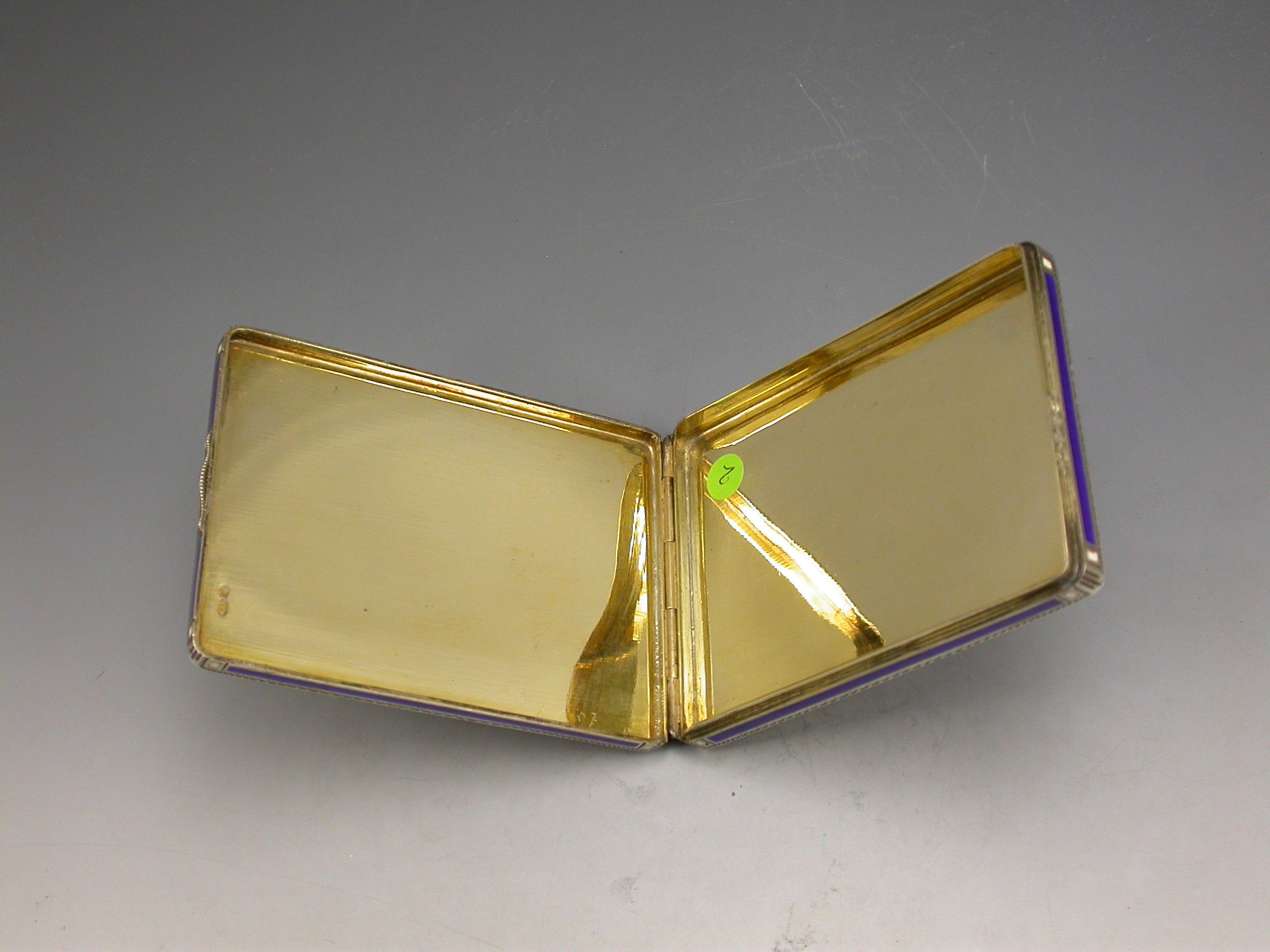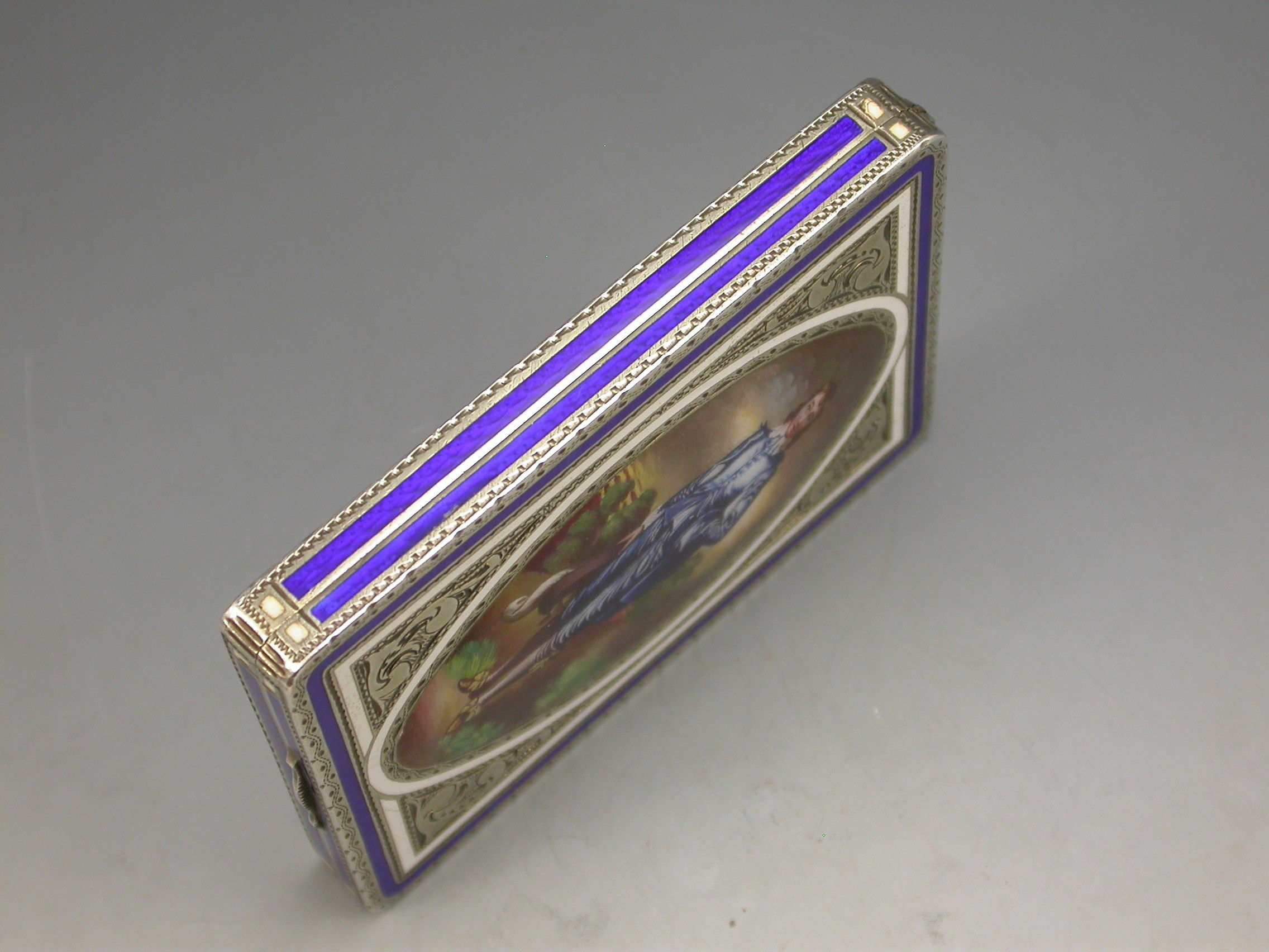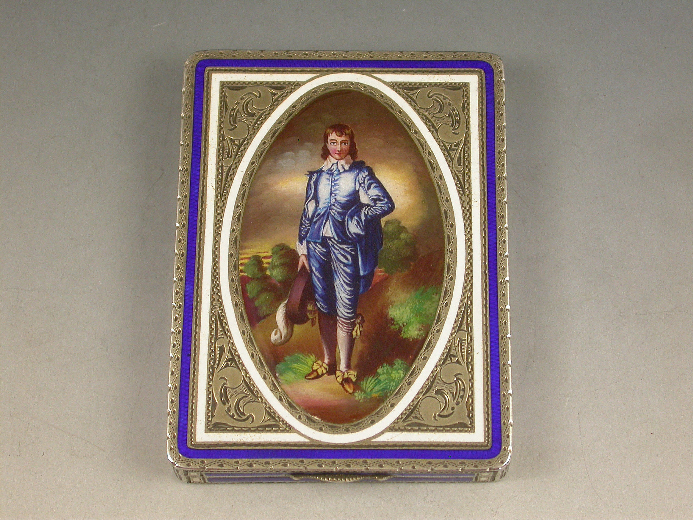 A very fine quality early 20th century silver and enamel Cigarette Case, the cover set with an oval panel depicting the ""Blue Boy"" by Gainsborough, the base and sides with bands of blue and white enamel decoration and an oval blue enamel panel to the base. Silver gilt interior.