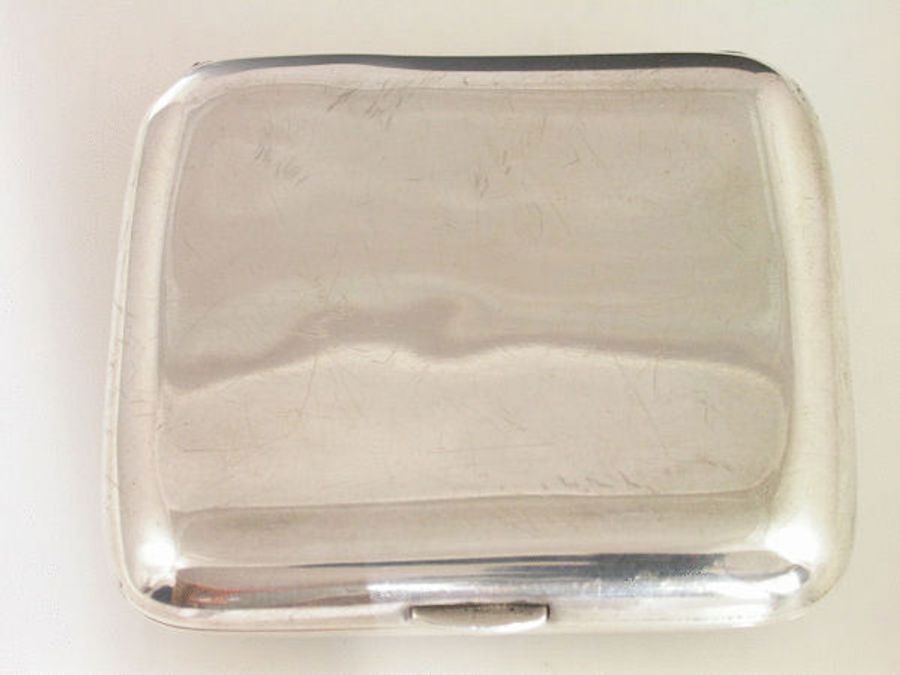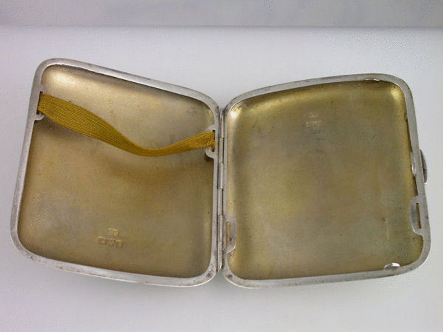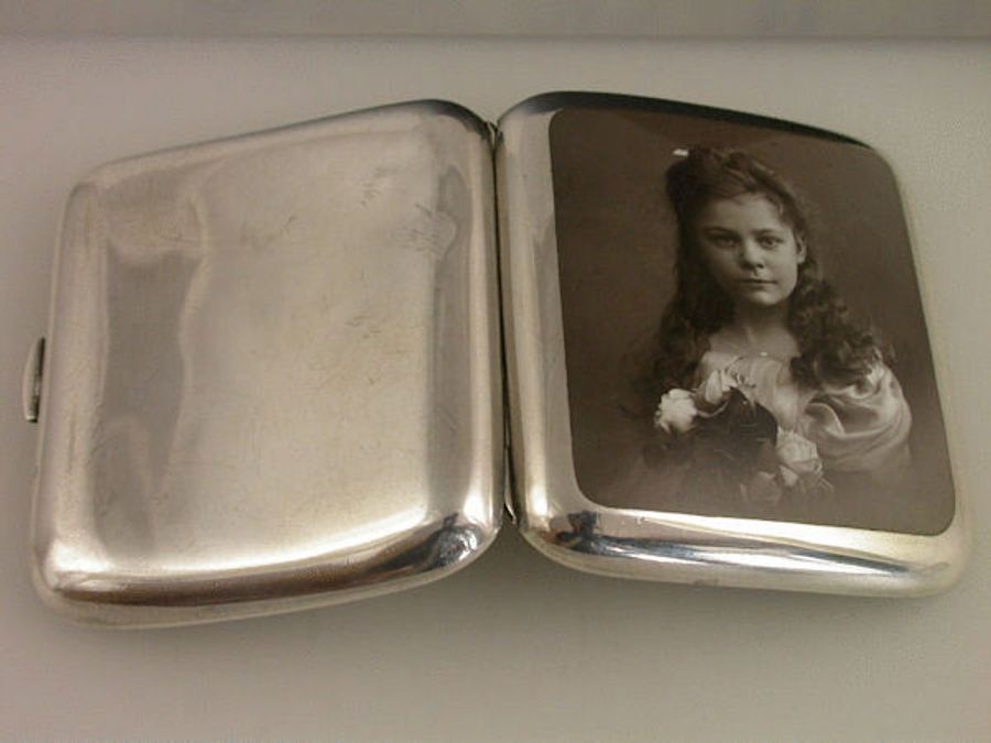 A good Antique silver and enamel Cigarette Case of curved rounded rectangular form with silver gilt interior, the front with superb quality sepia enamelled portrait of a pretty young girl with flowing locks holding a bouquet of roses.