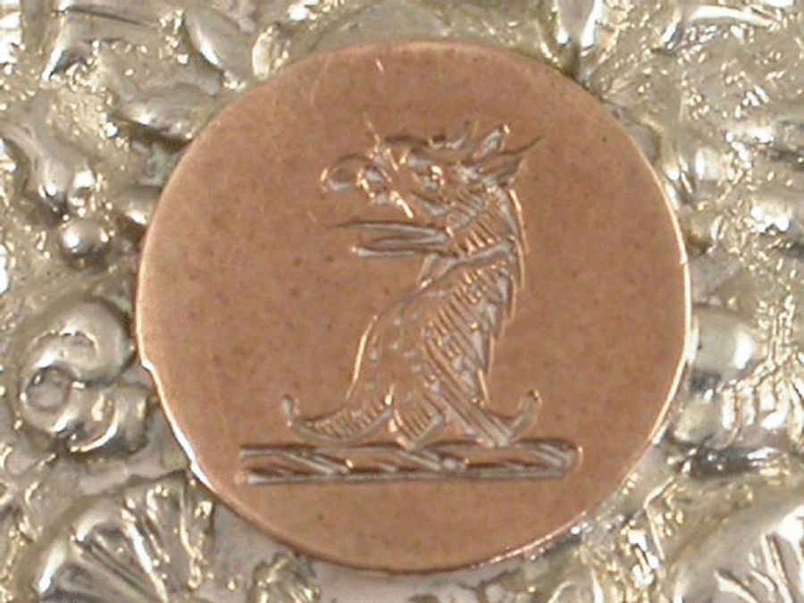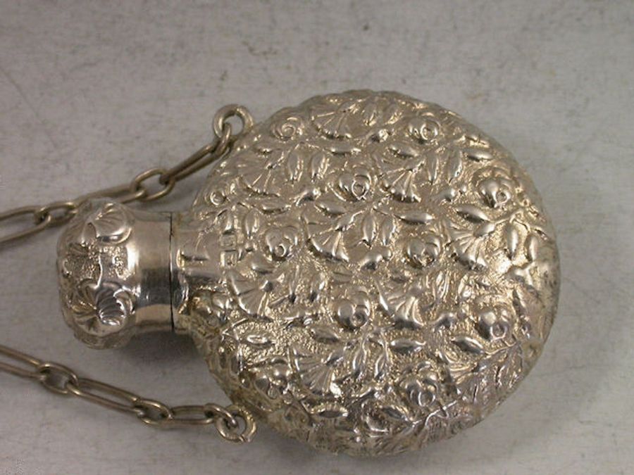 A good Victorian silver Chatelaine Scent Bottle of disc shape with screw off lid, finely chased and embossed with flower heads including roses, applied with a circular gold plaque engraved with a crest depicting a gryphons head (the crest of many families). Two attached suspension chains linked by a ring.