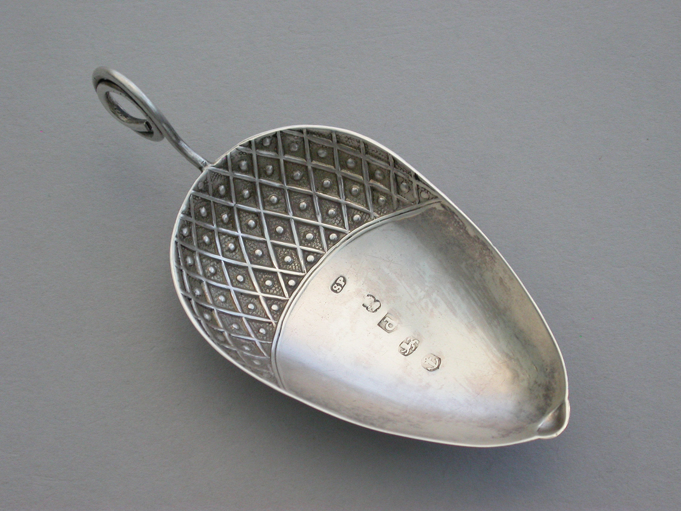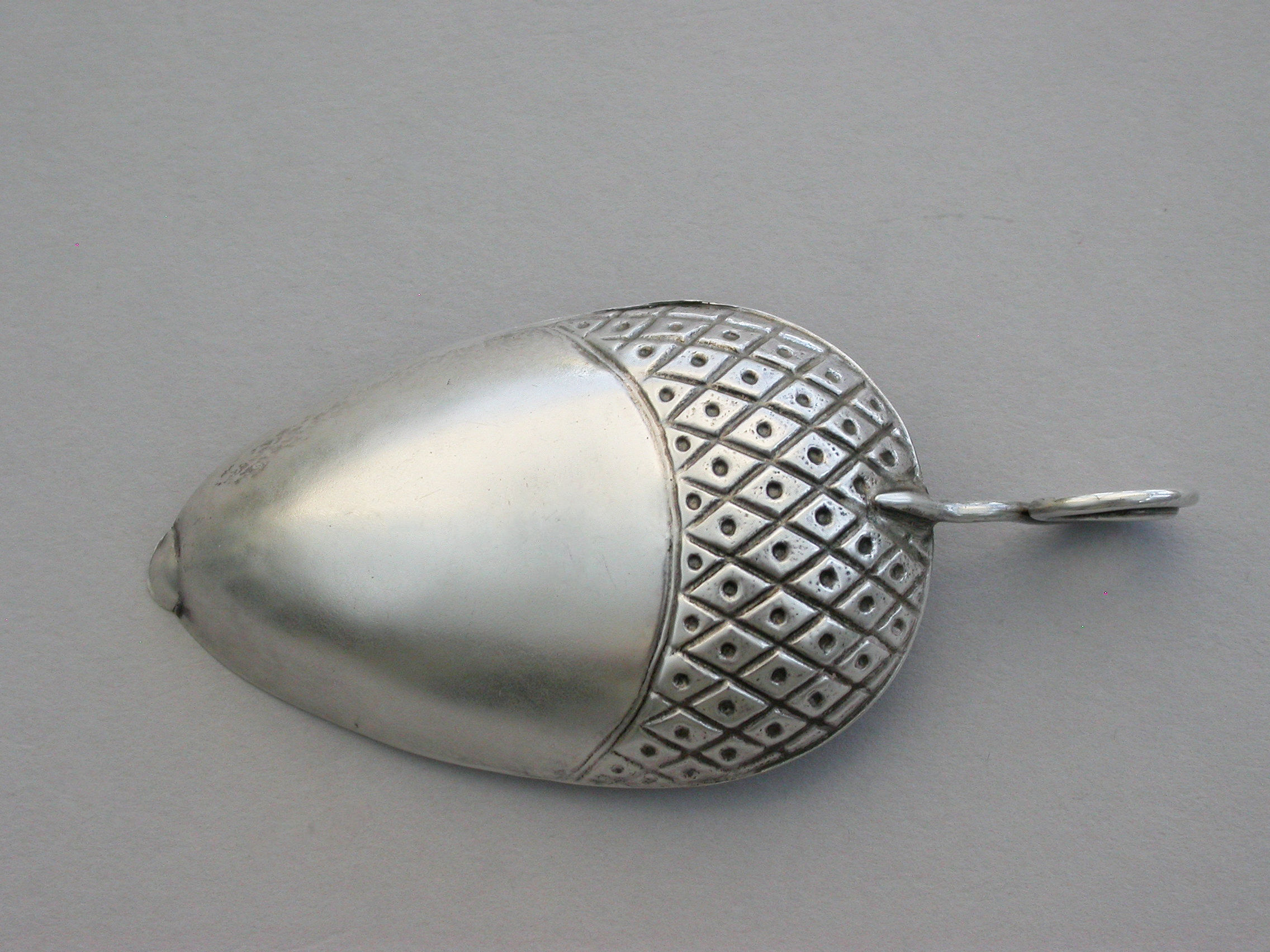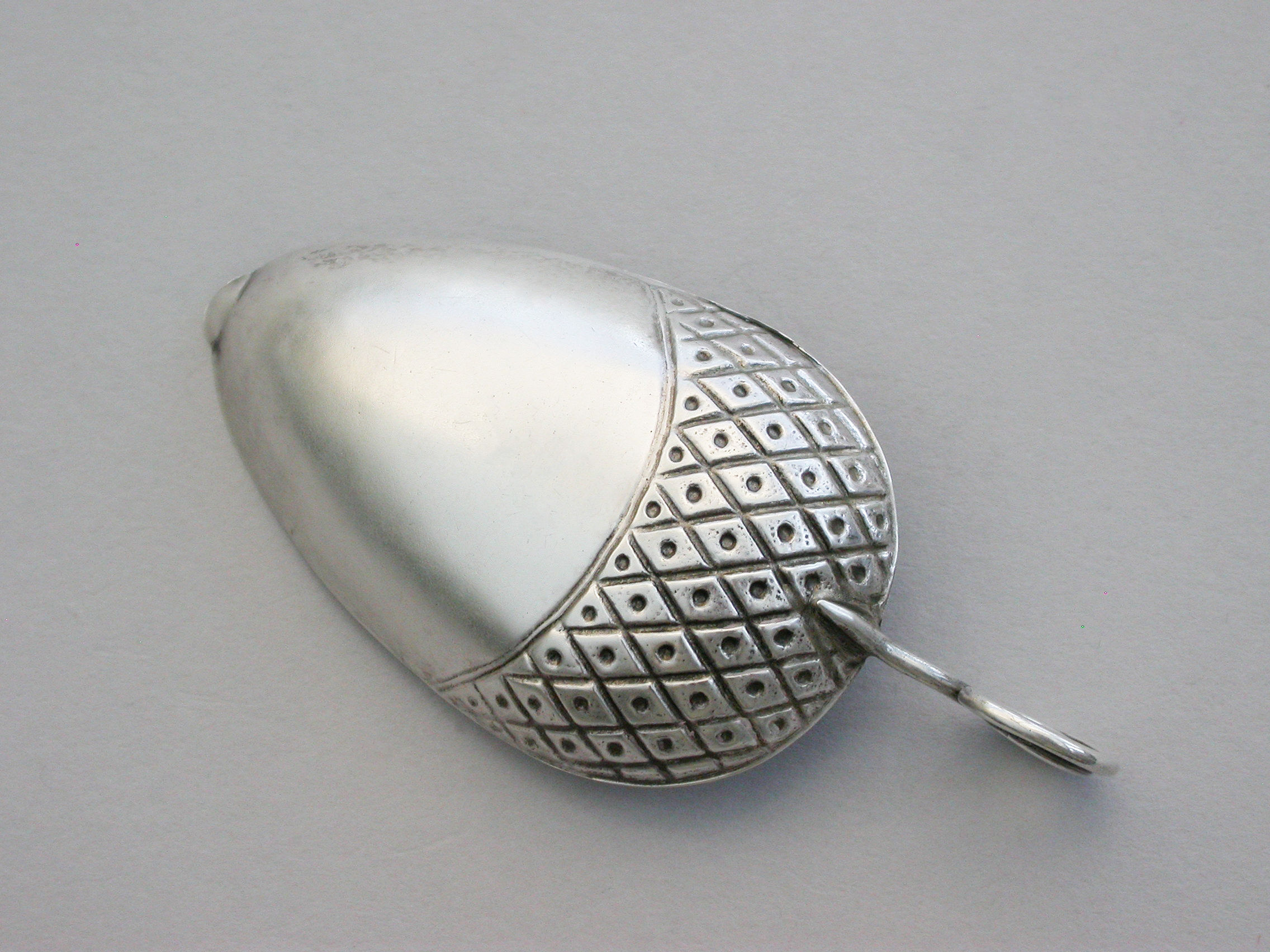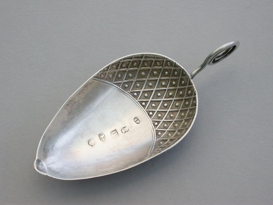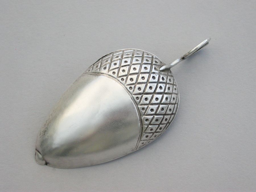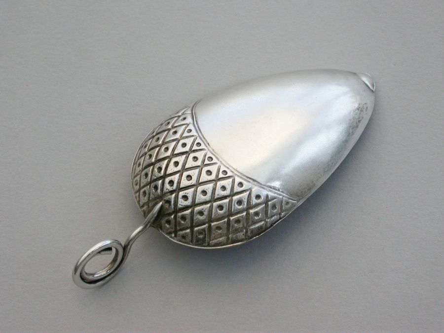 A very rare George III silver Caddy Spoon made in the form of an acorn, with twisted loop handle and partly decorated bowl.