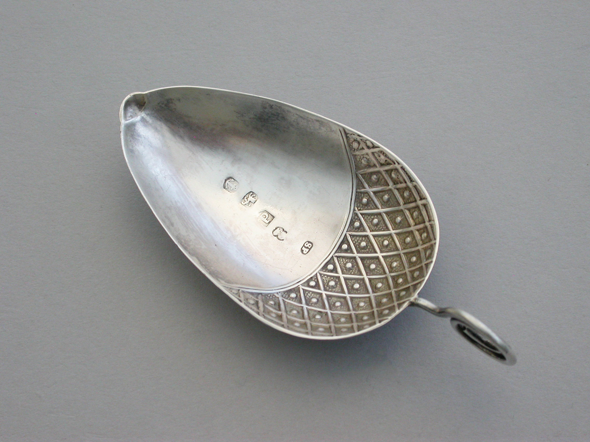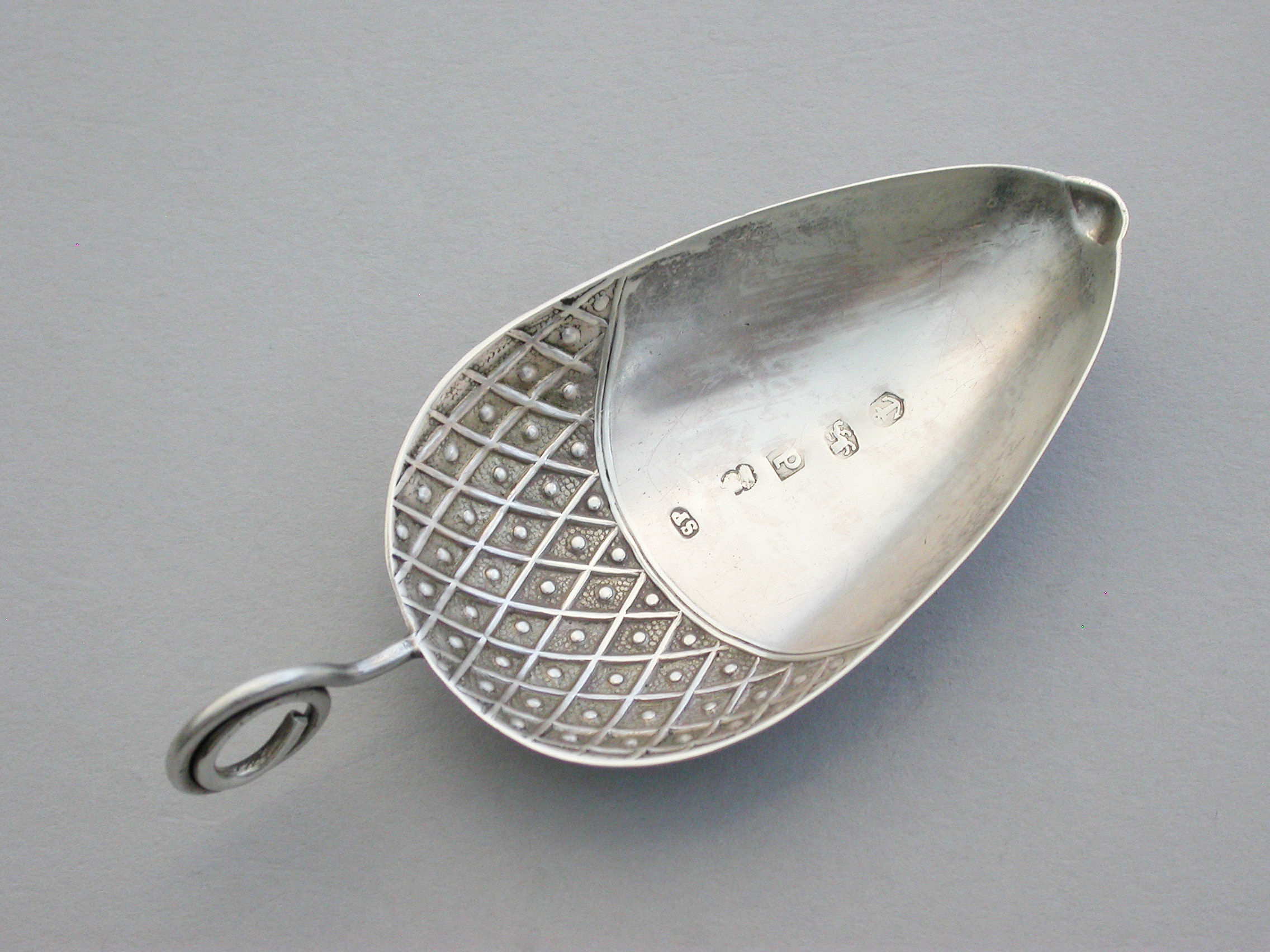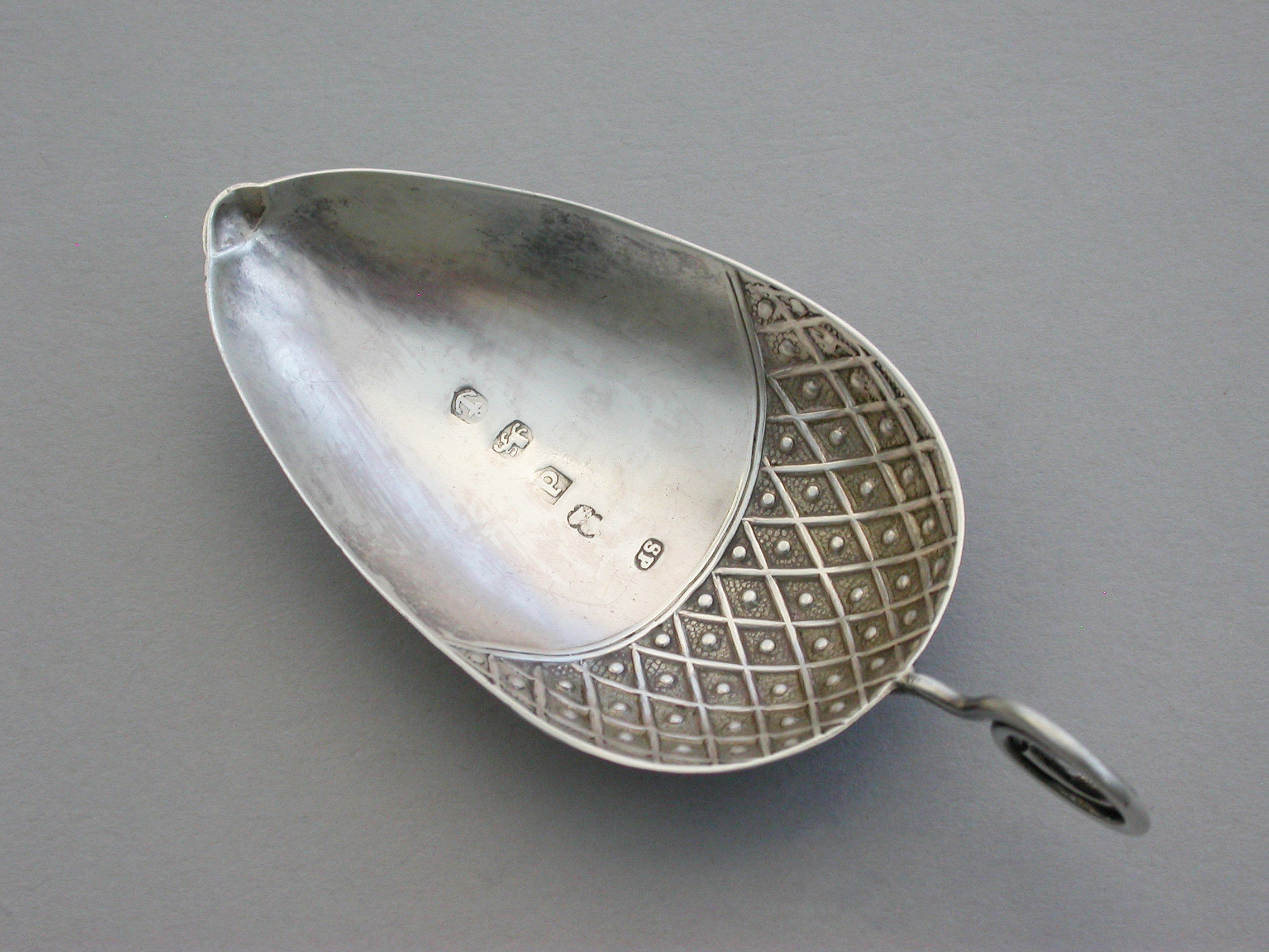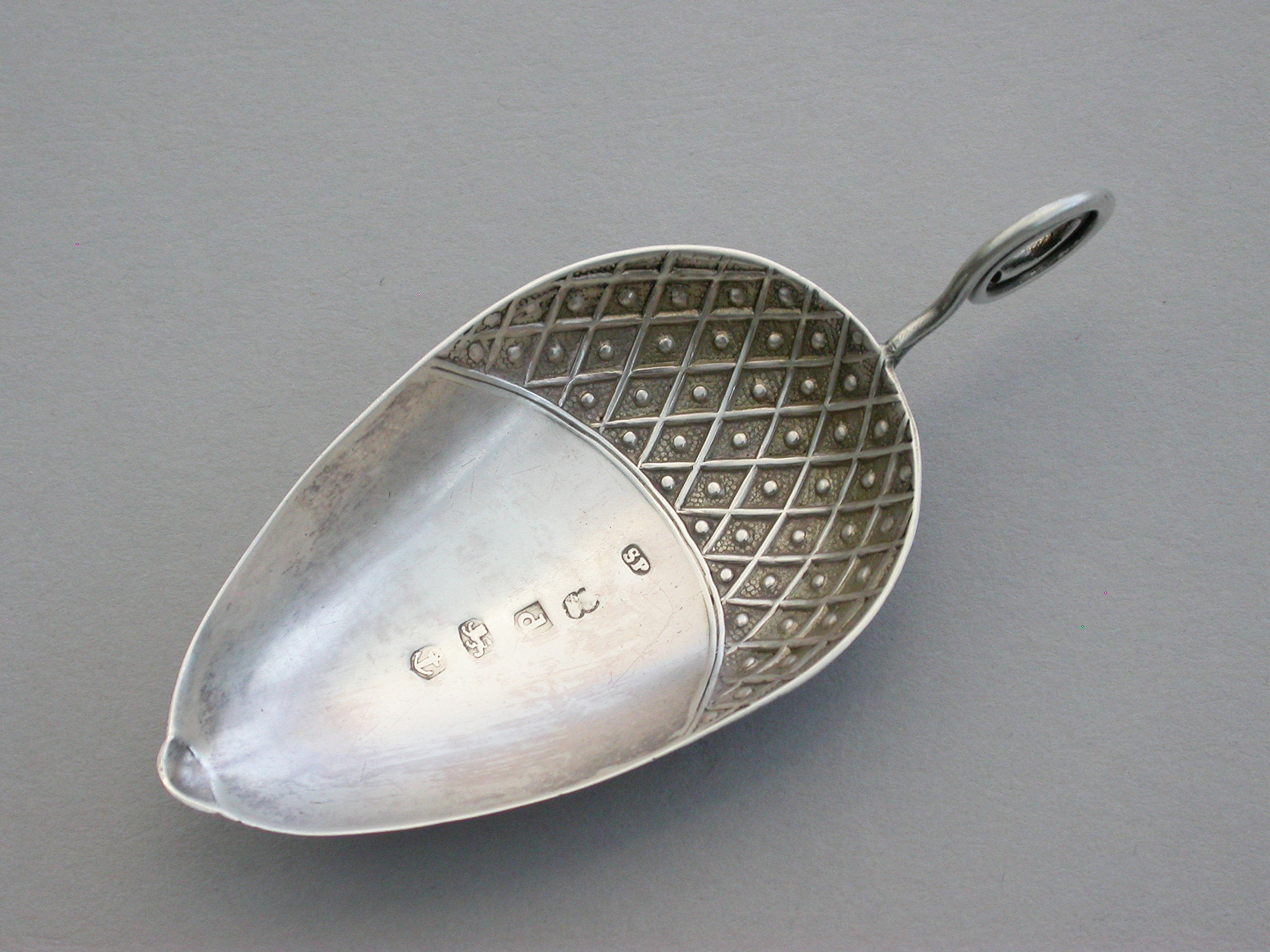 A very rare George III silver Caddy Spoon made in the form of an acorn, with twisted loop handle and partly decorated bowl.