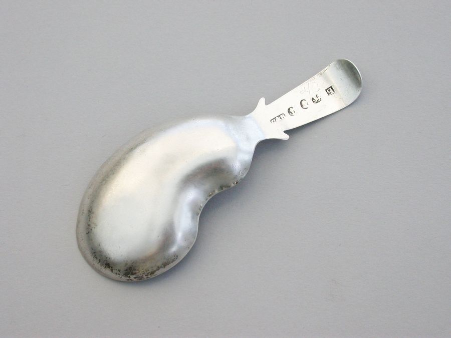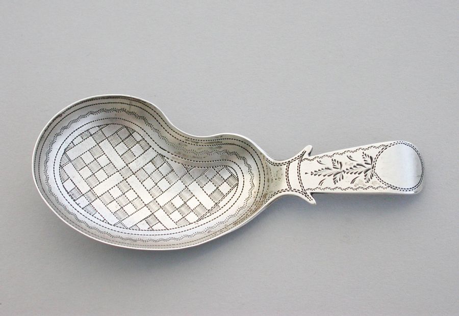 A rare George III silver Caddy Spoon with barbed Old English handle, the kidney bean shaped bowl with bright-cut engraved checkerboard decoration.
