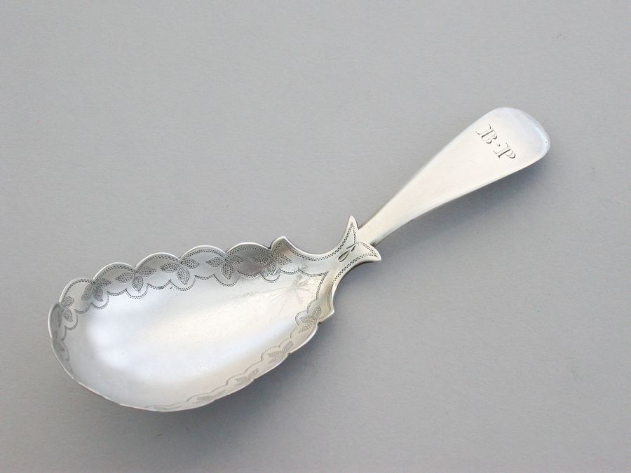 A good George III silver Caddy Spoon with barbed Old English type handle, the elongated pear shaped bowl with scalloped edge and bright-cut engraved decoration.