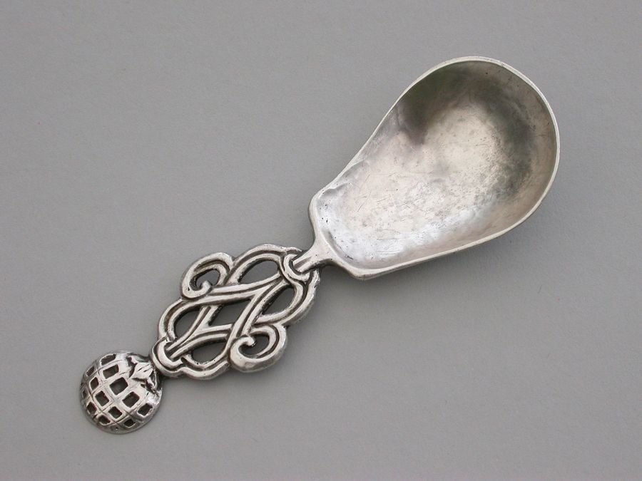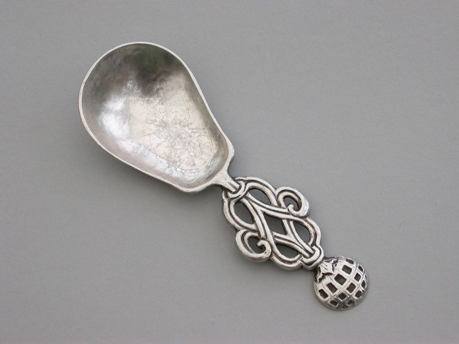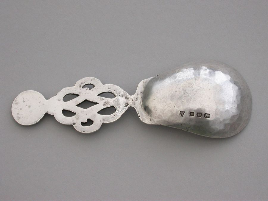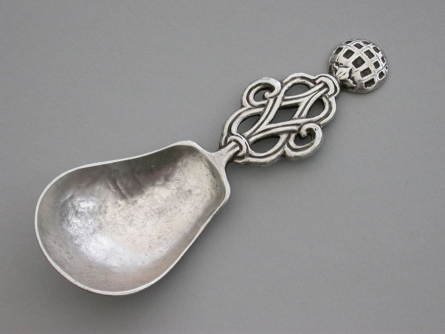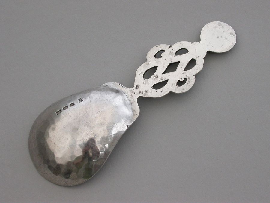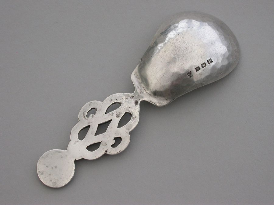 A rare and unusual early 20th century Arts & Crafts cast silver Caddy Spoon with elongated hammered pear shaped bowl and pierced wire-work handle with mesh golf ball type finial.