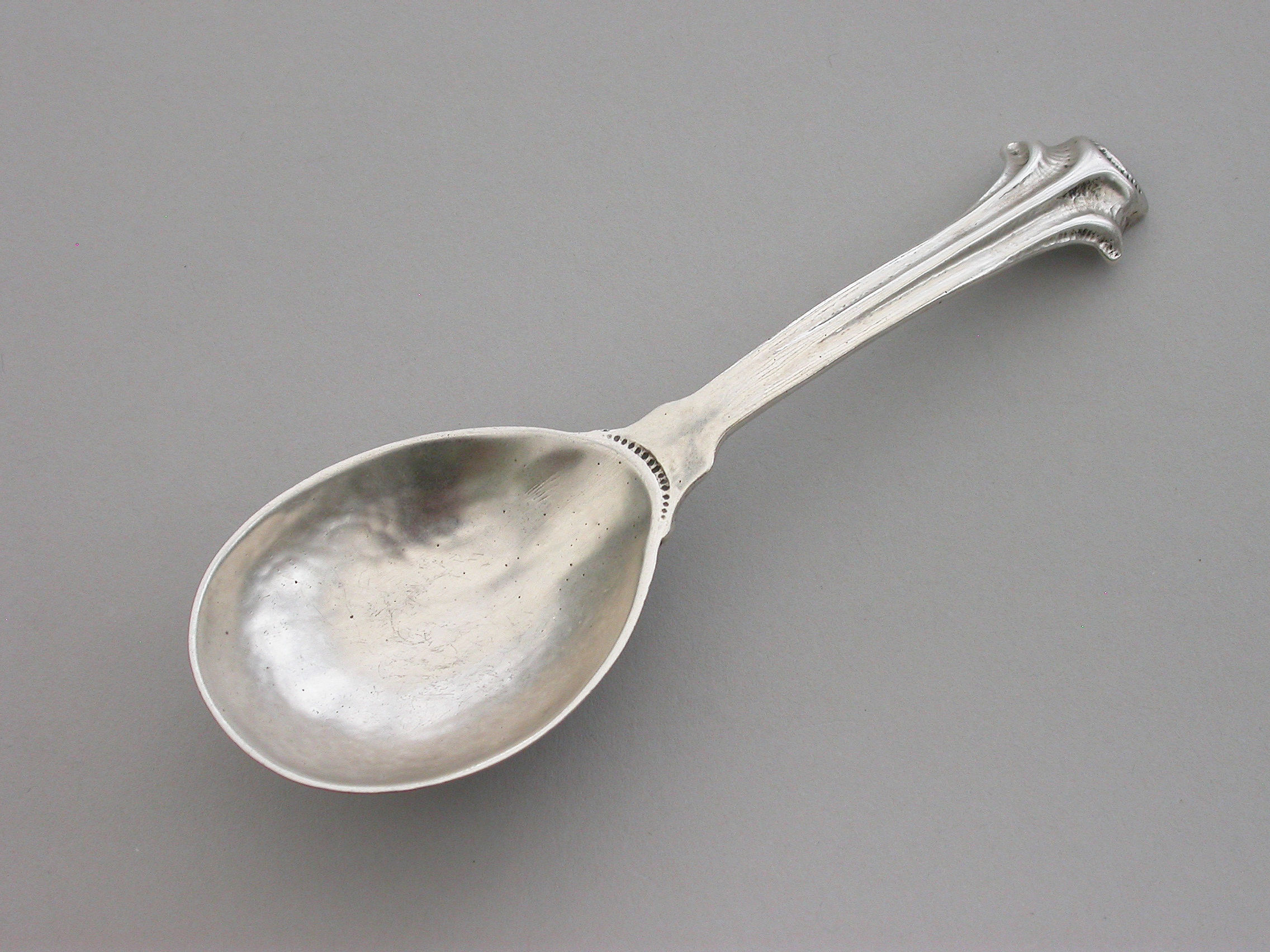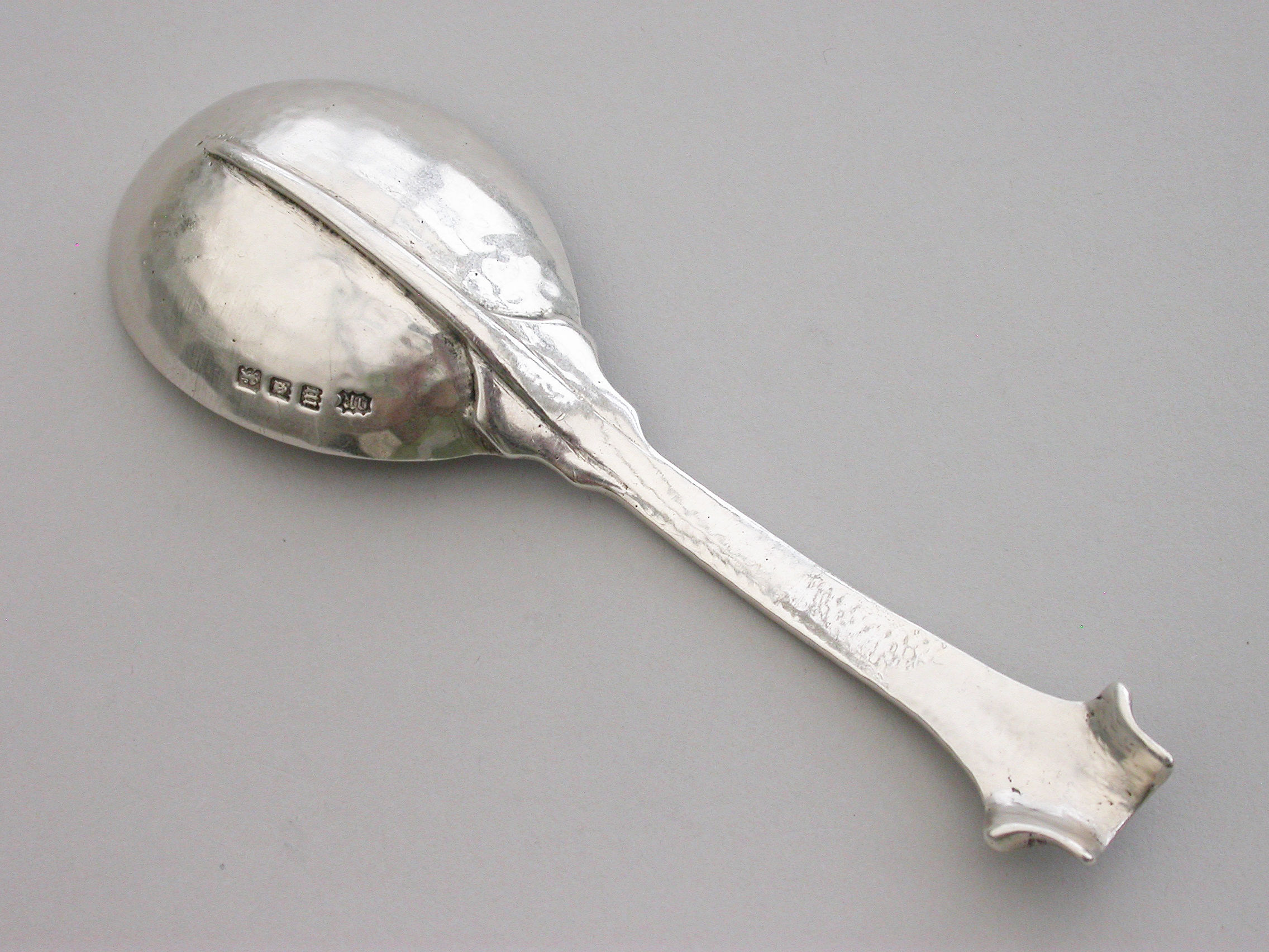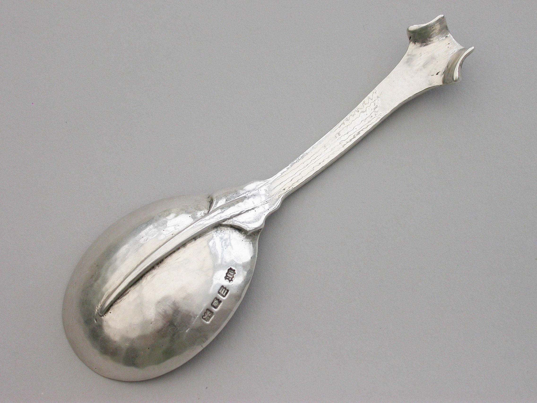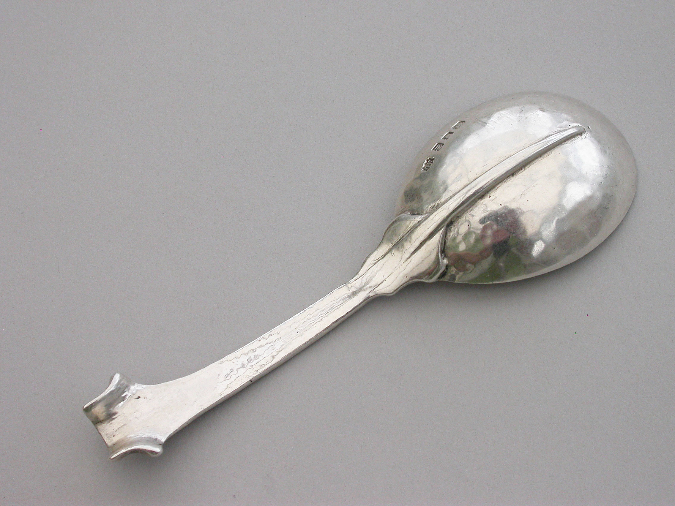 A rare and unusual Arts & Crafts hammered cast silver Caddy Spoon with reeded Onslow type handle and rat-tail bowl.