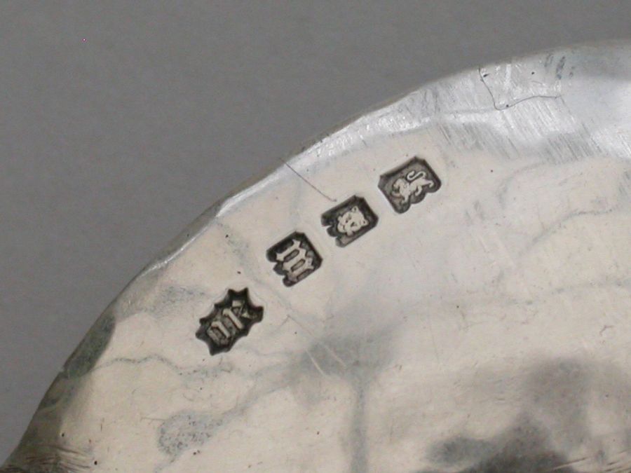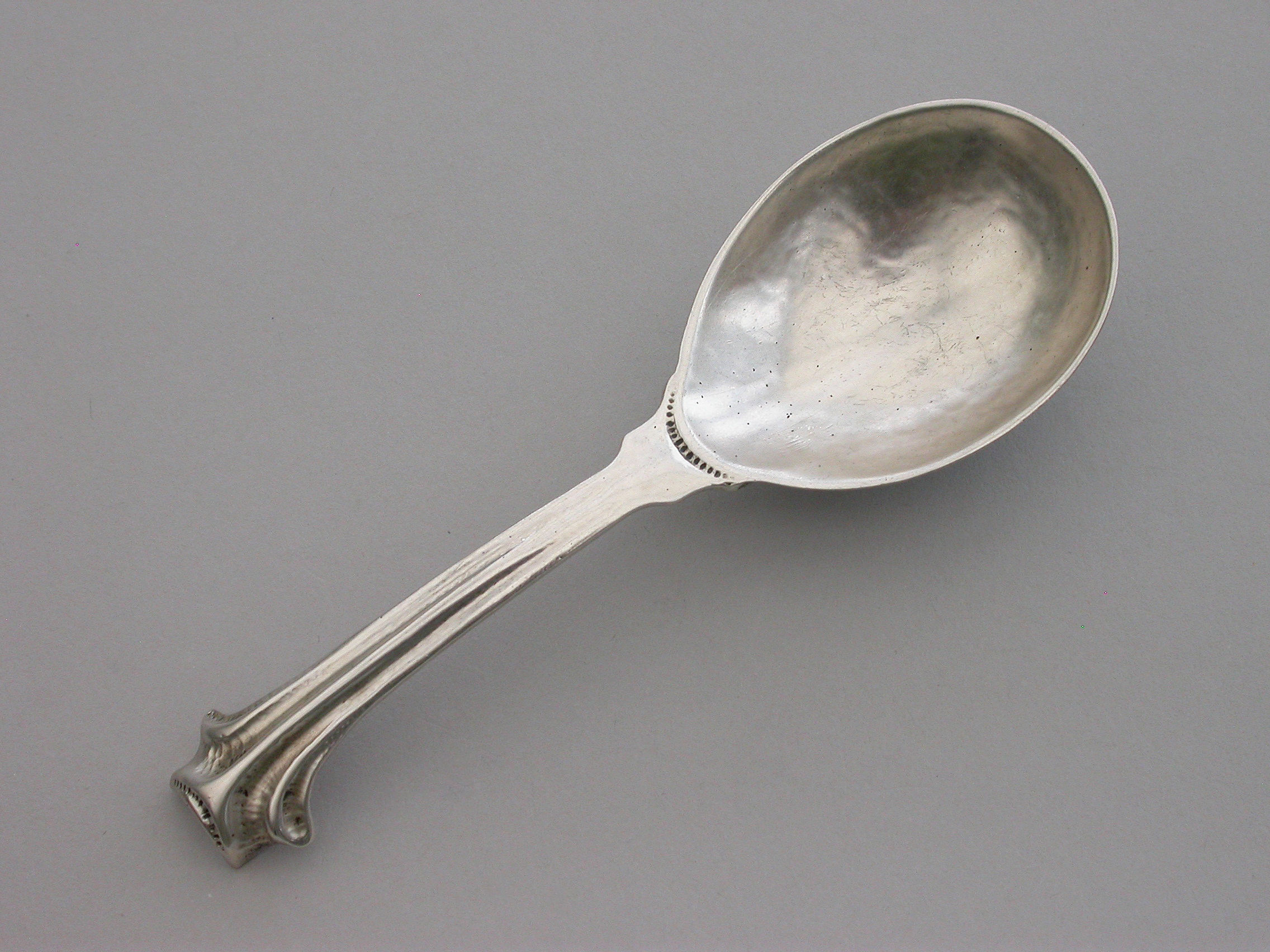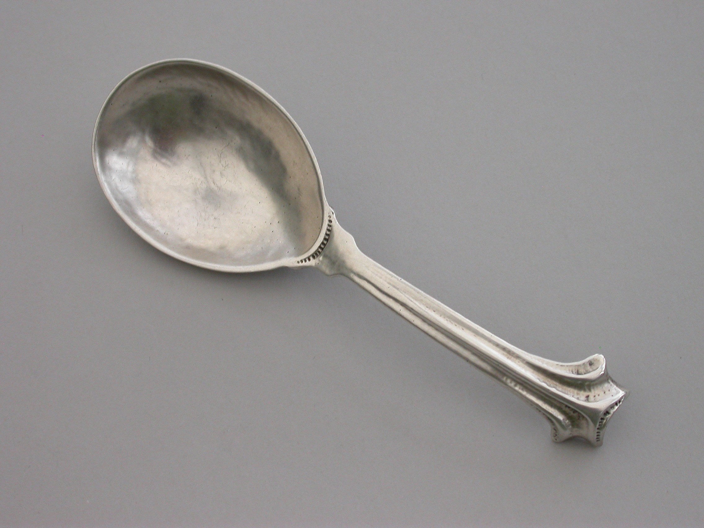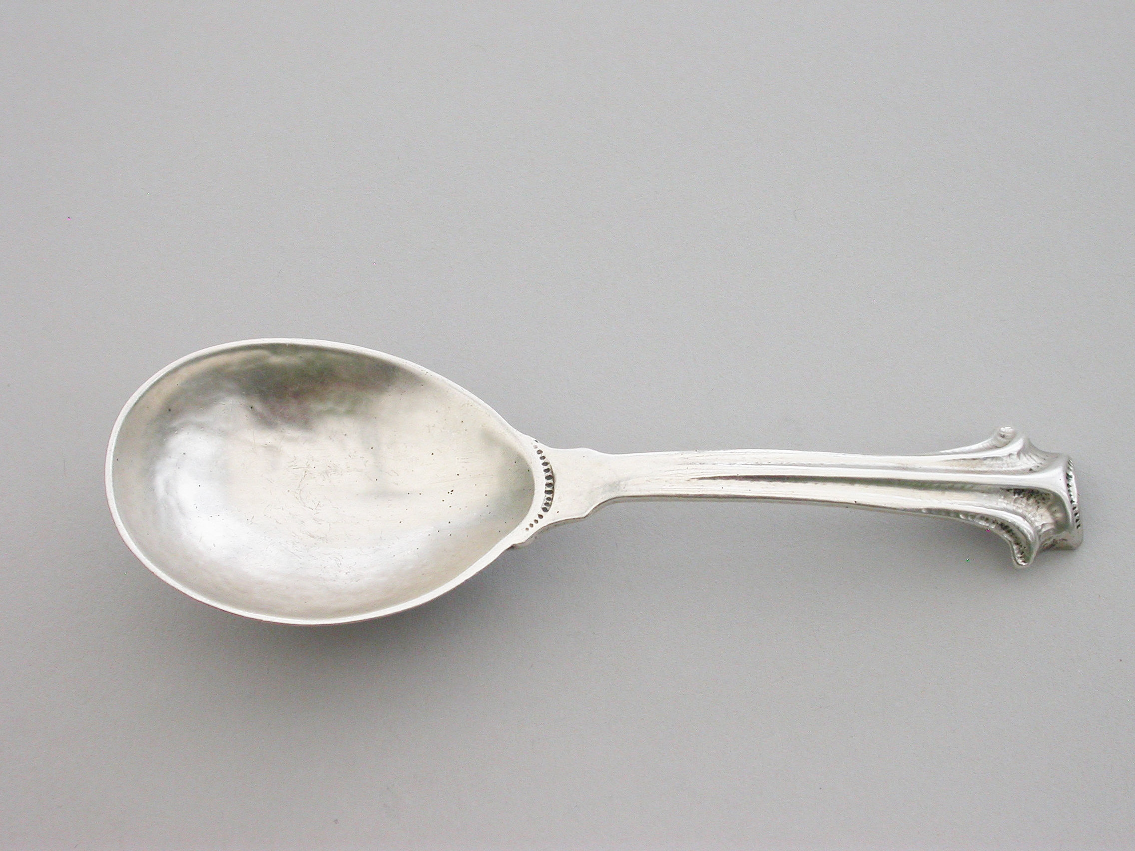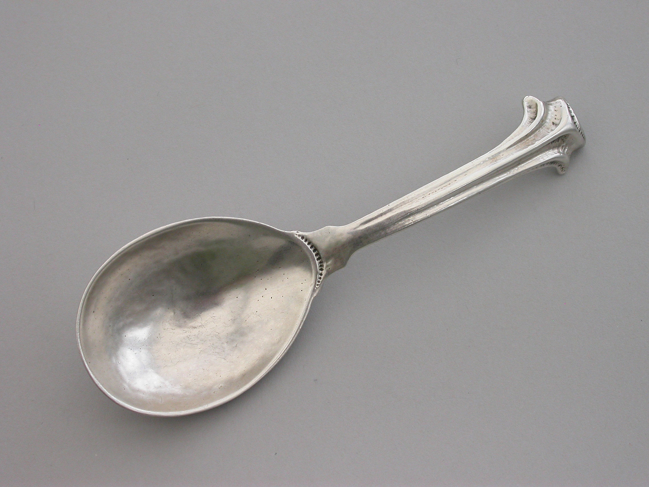 A rare and unusual Arts & Crafts hammered cast silver Caddy Spoon with reeded Onslow type handle and rat-tail bowl.