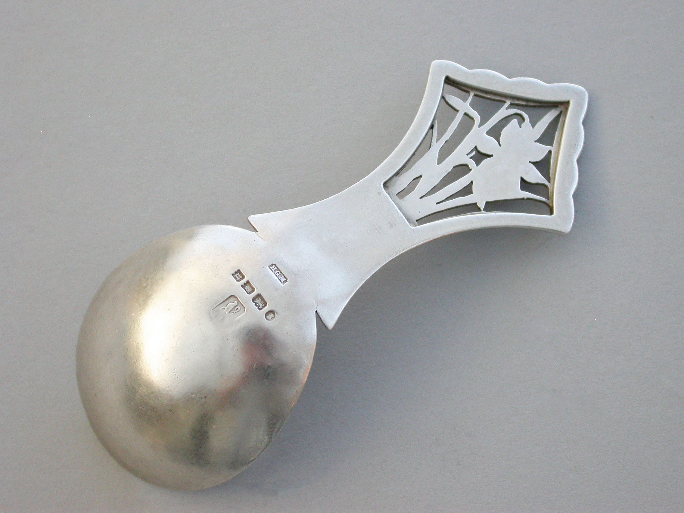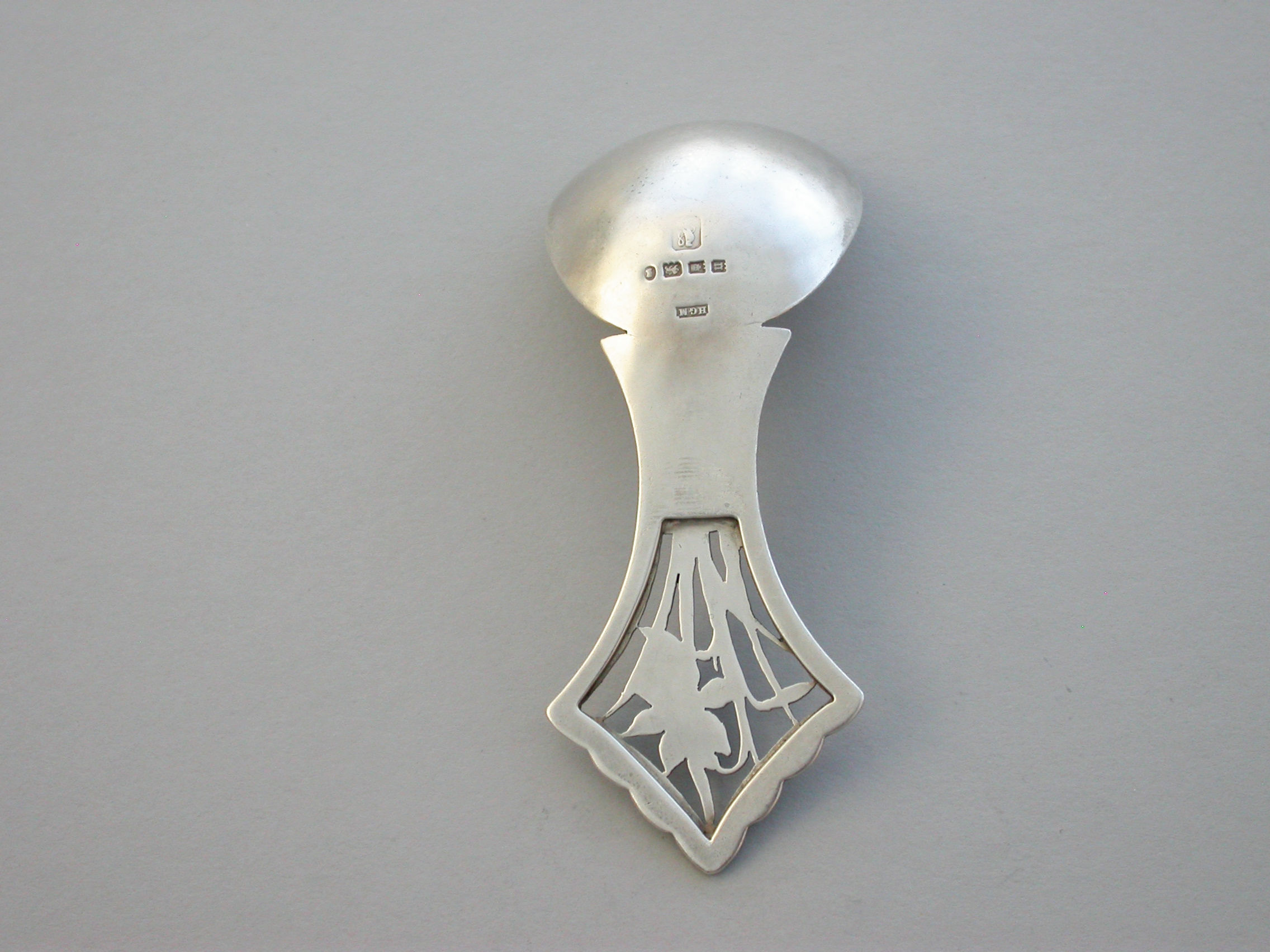 An extremely rare early 20th century Arts & Crafts silver Caddy Spoon, the angular handle pierced and engraved with daffodils. Very similar in design to the well known ""Tree of Life"" Caddy Spoon by the same maker.