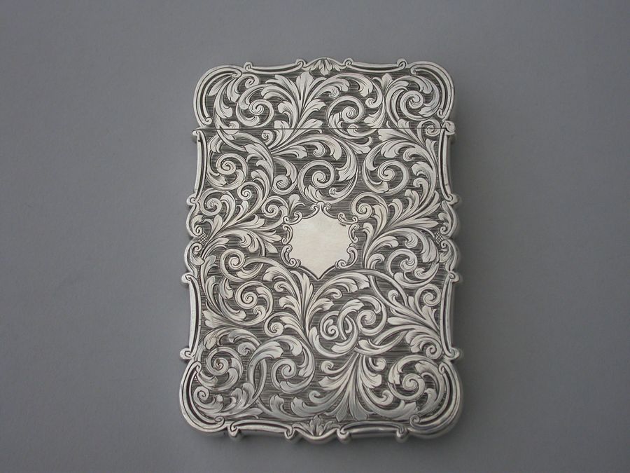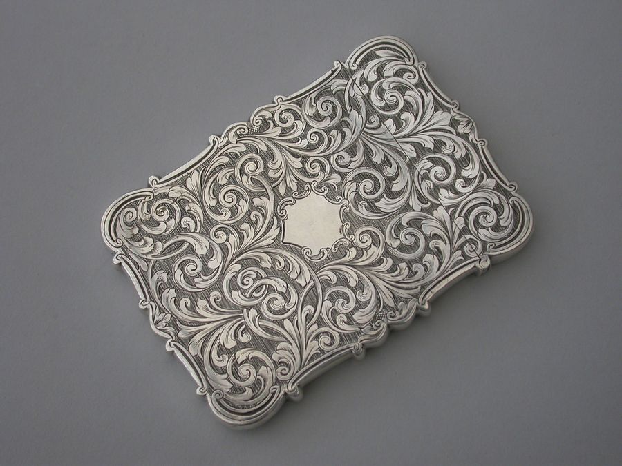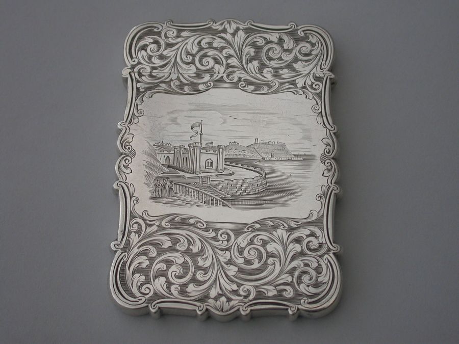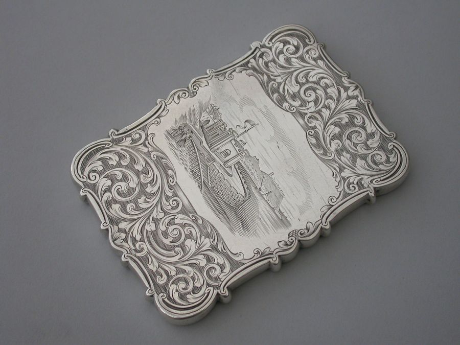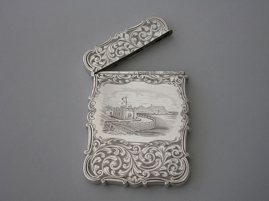 An extremely rare early Victorian silver "castle-top" Card Case of shaped rectangular form with foliate scroll engraved decoration on a matt background, the reverse with a vacant shield shaped cartouche, the front with a shaped panel engraved with a view of the Gothic Spa or Salon at Scarborough designed by Henry Wyatt and opened in 1839.