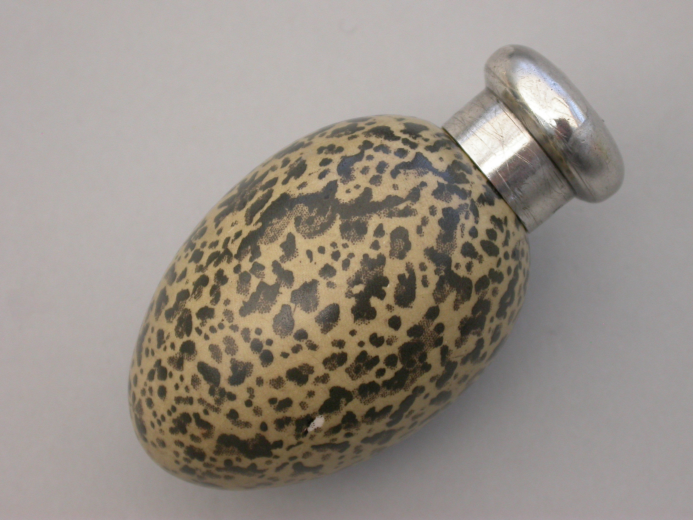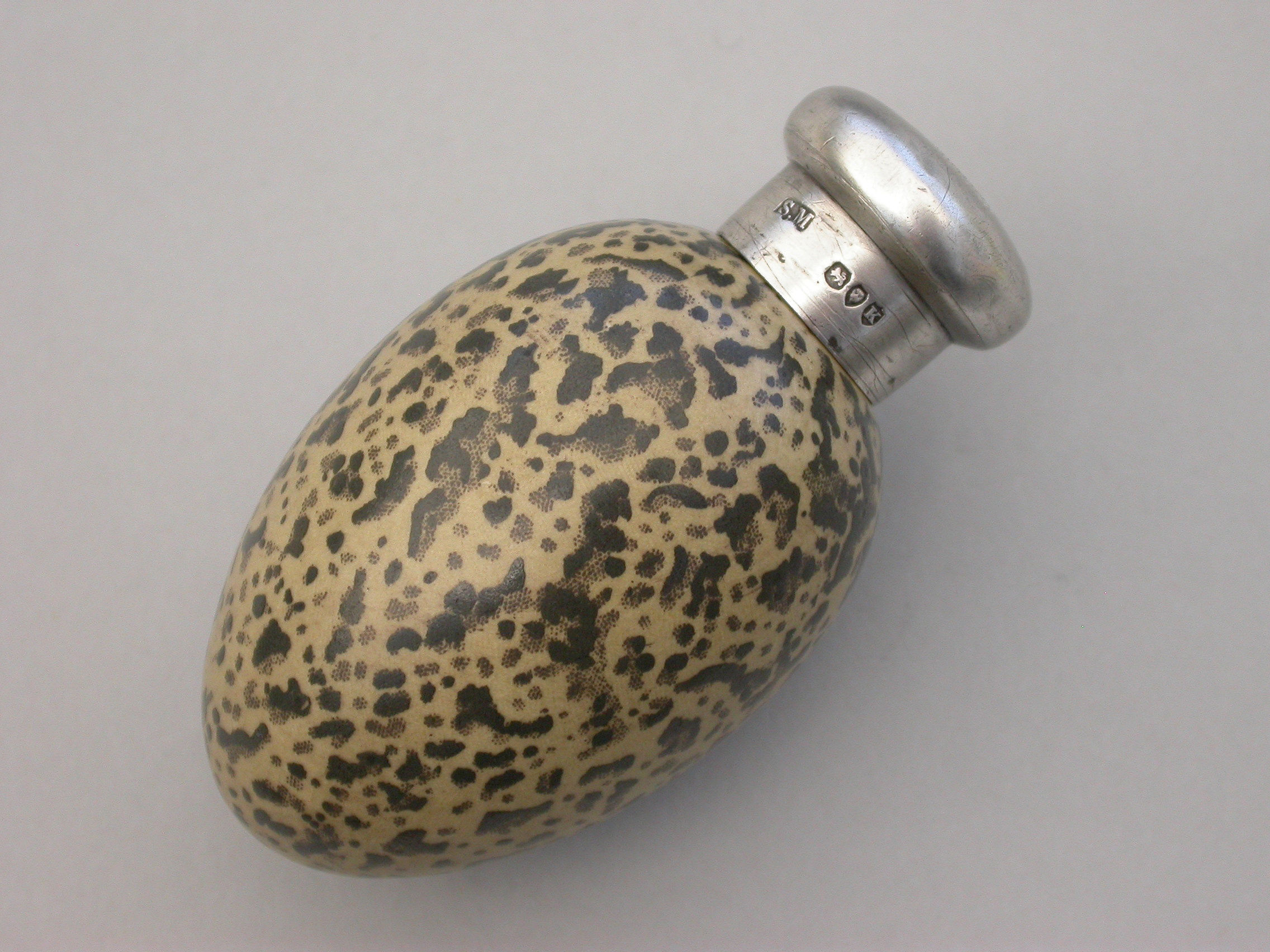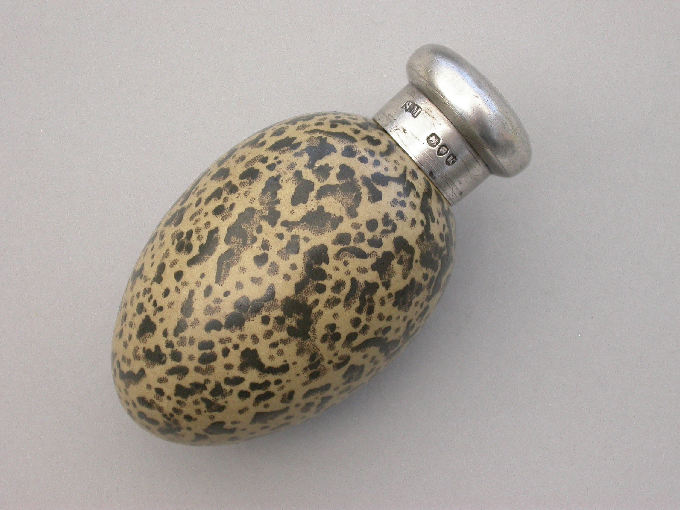 A good Victorian novelty silver and MacIntyre ceramic Scent Bottle made in the form of a Magpies egg with screw-off top.