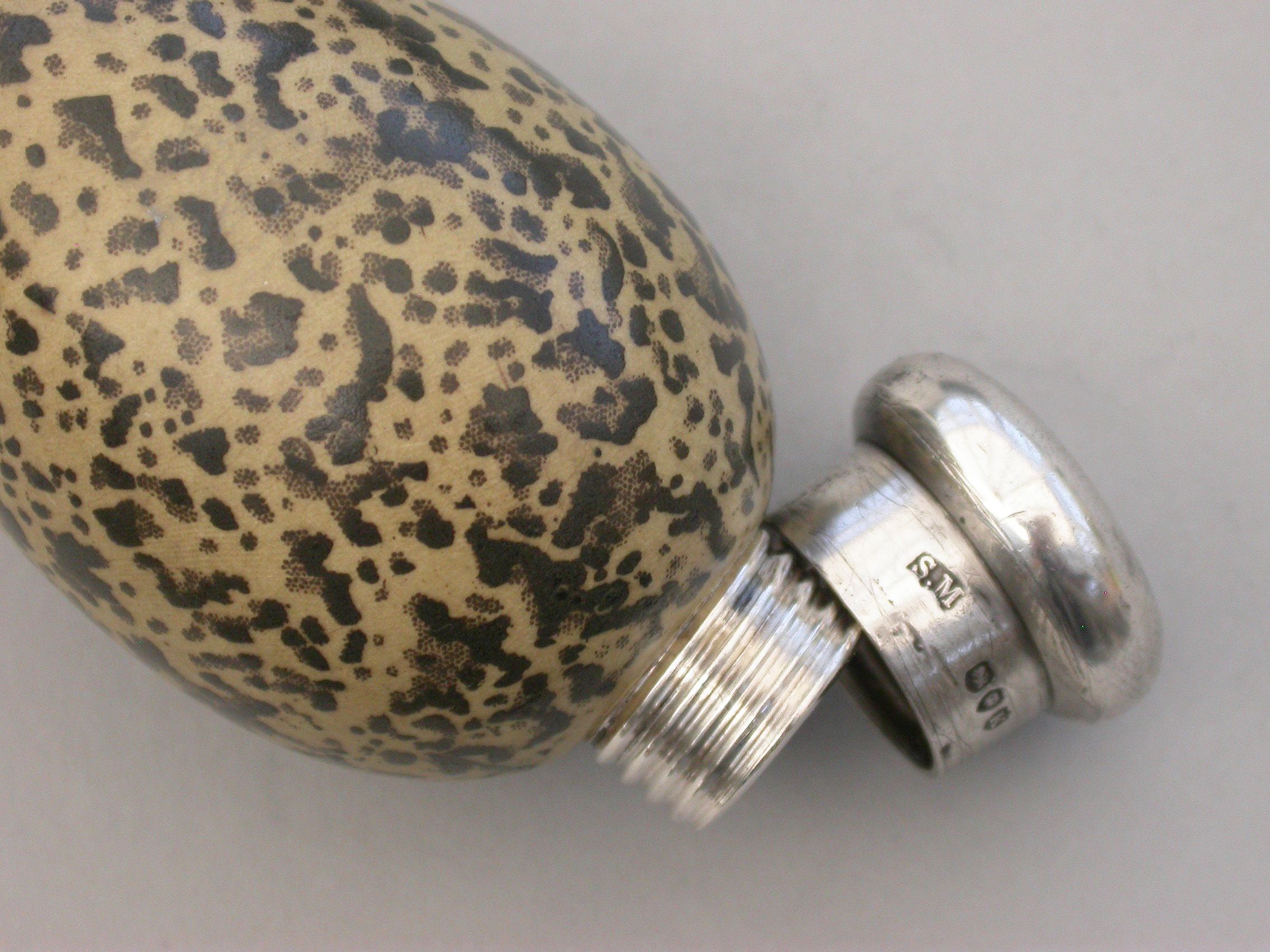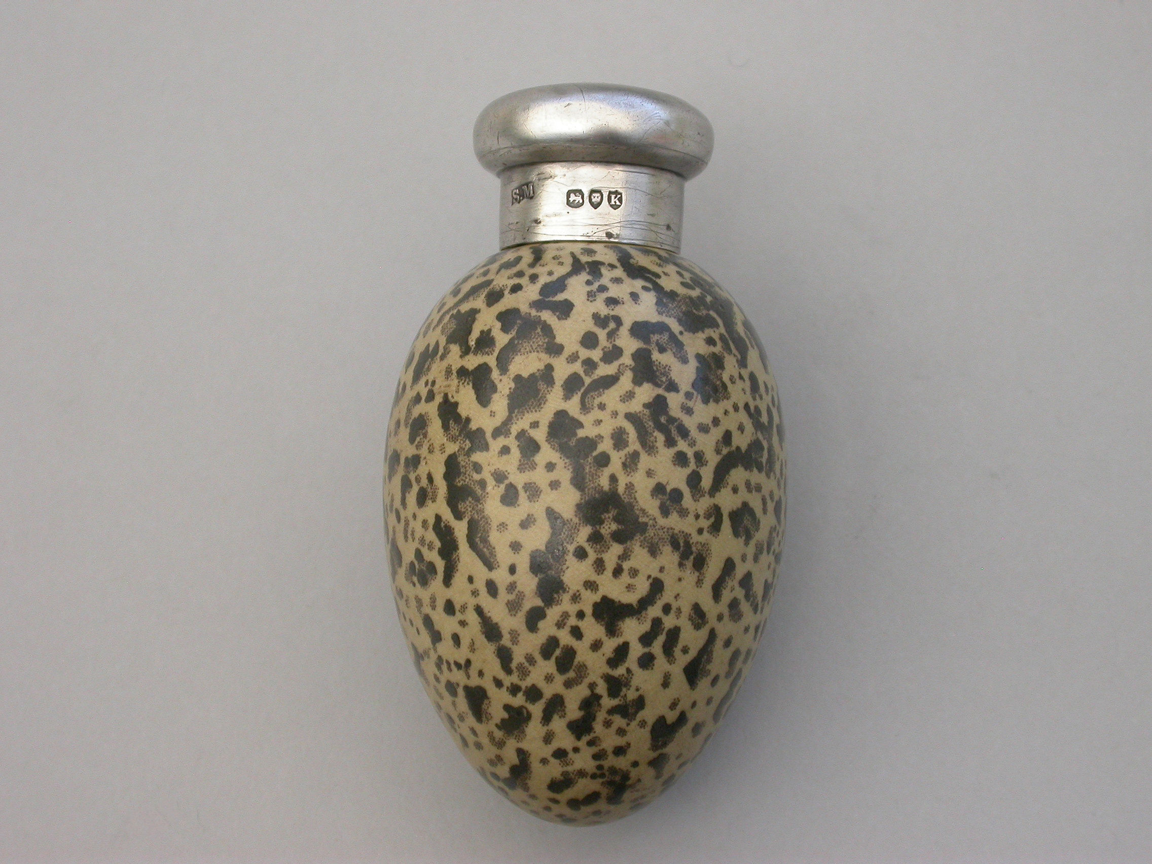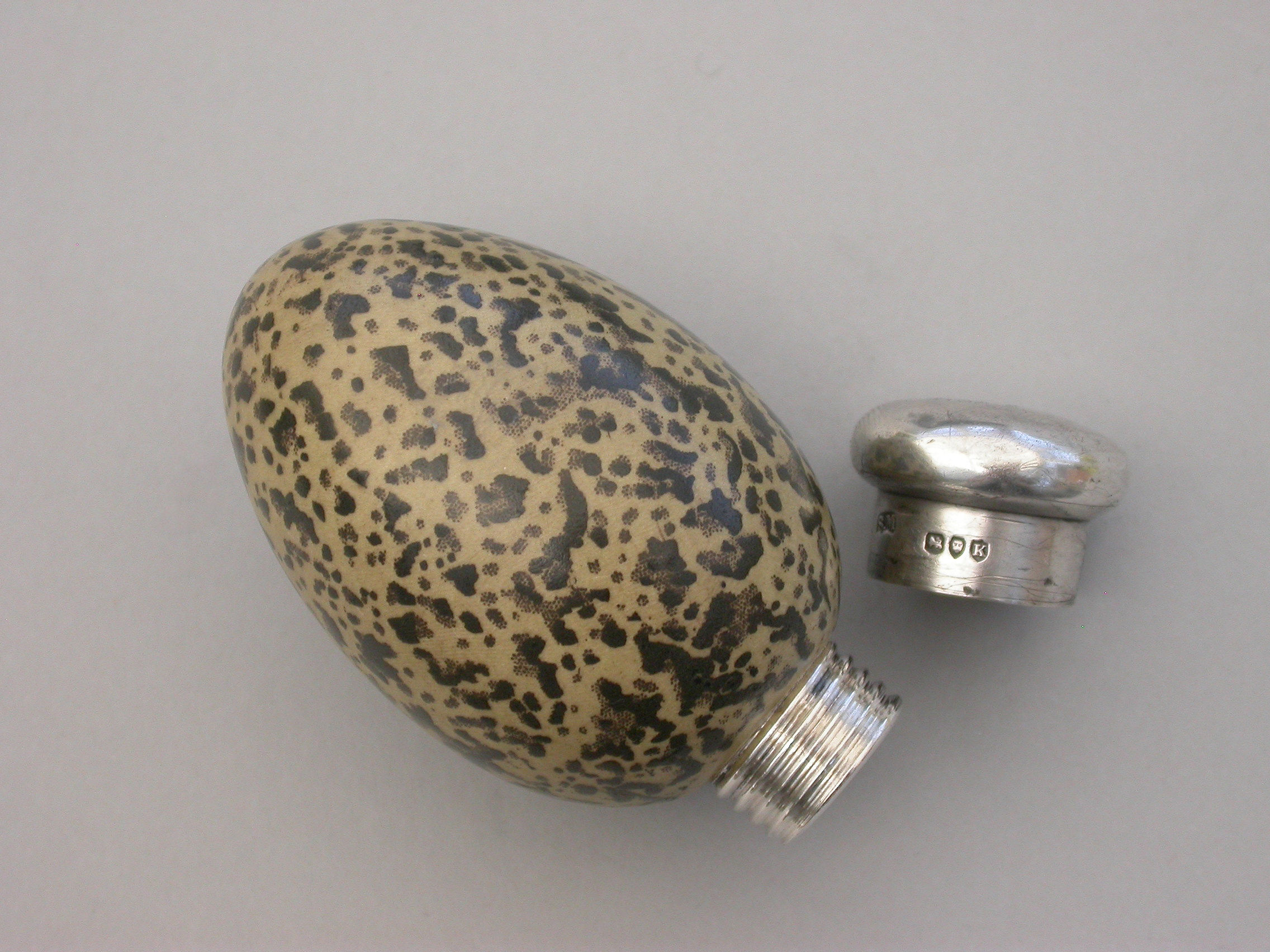 A good Victorian novelty silver and MacIntyre ceramic Scent Bottle made in the form of a Magpies egg with screw-off top.