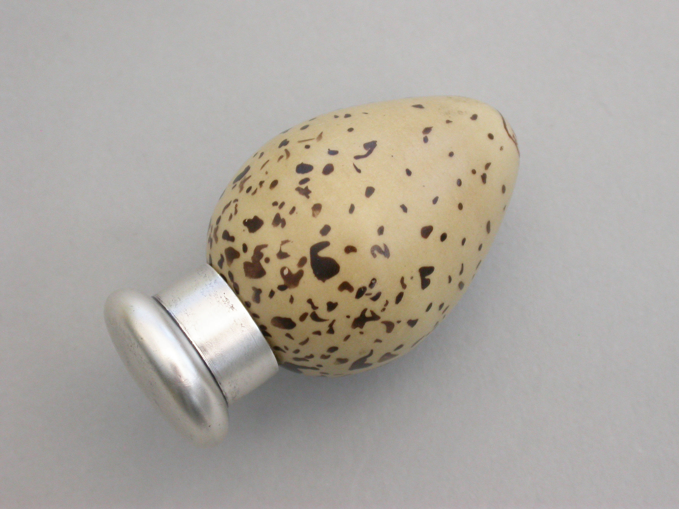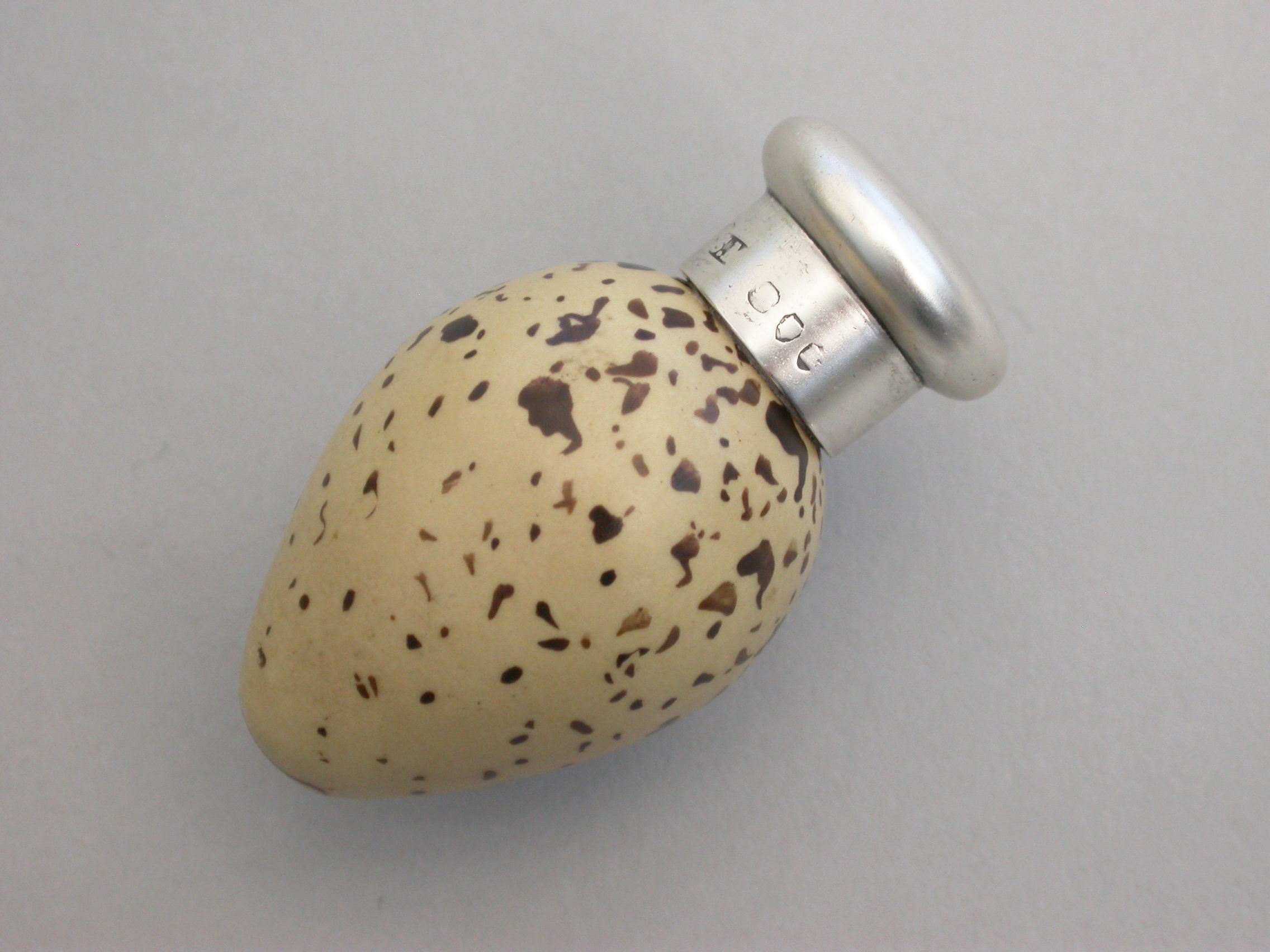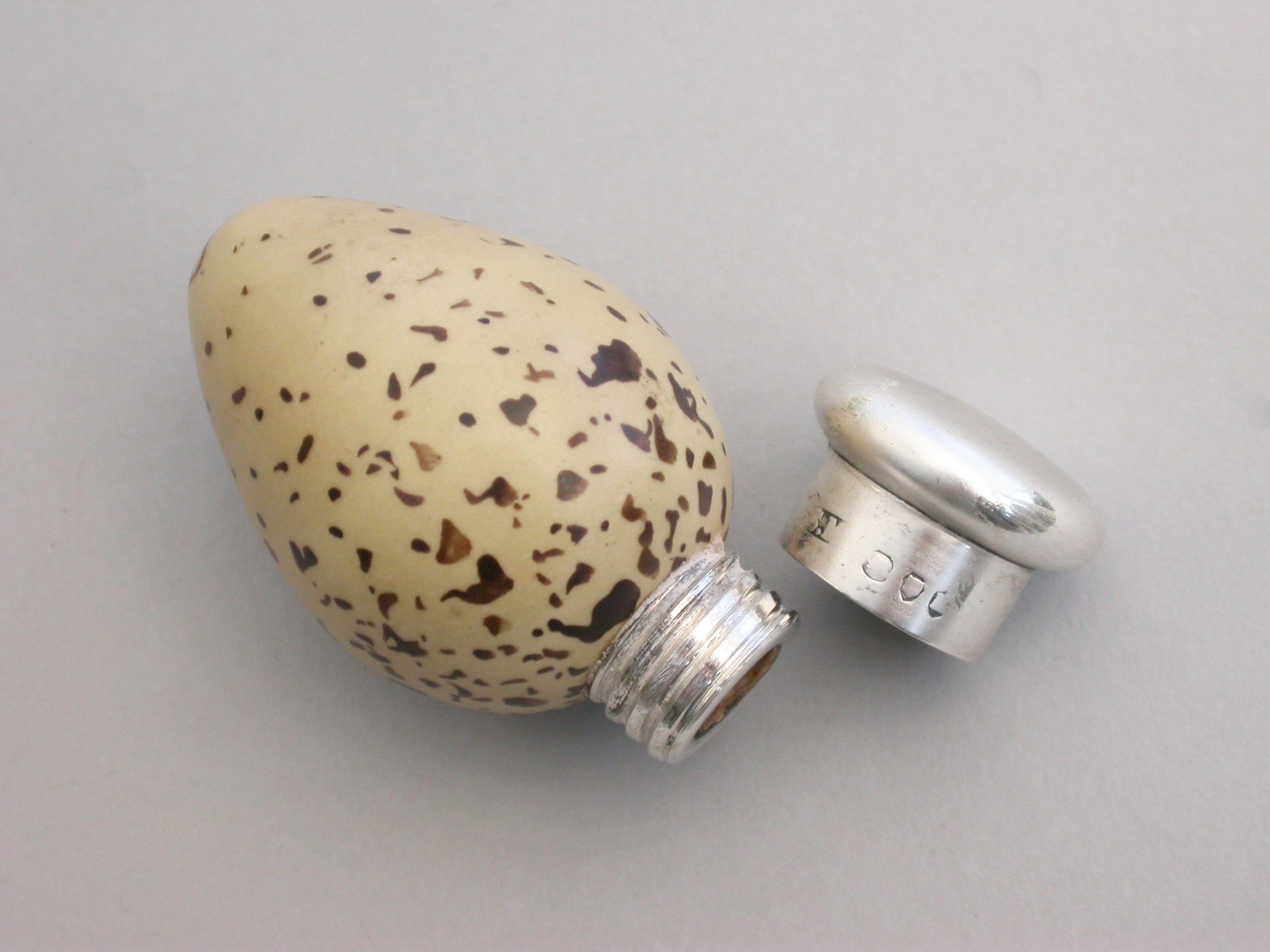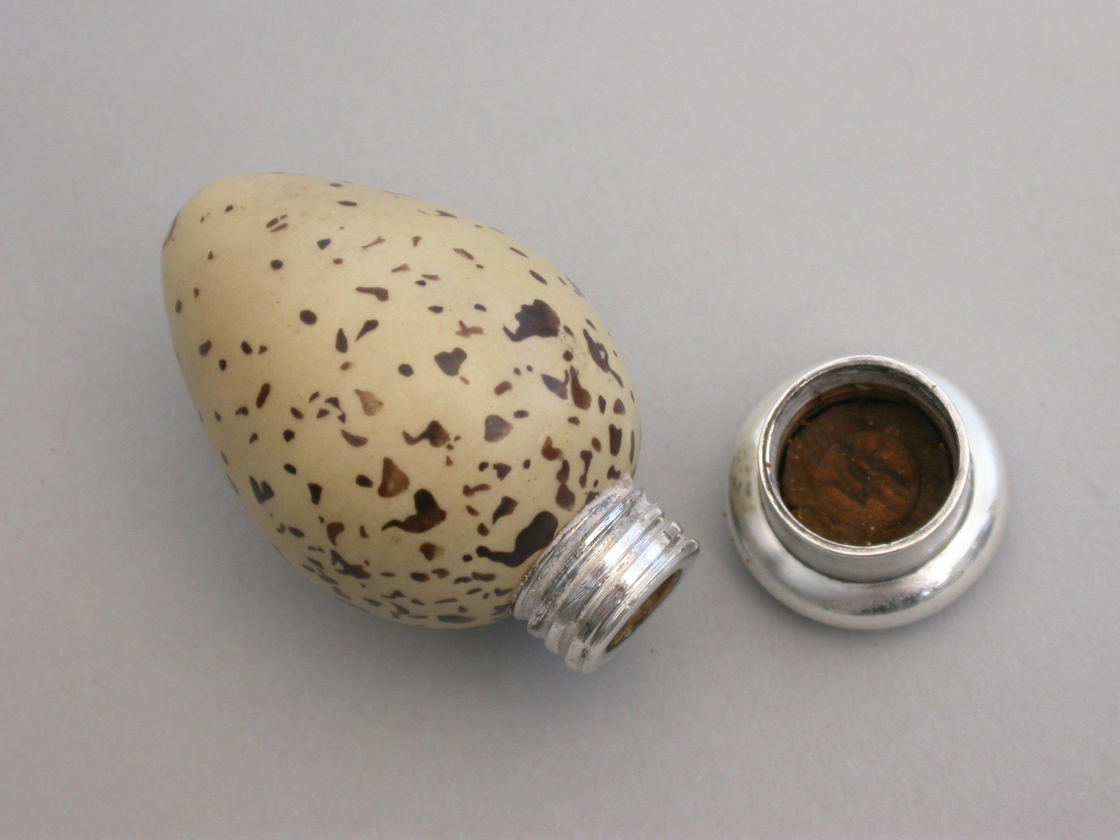 A good Victorian novelty silver and MacIntyre ceramic Scent Bottle made in the form of a Common Terns egg with screw-off top.