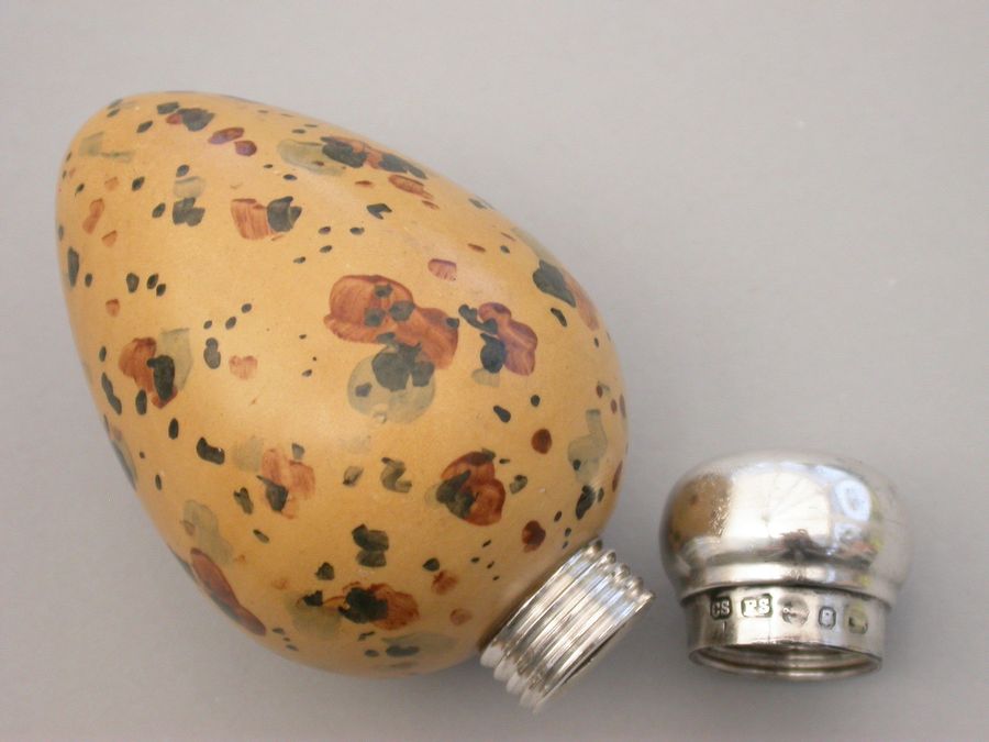 A good Victorian novelty silver and MacIntyre ceramic Scent Bottle made in the form of a Great Black Backed Gulls egg with screw-off top.