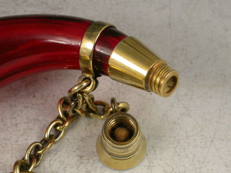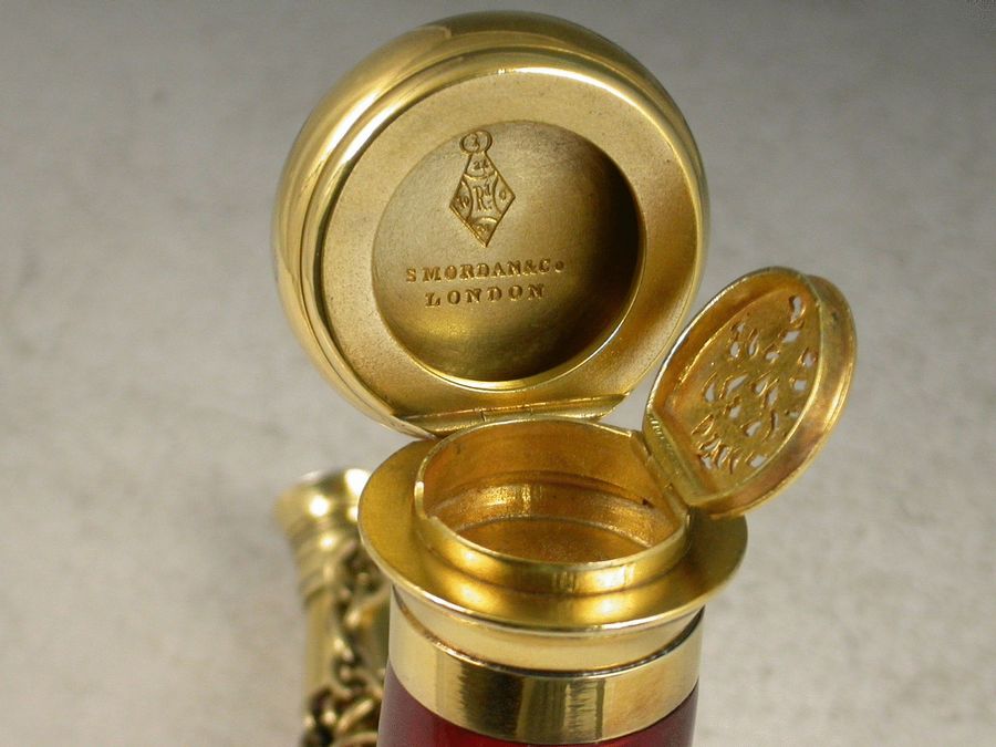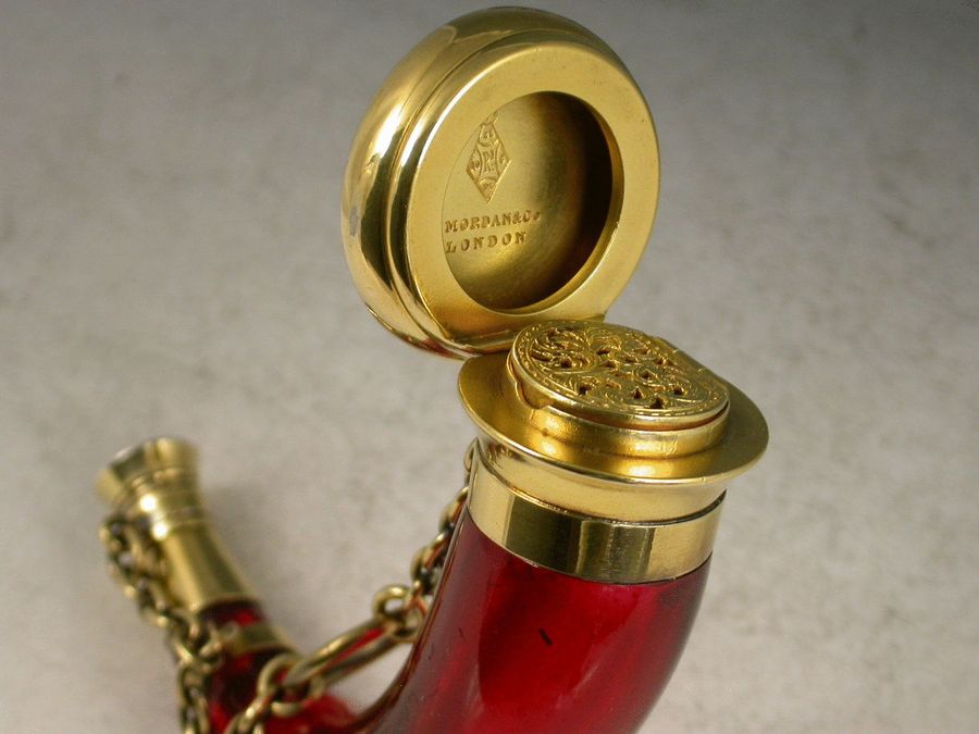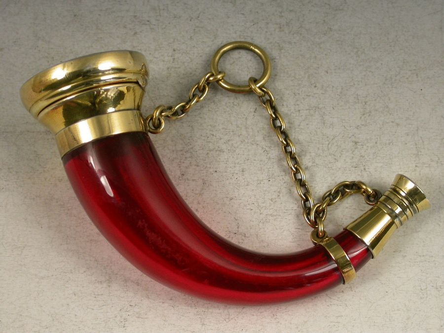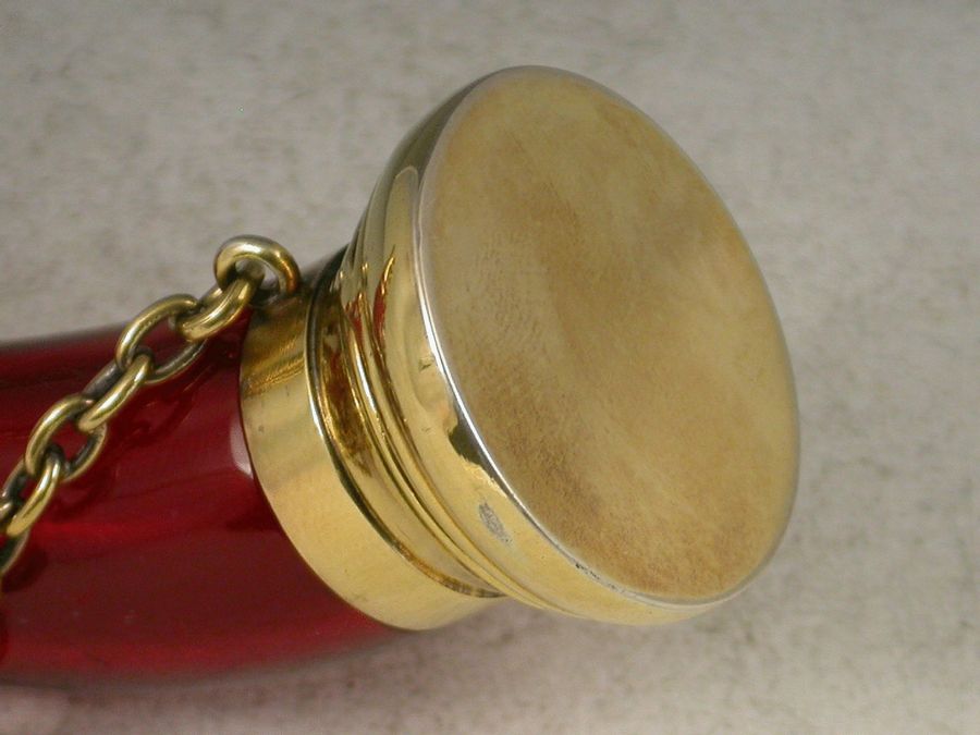 A very fine Victorian silver gilt mounted ruby glass Scent Bottle / Vinaigrette, in the form of a horn, with attached suspension chain and ring. The plain circular silver gilt hinged lid opening to reveal a finely pierced hinged grille and Diamond registration mark to the interior lid. The narrow scent bottle end with screw off lid and cork stopper.