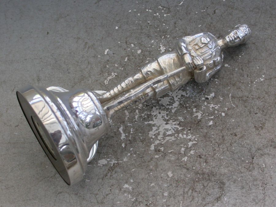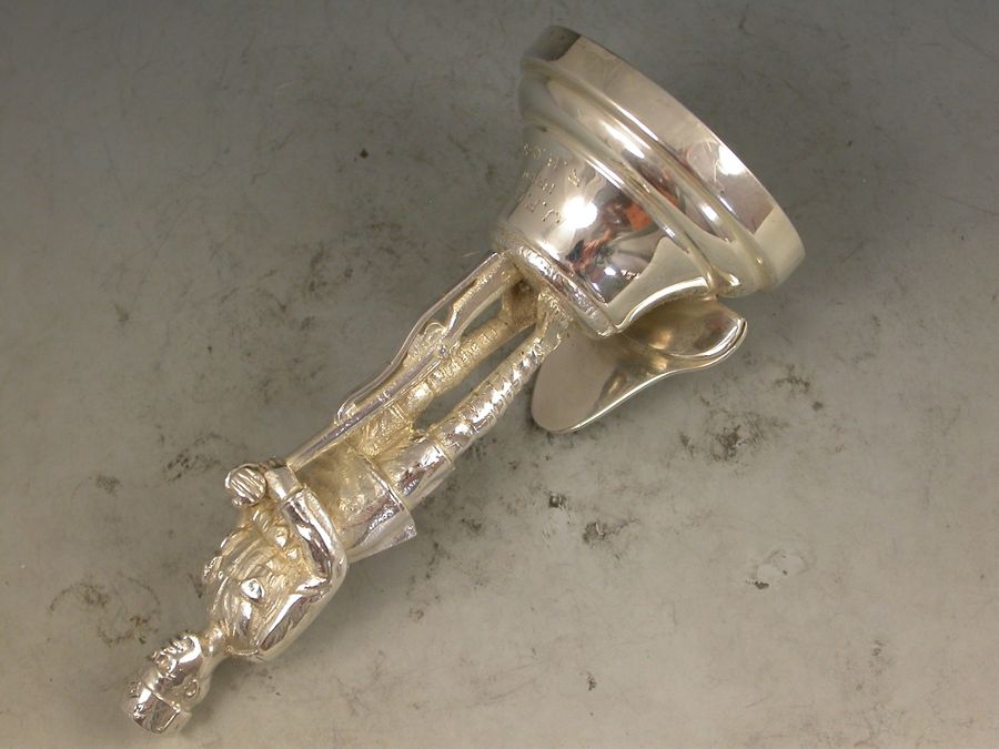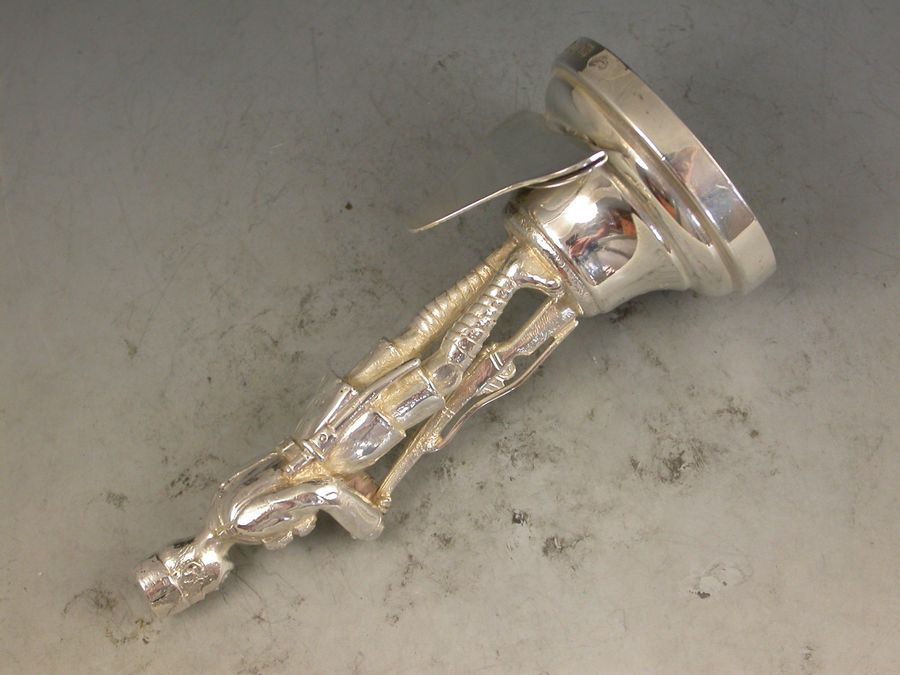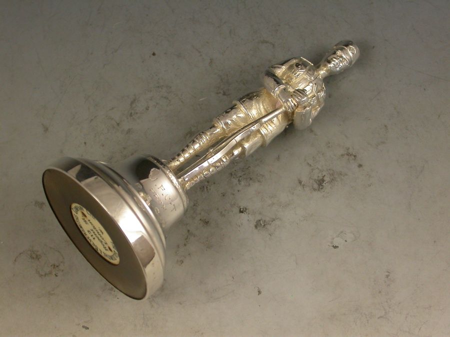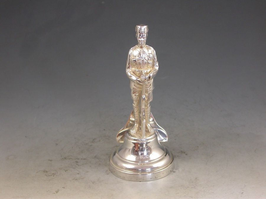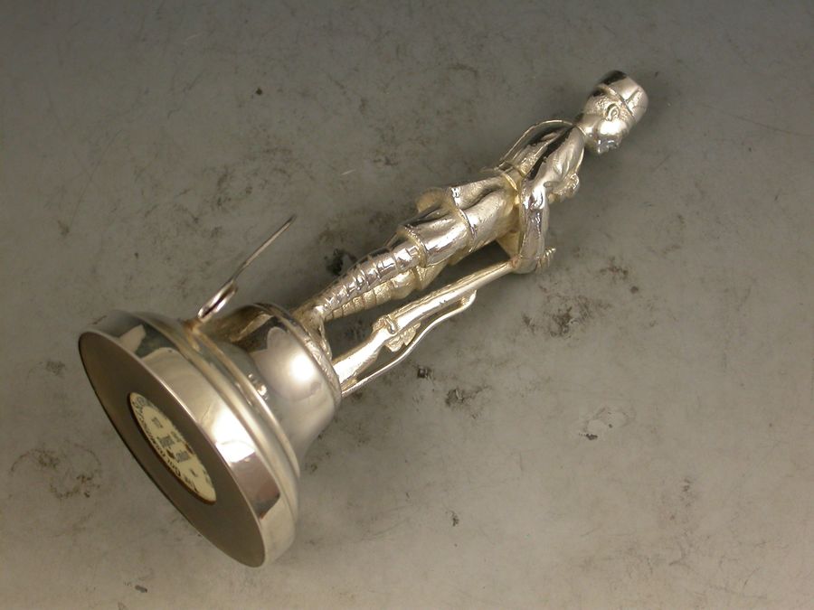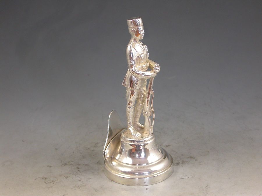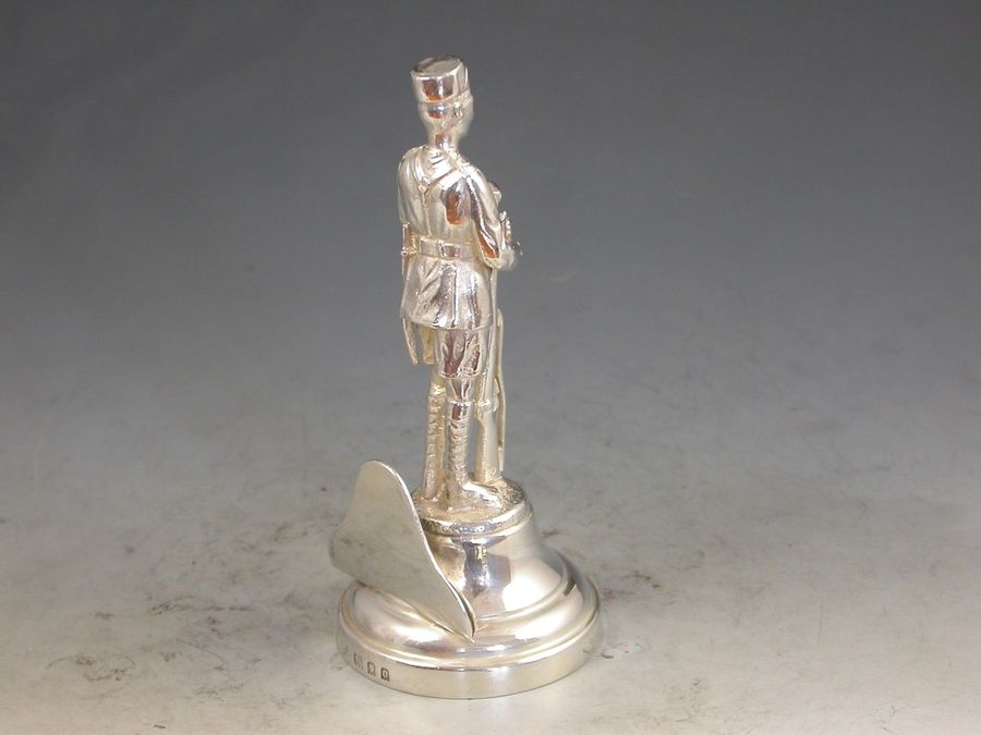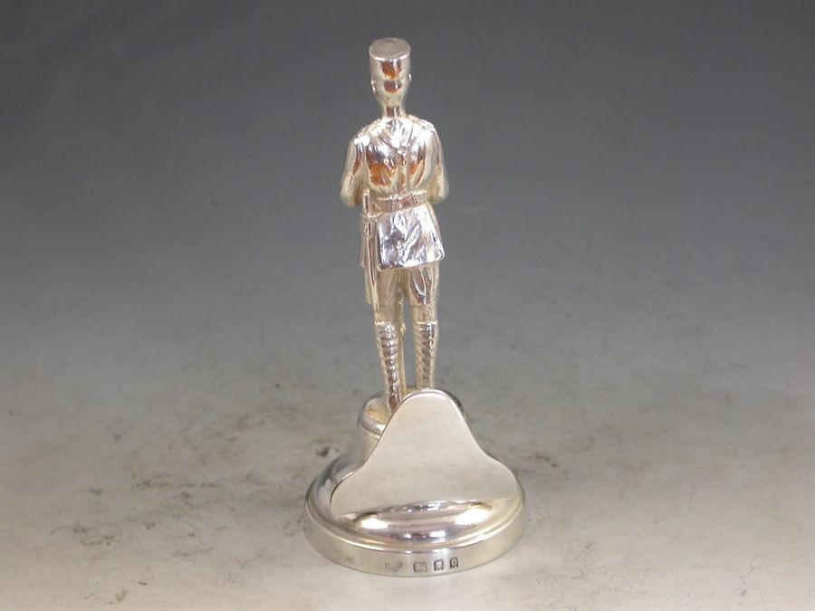 A very fine quality early 20th century cast silver Menu Holder made in the form of a Gurkha Soldier standing on a circular pedestal base.