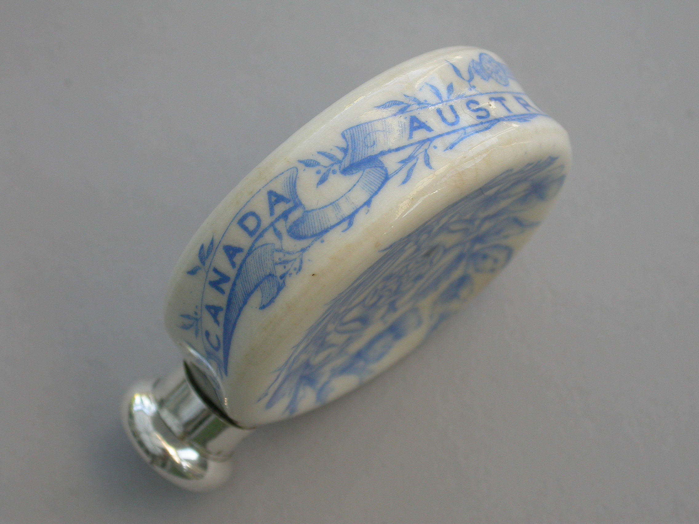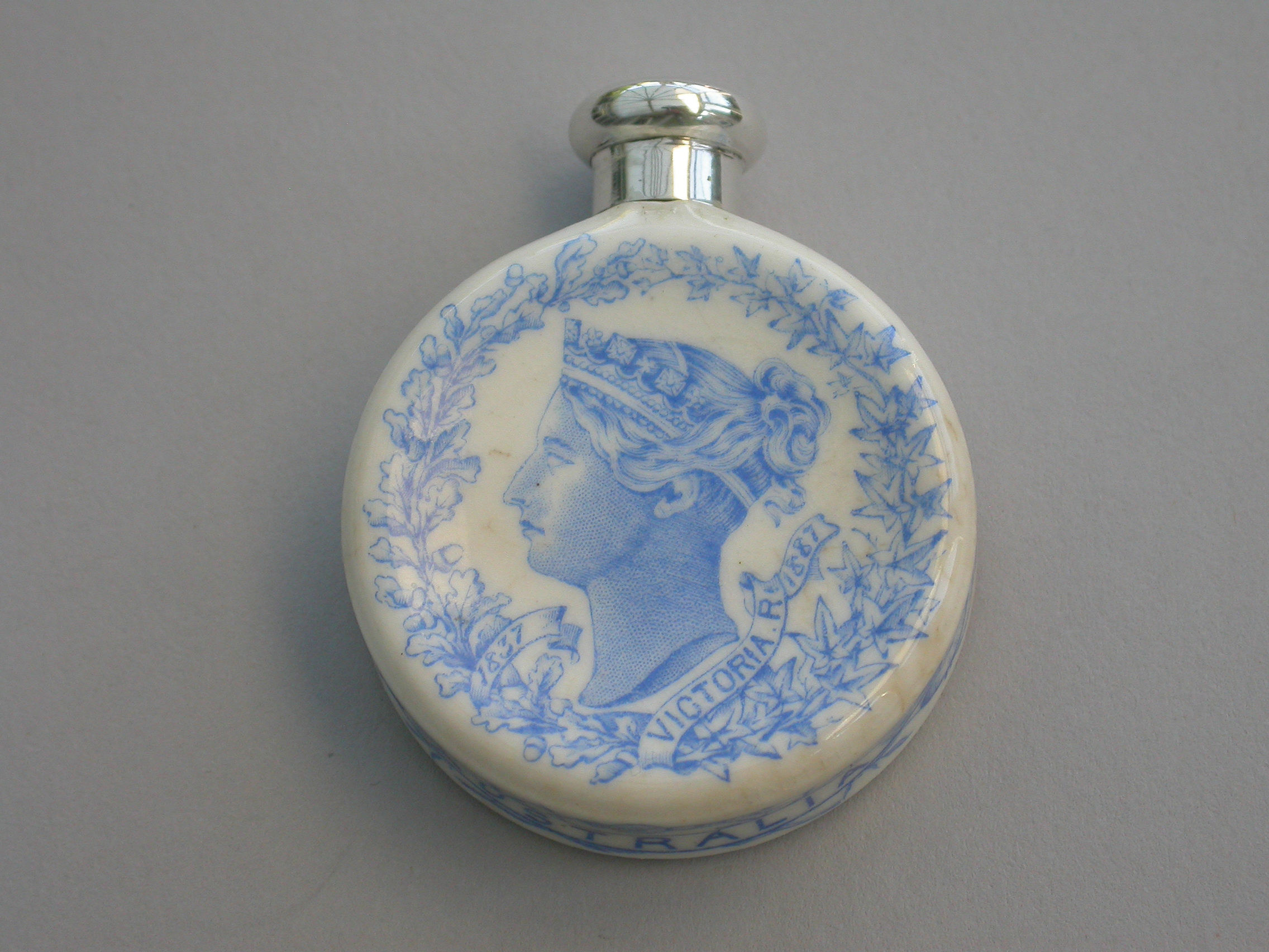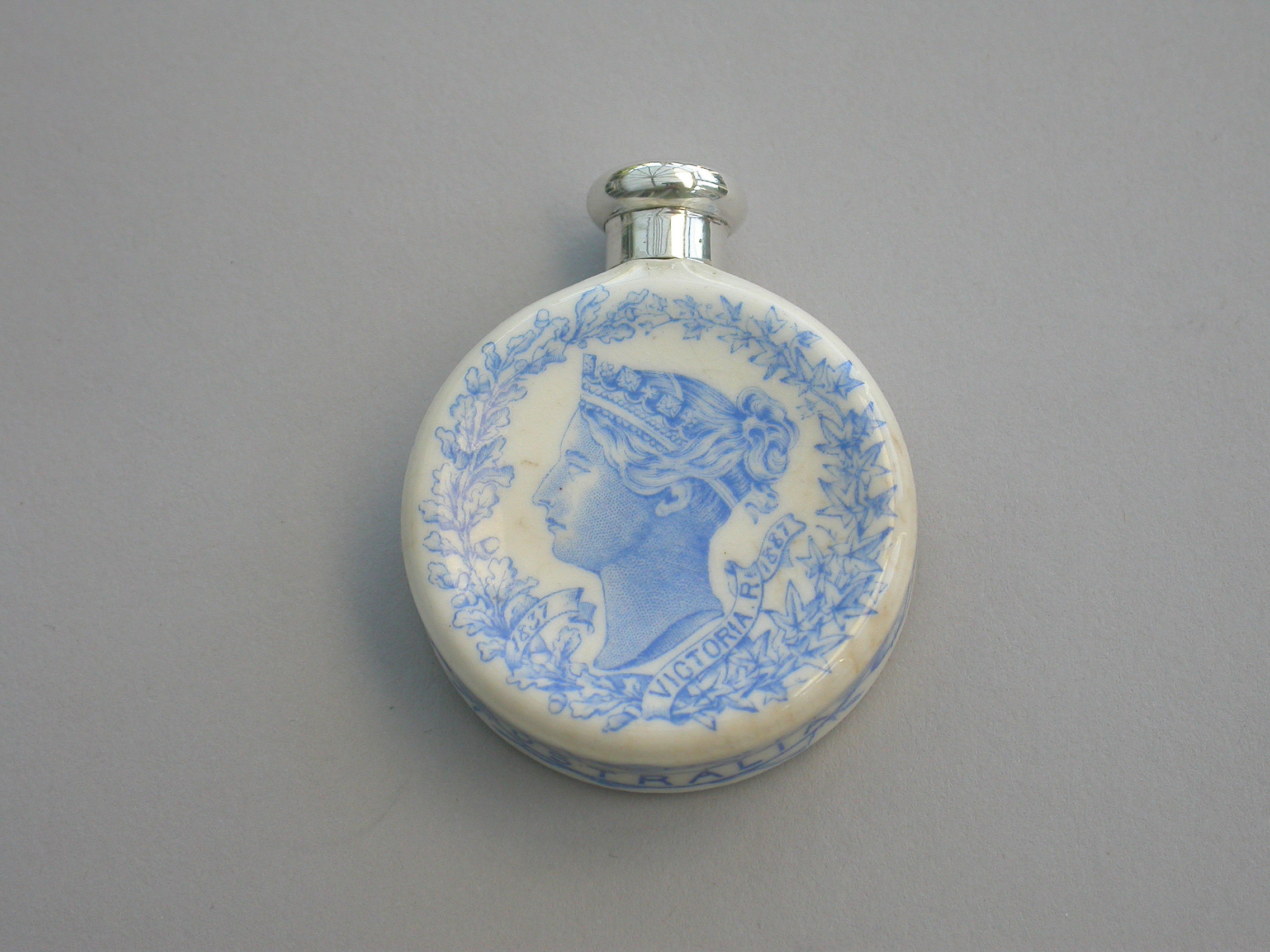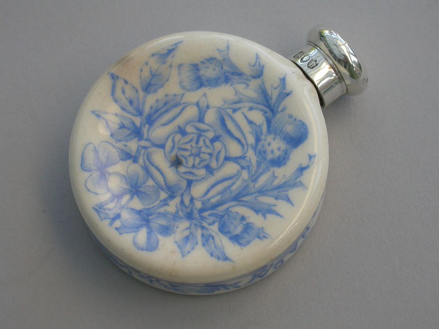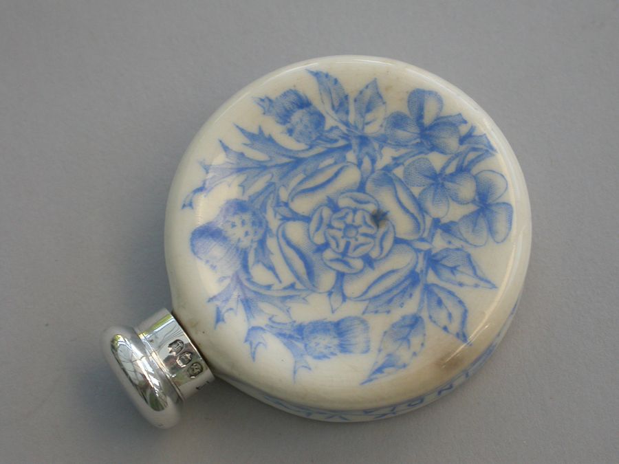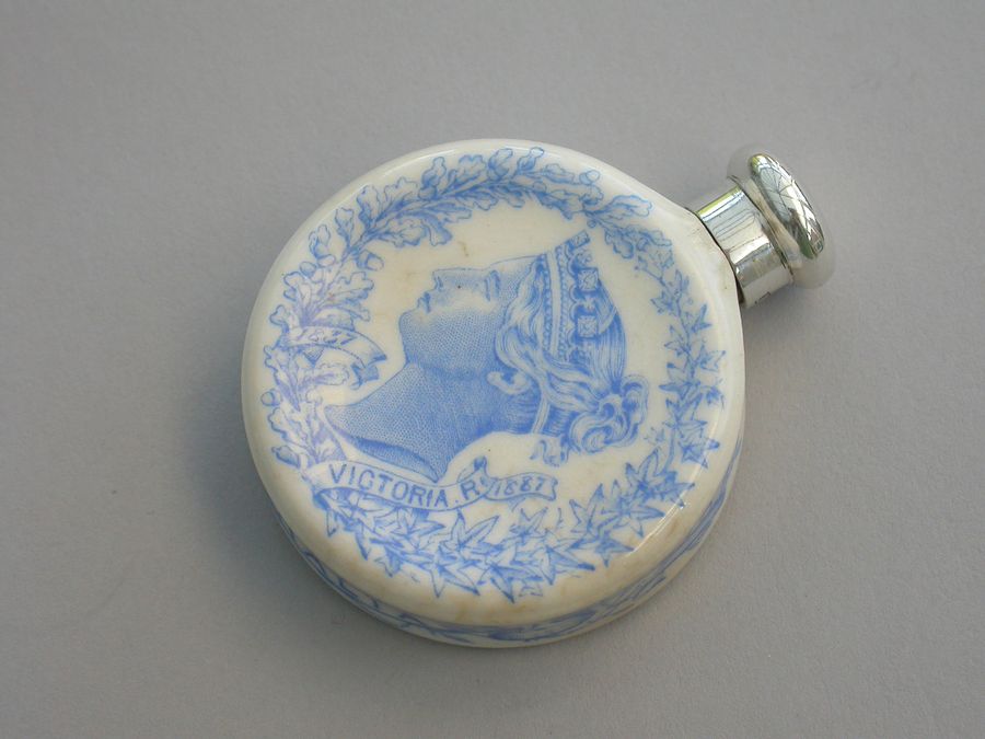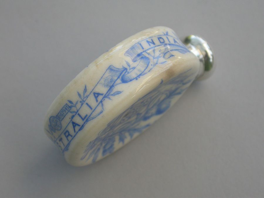 A rare Victorian silver mounted Royal Worcester Porcelain Scent Bottle, made to celebrate Queen Victoria's Golden Jubilee in 1887. The blue and white transfer printed porcelain bottle features Victoria's portrait to the front and the English Rose, Scottish Thistle and Irish Shamrock to the back. The names of the colonies Canada, Australia and India are printed around the sides.