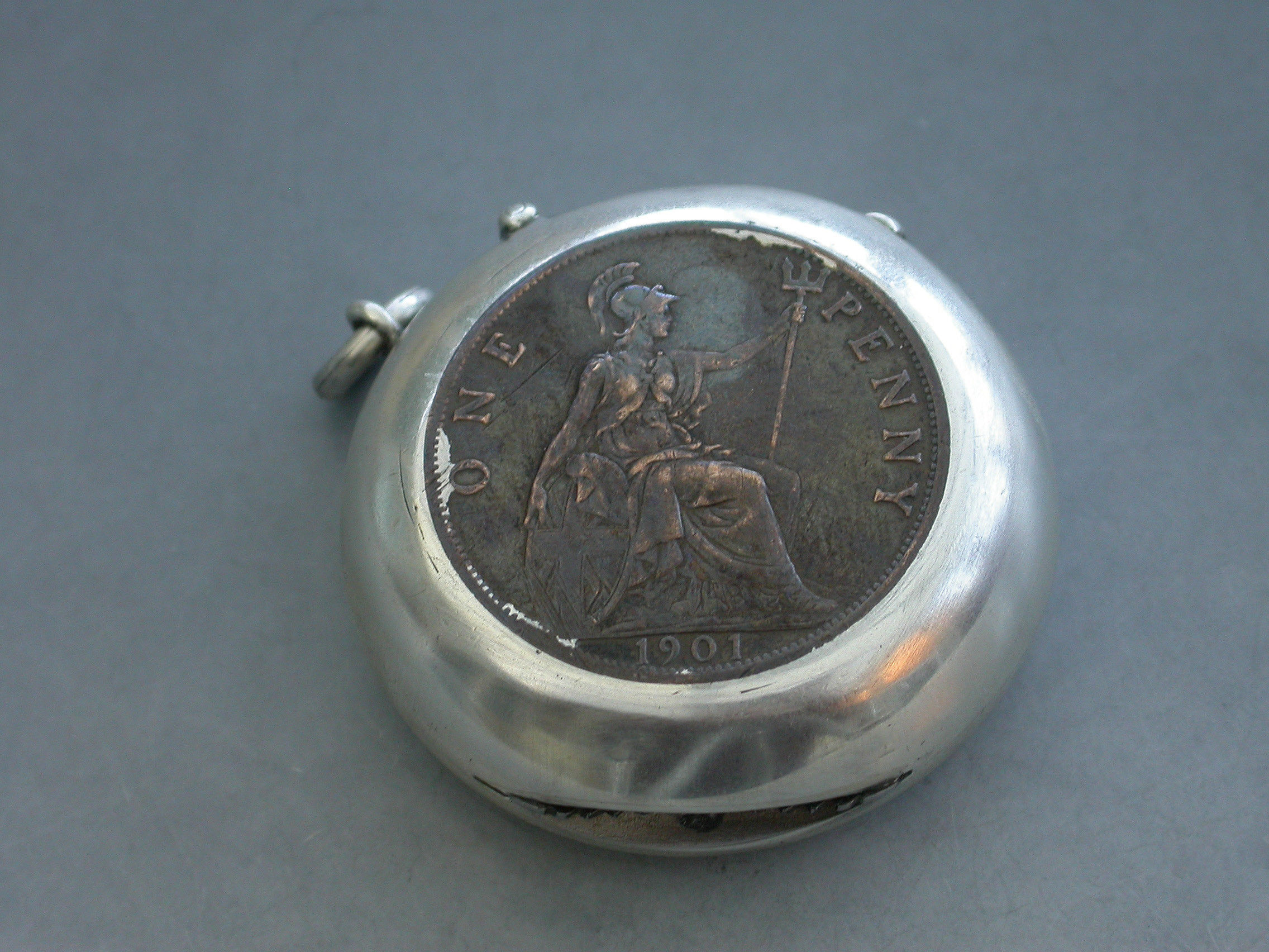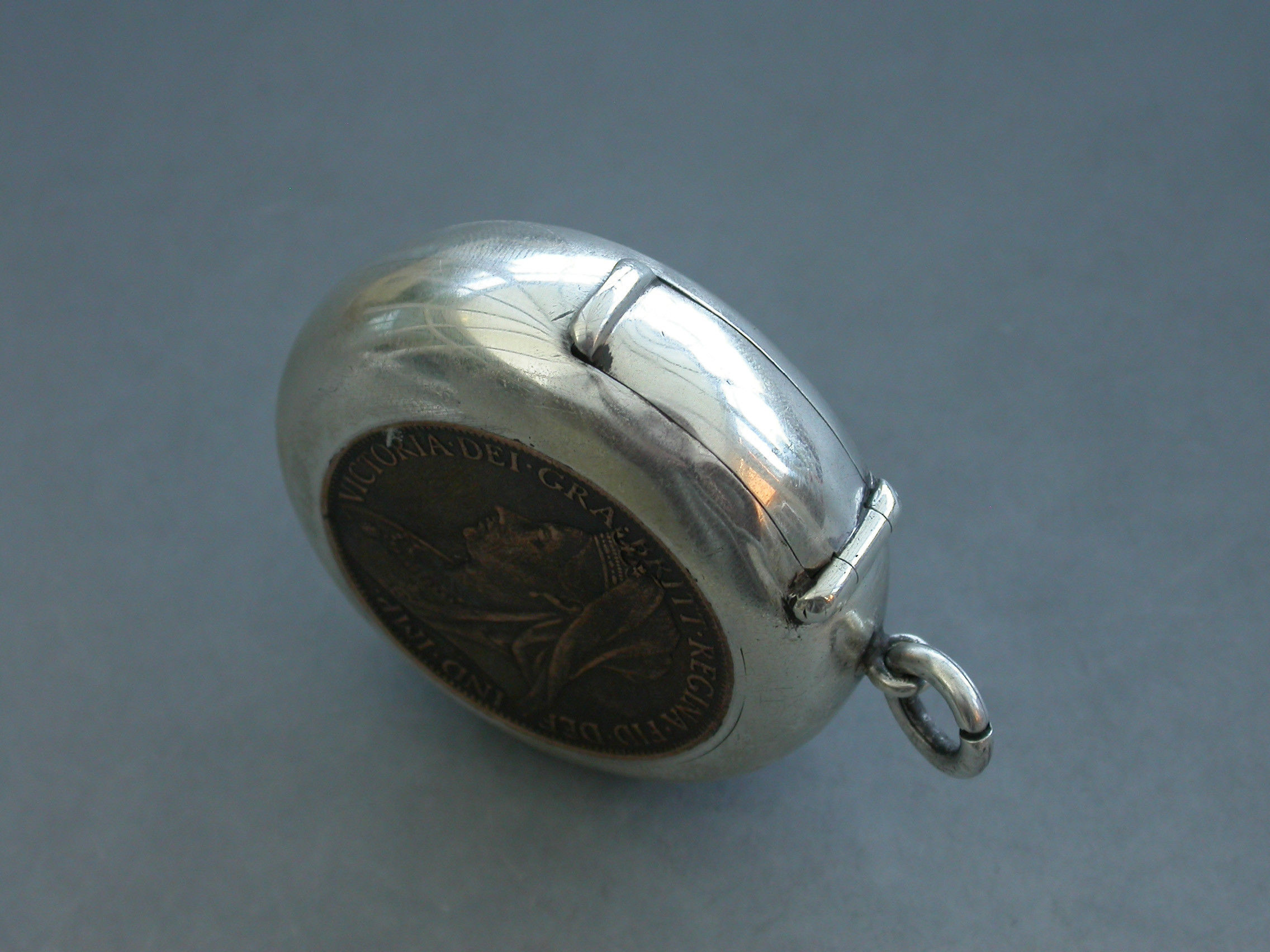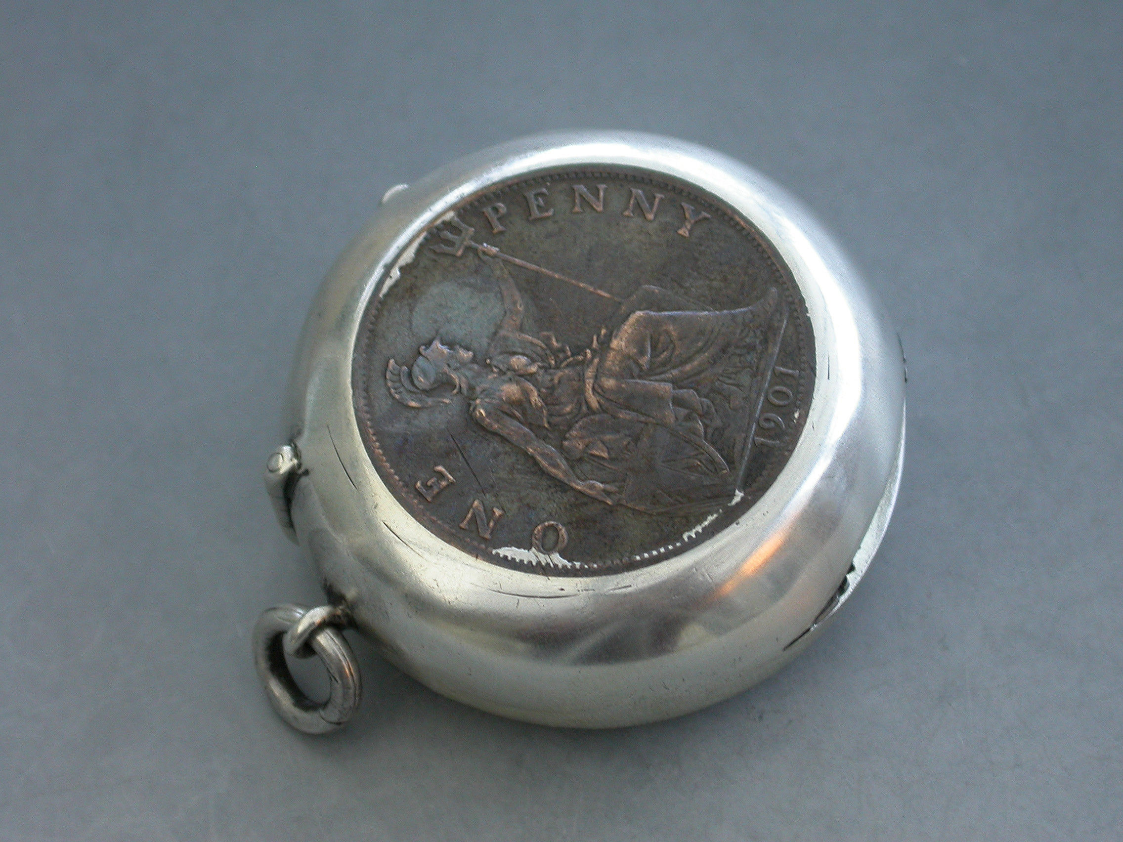 An early 20th century circular silver mounted Vesta Case formed from a Victorian copper penny cut in to two. With hinged lid and attached suspension ring.