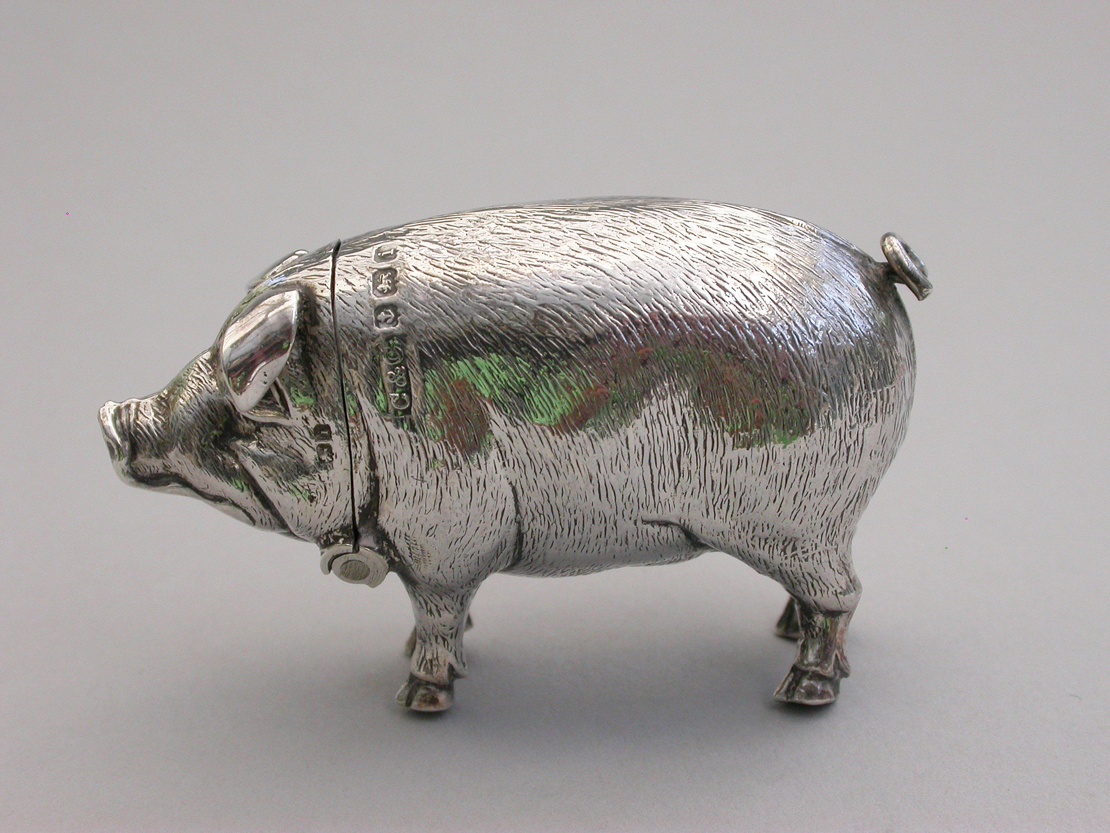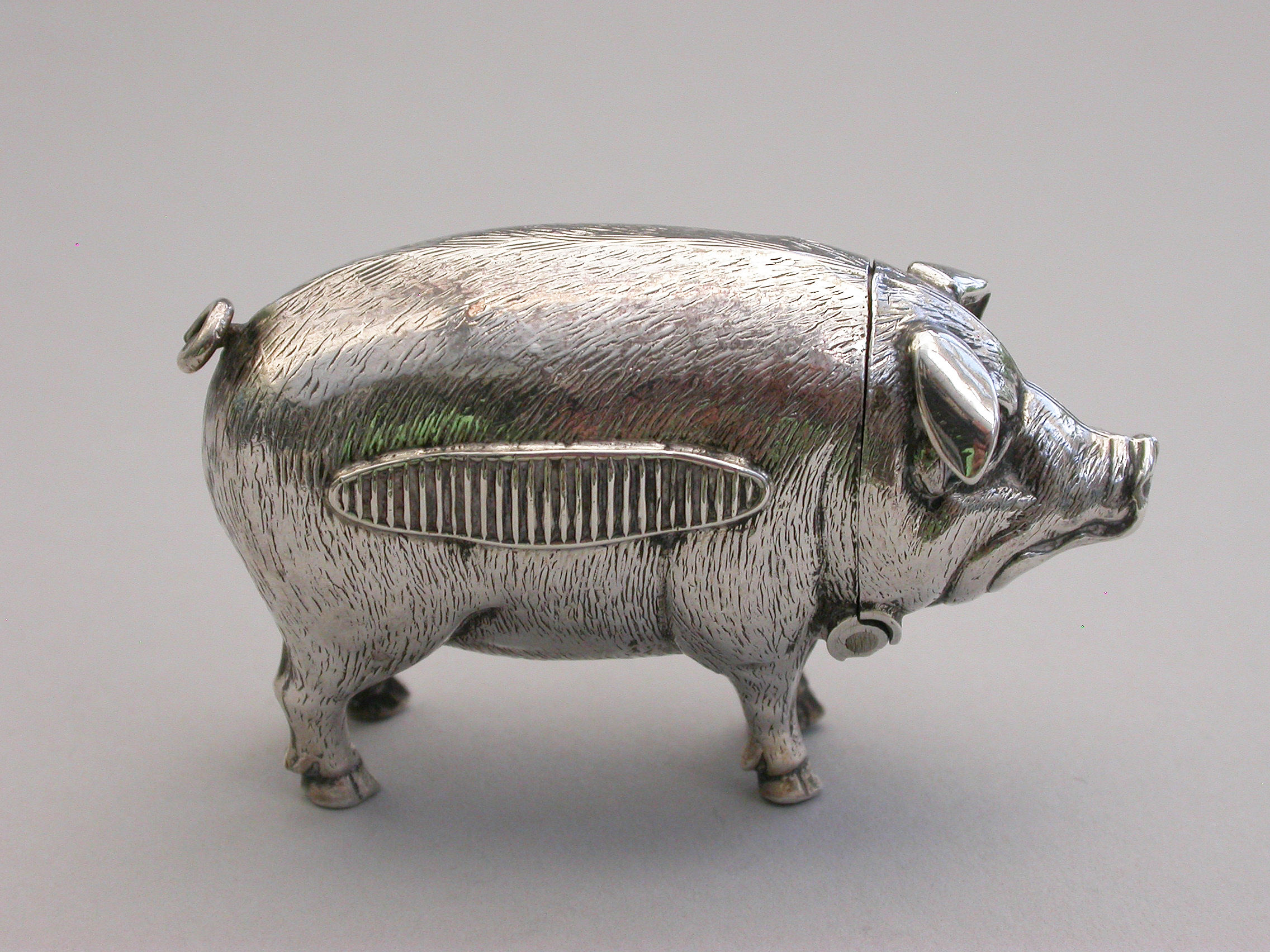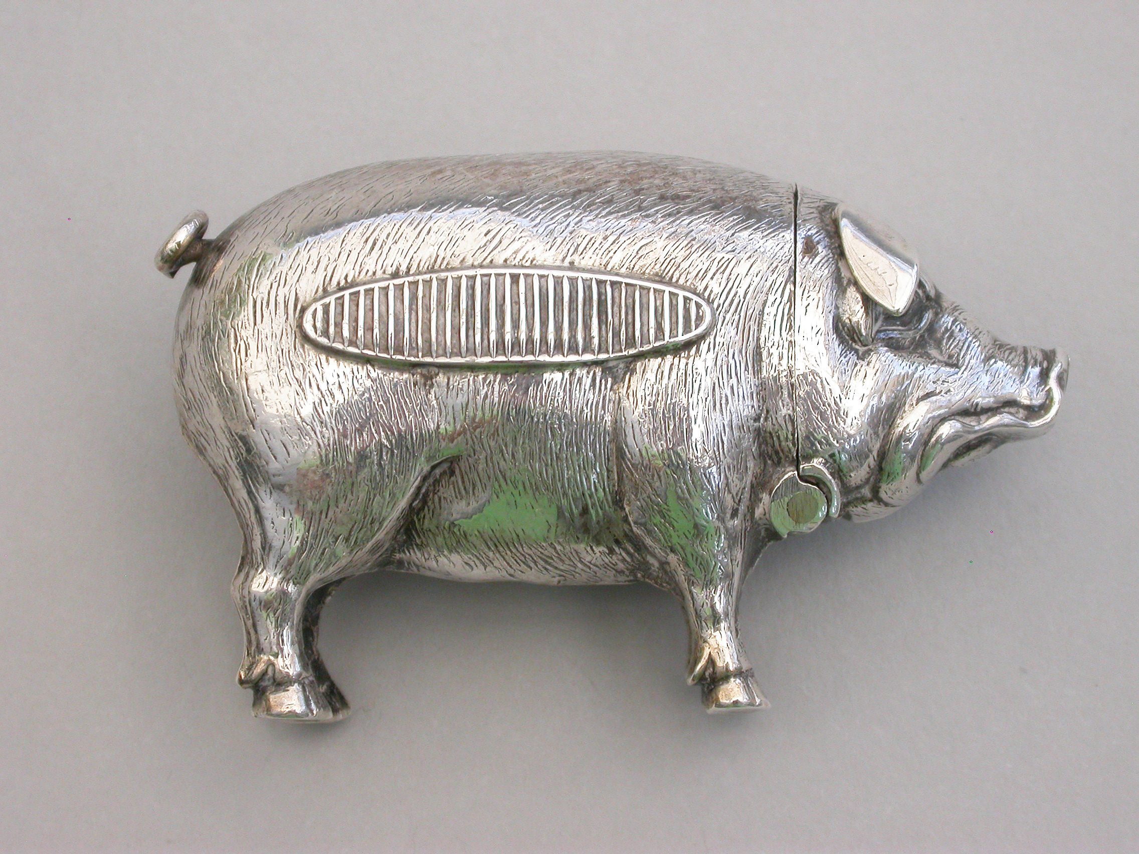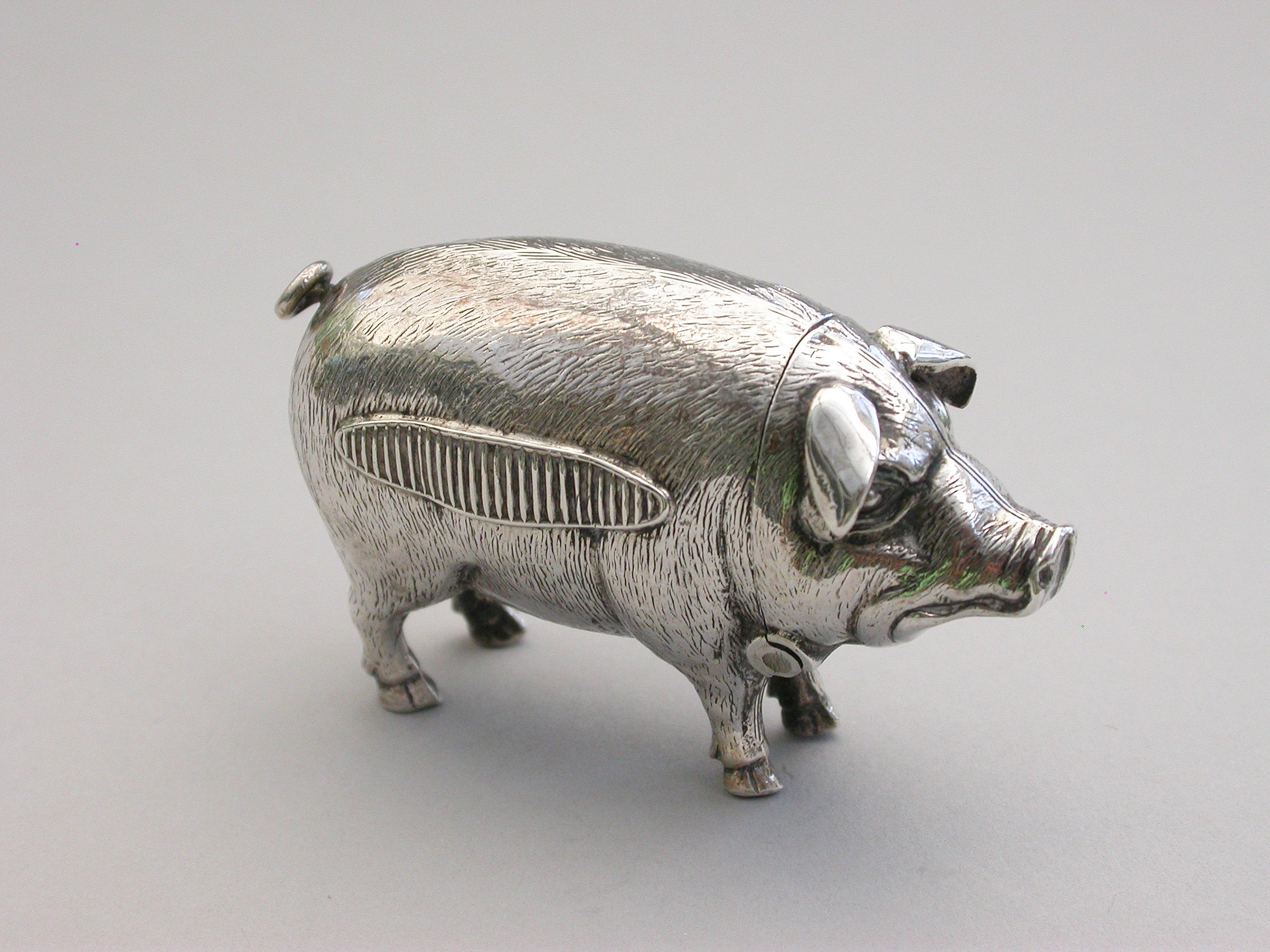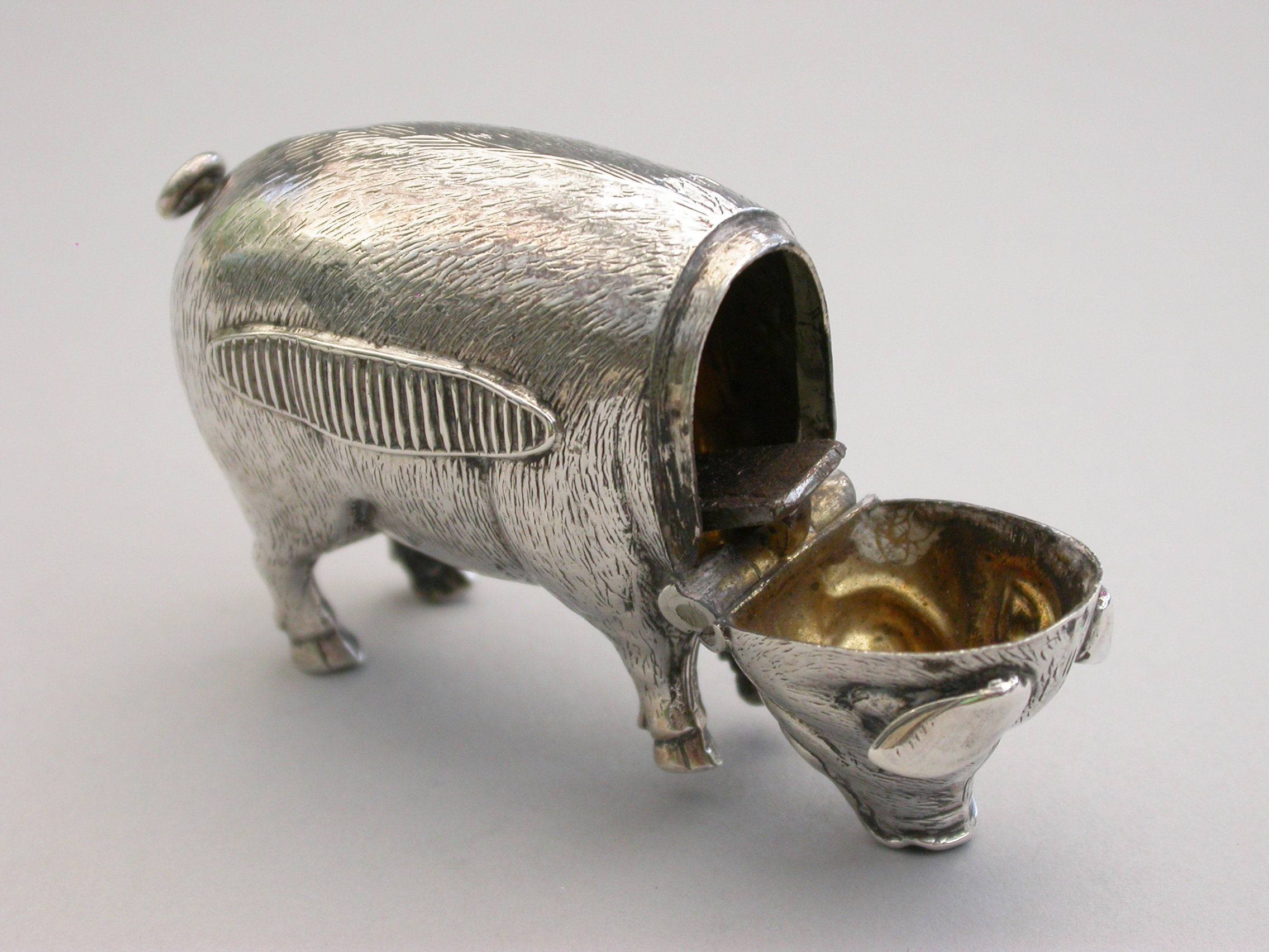 A good quality Edwardian novelty silver Vesta Case, made in the form of a standing Pig, the head hinging open to reveal a silver gilt interior.
