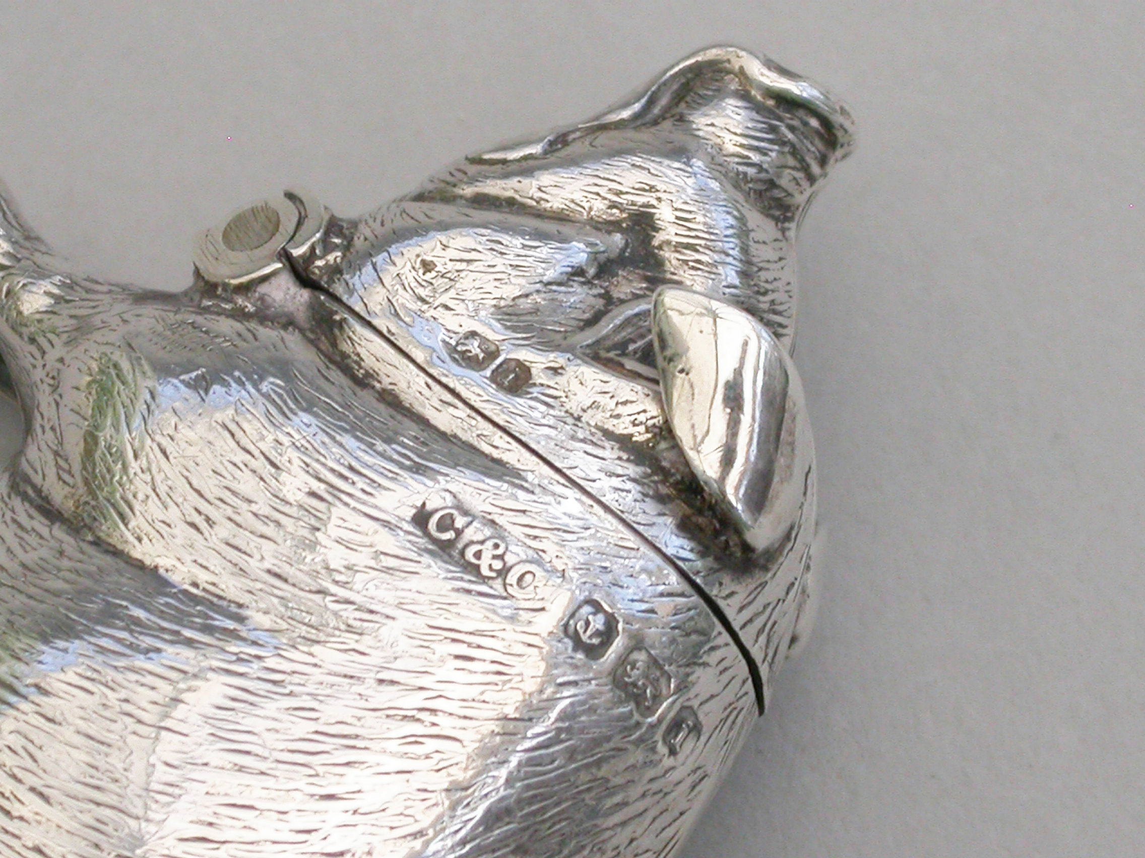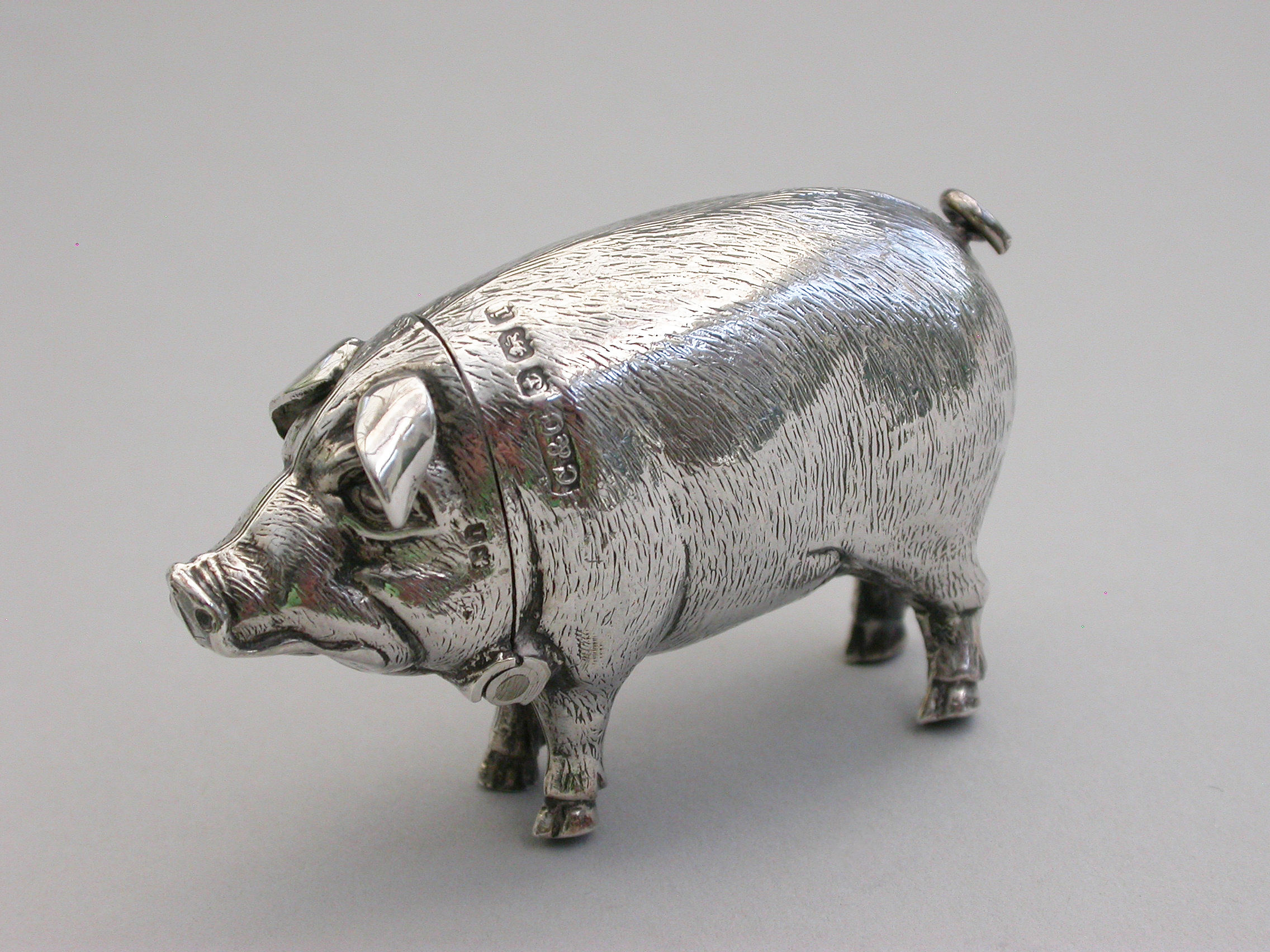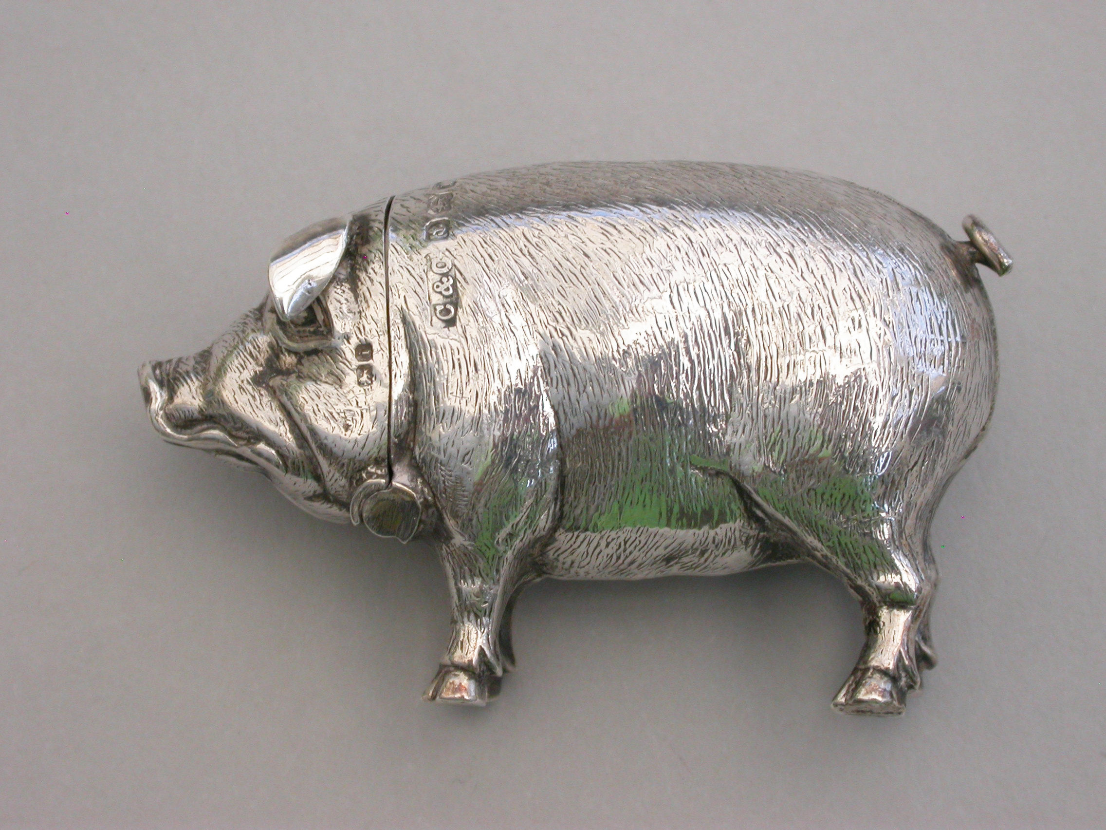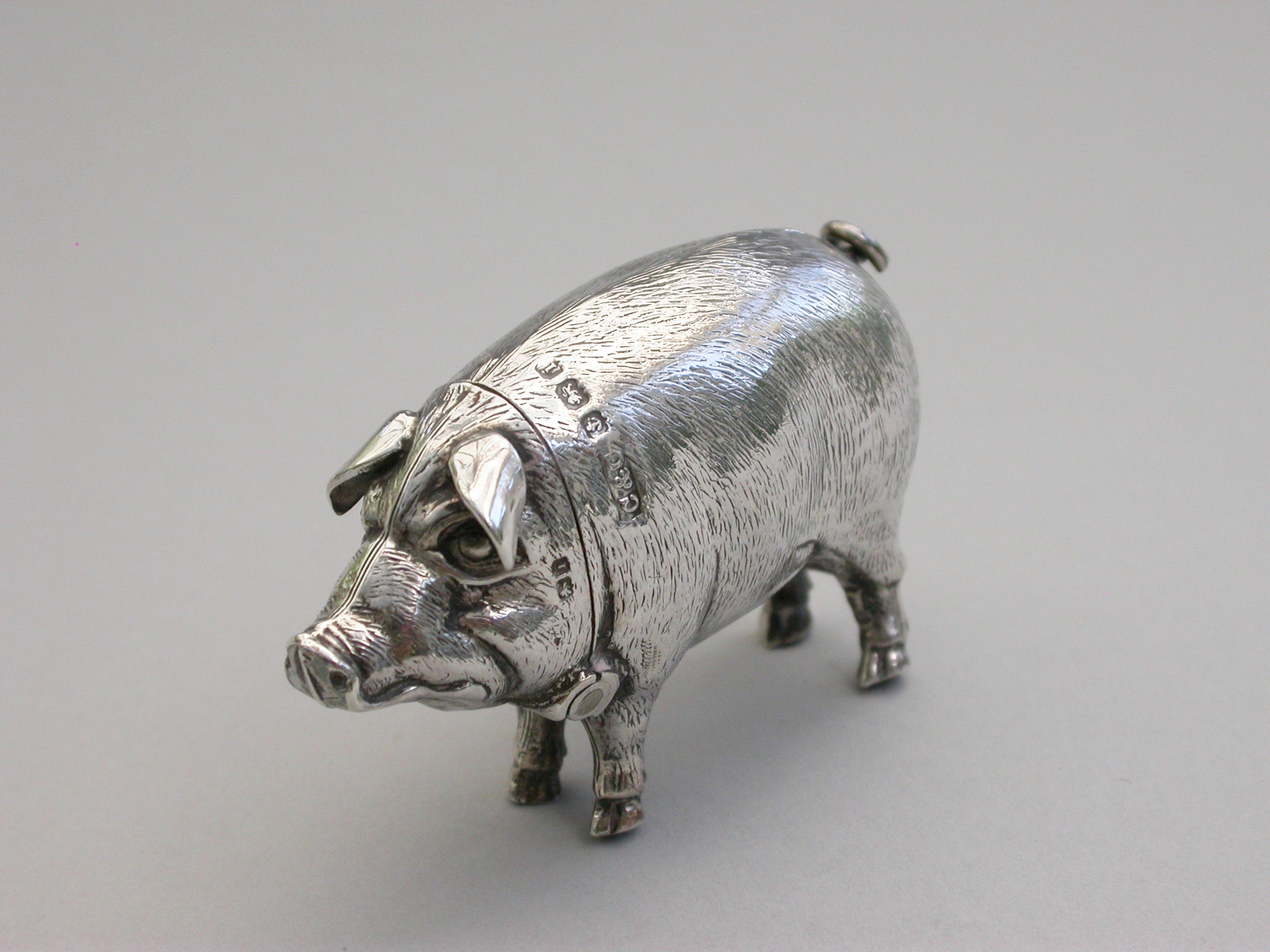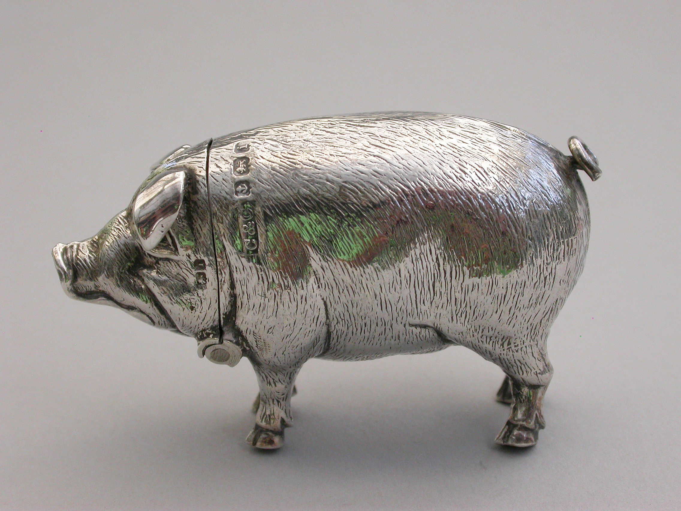 A good quality Edwardian novelty silver Vesta Case, made in the form of a standing Pig, the head hinging open to reveal a silver gilt interior.
