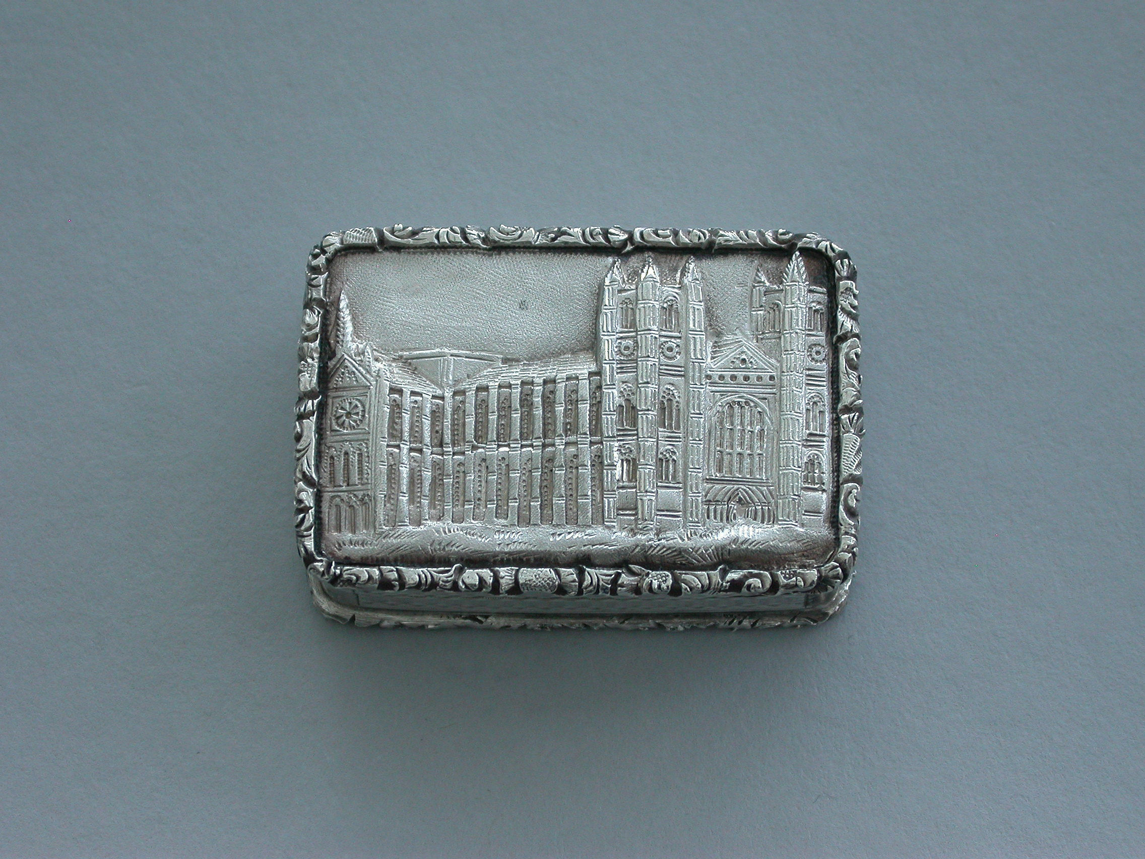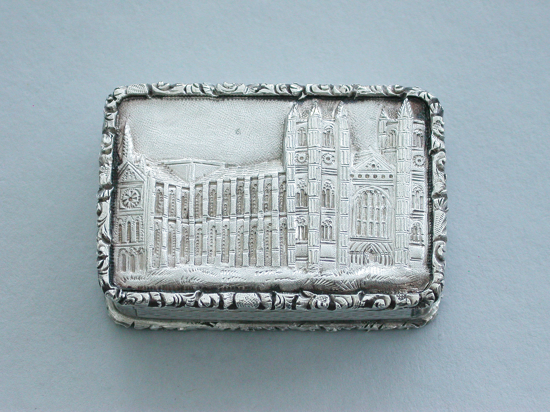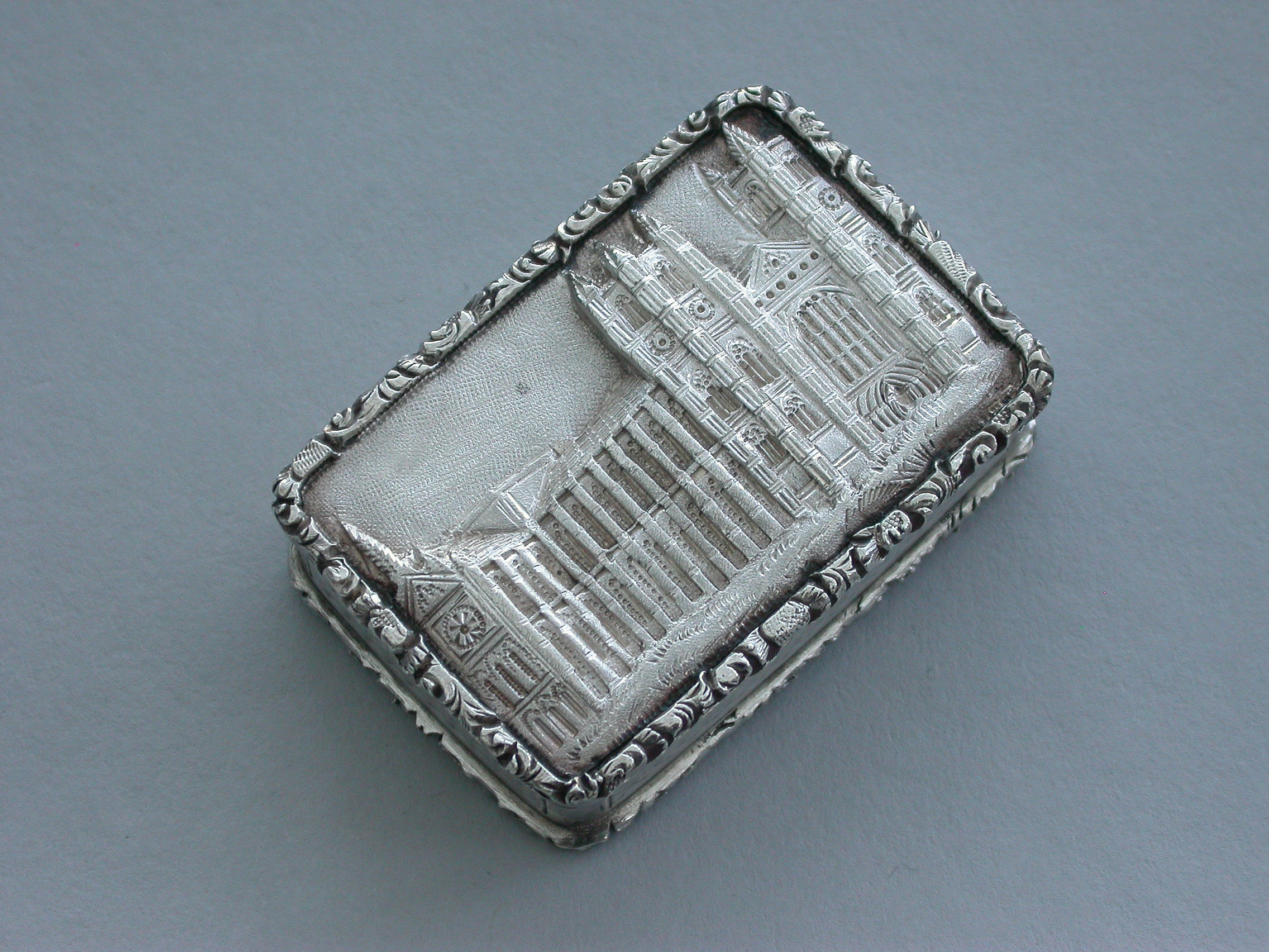 A rare Victorian silver castle-top Vinaigrette of rectangular form with engine turned base and sides and a vacant circular cartouche. The cover chased and engraved with an unusual view of Westminster Abbey in high relief within a cast folaite border. The silver gilt grille pierced with folaite scrolls and a central flower head.