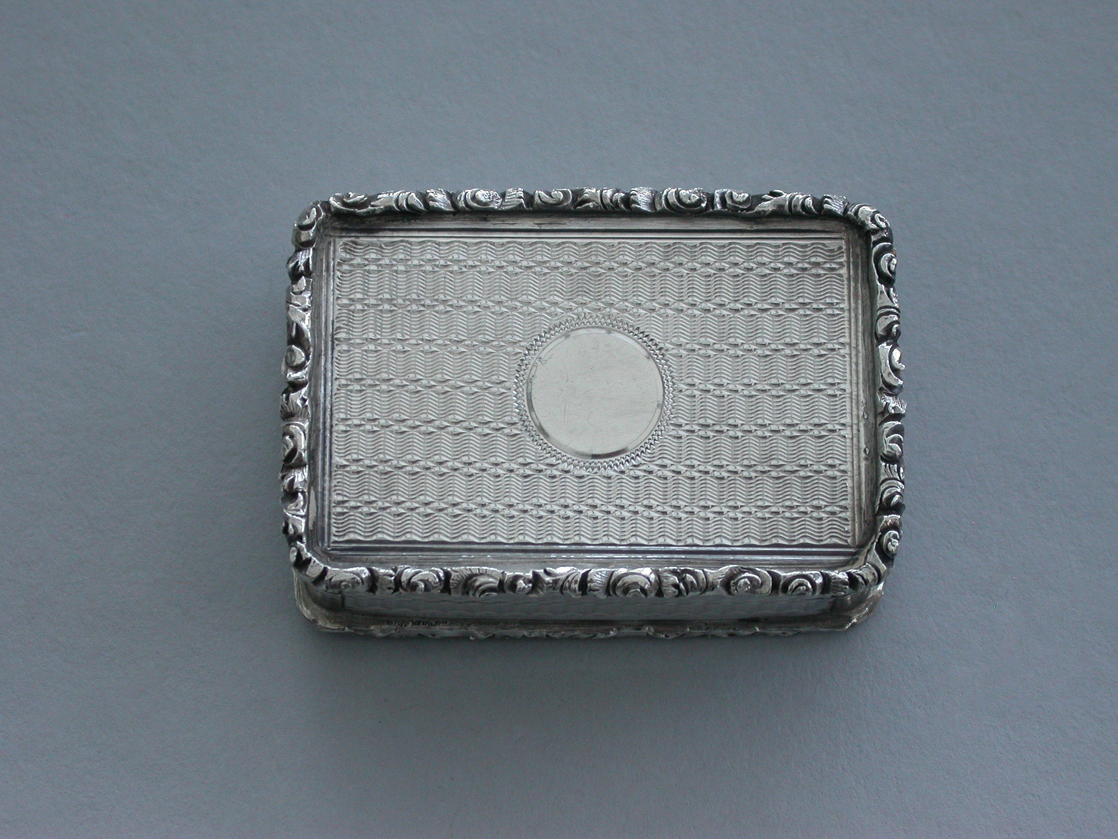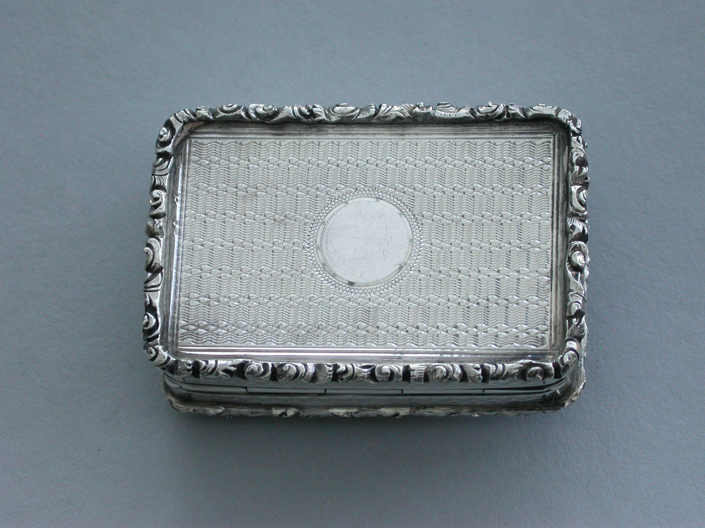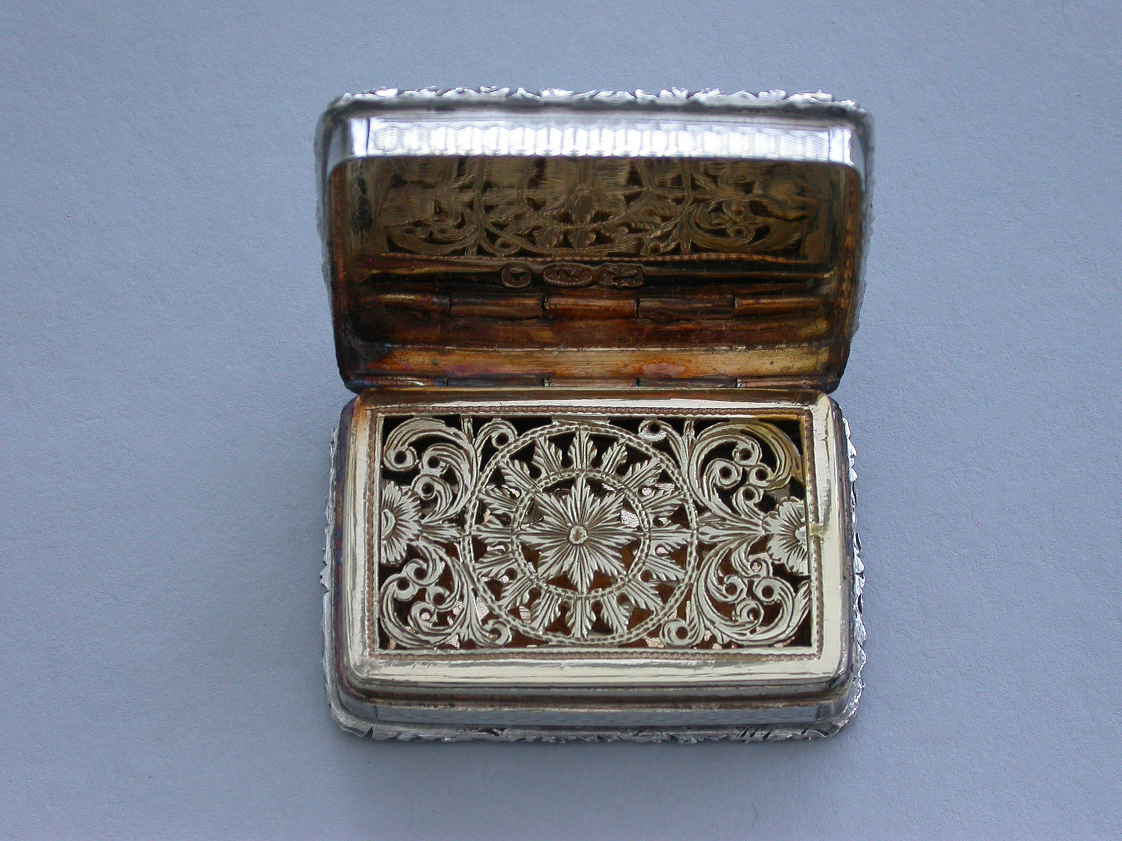 A rare Victorian silver castle-top Vinaigrette of rectangular form with engine turned base and sides and a vacant circular cartouche. The cover chased and engraved with an unusual view of Westminster Abbey in high relief within a cast folaite border. The silver gilt grille pierced with folaite scrolls and a central flower head.