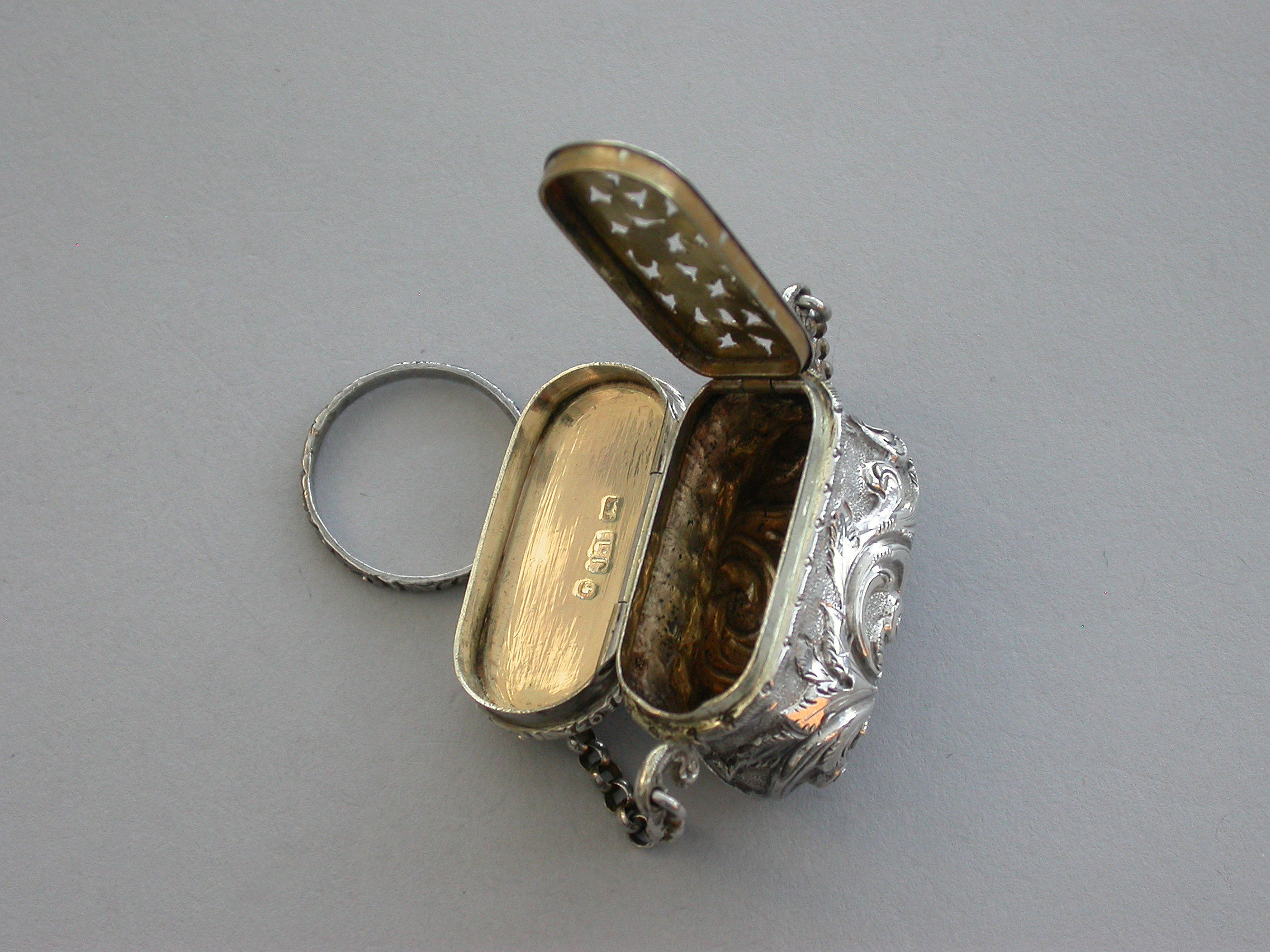 A Victorian silver castle-top Vinaigrette made in the form of a reticule chased with scrolls and leaves, the lid with inserted repousse plaque struck in low relief with Windsor Castle as seen from the garden. Complete with attached suspension chain and finger ring. The silver gilt grille pierced with flower heads.