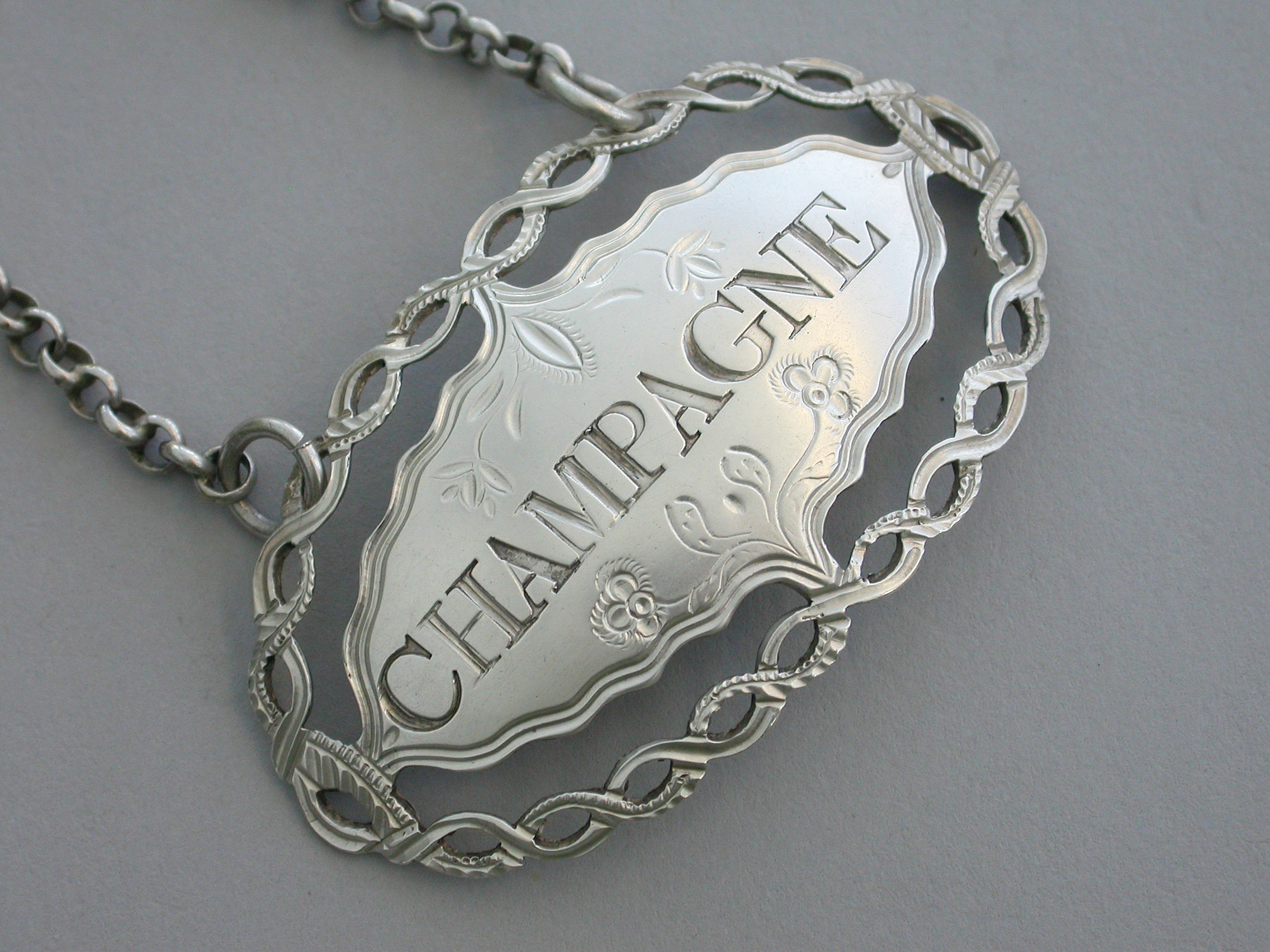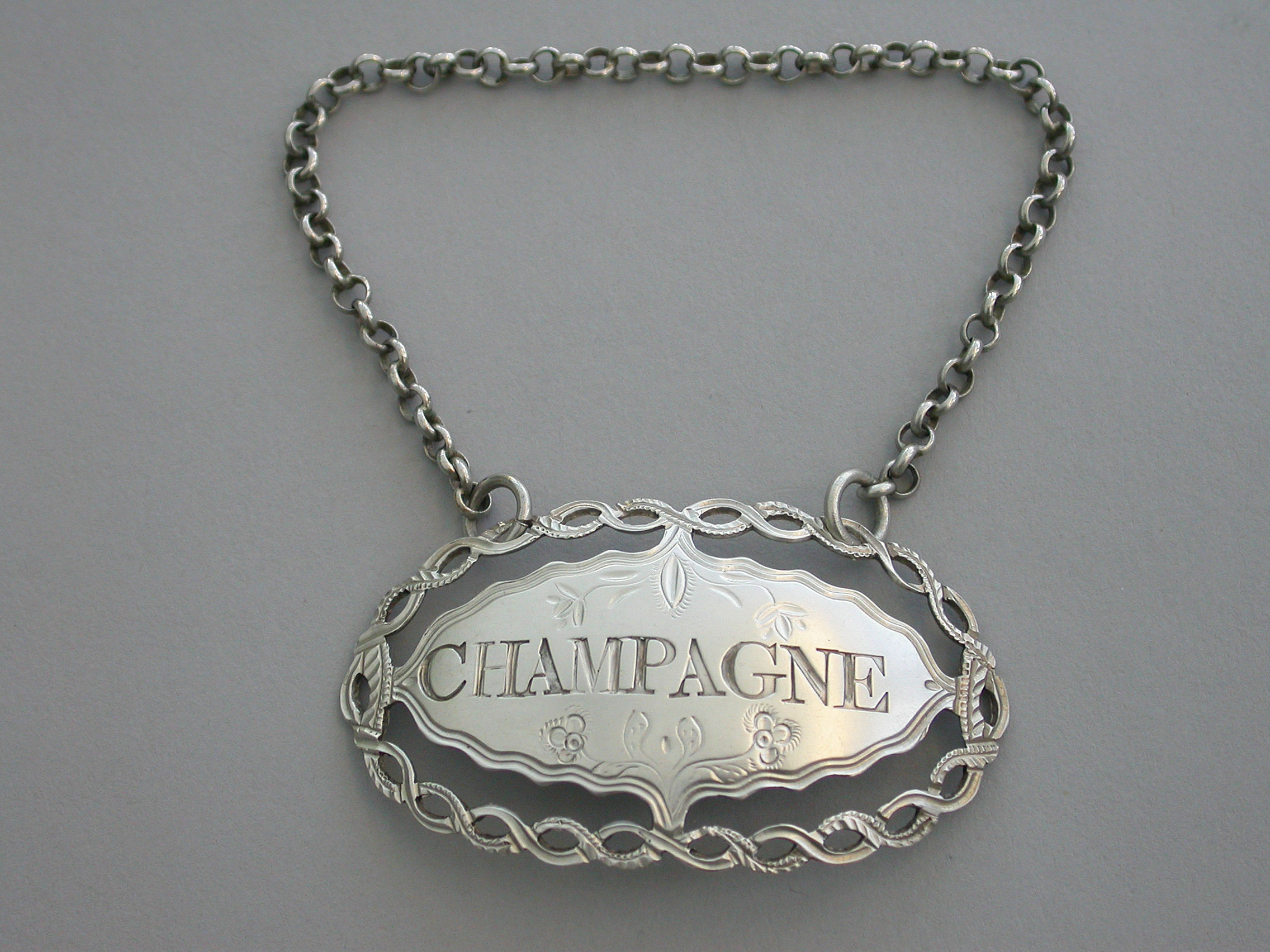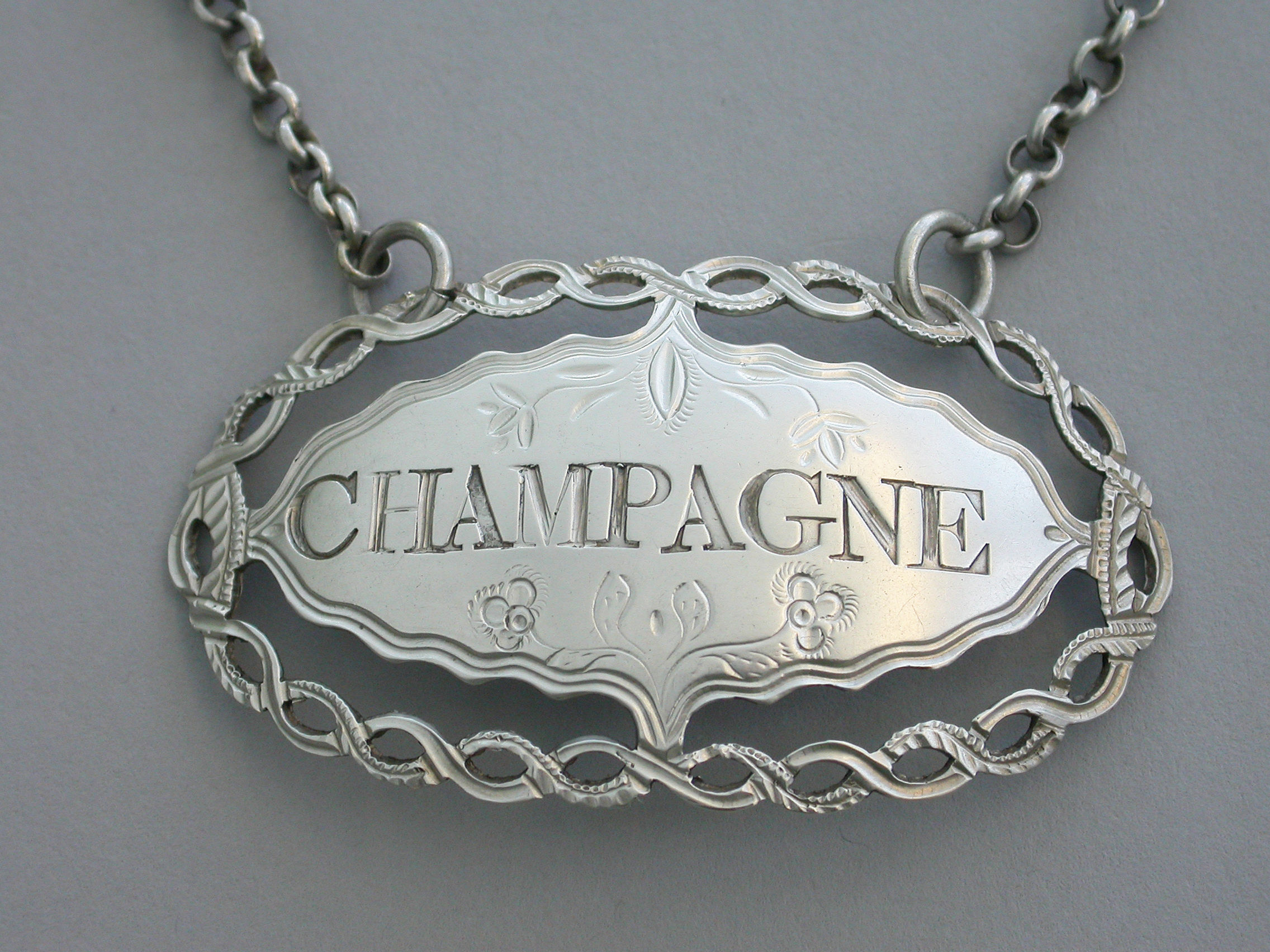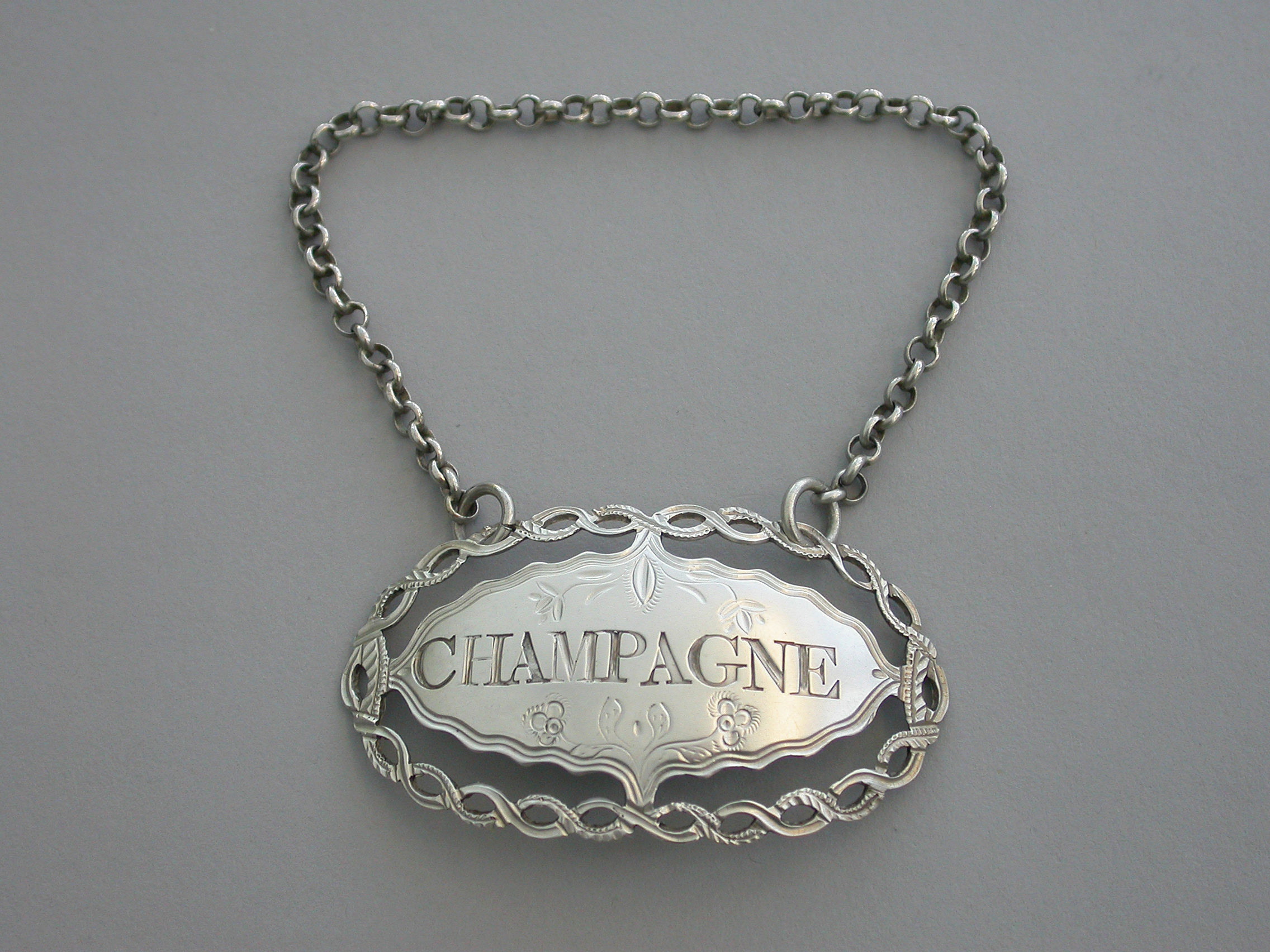 A very fine George III silver Wine Label of cut-out pierced oval form with bright-cut engraved decoration and pierced entwined cable border, incised for Champagne between foliate devices.