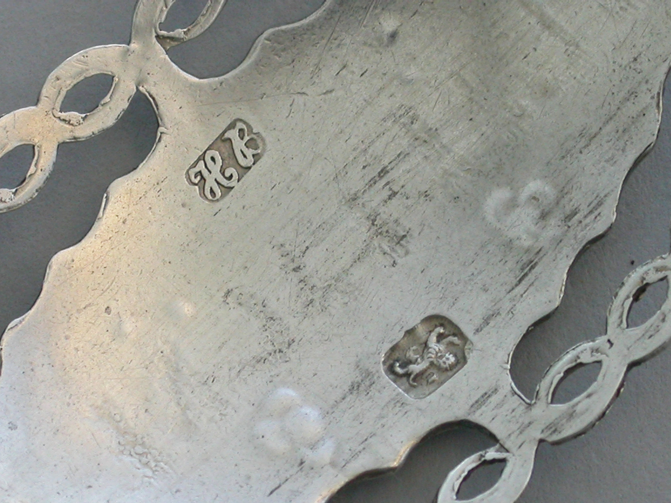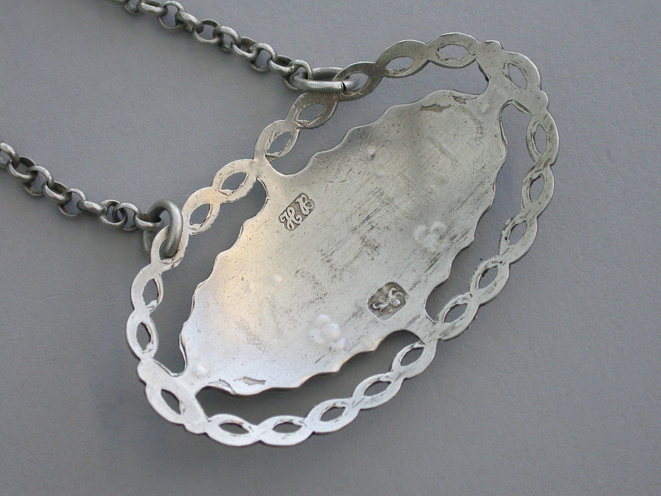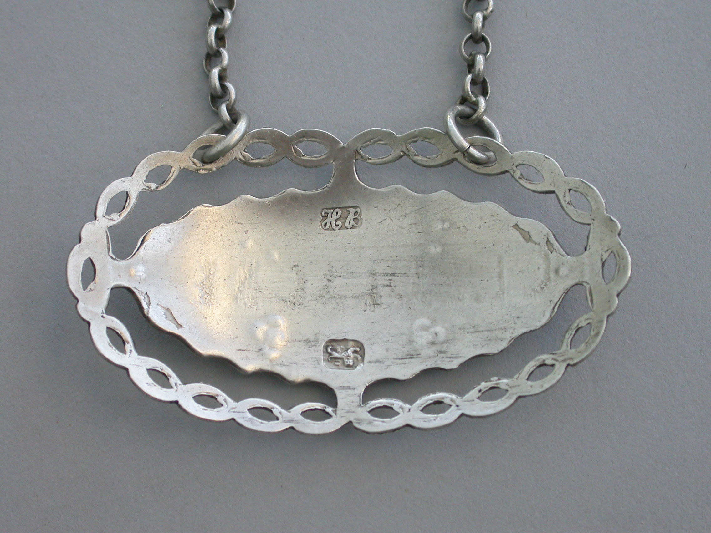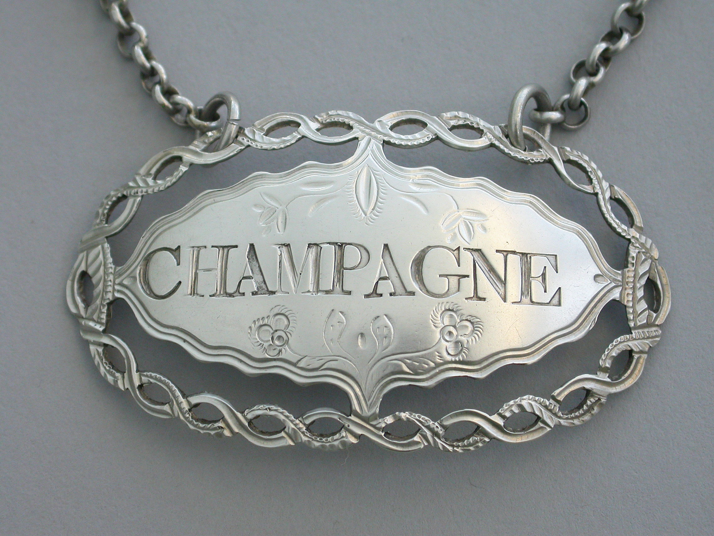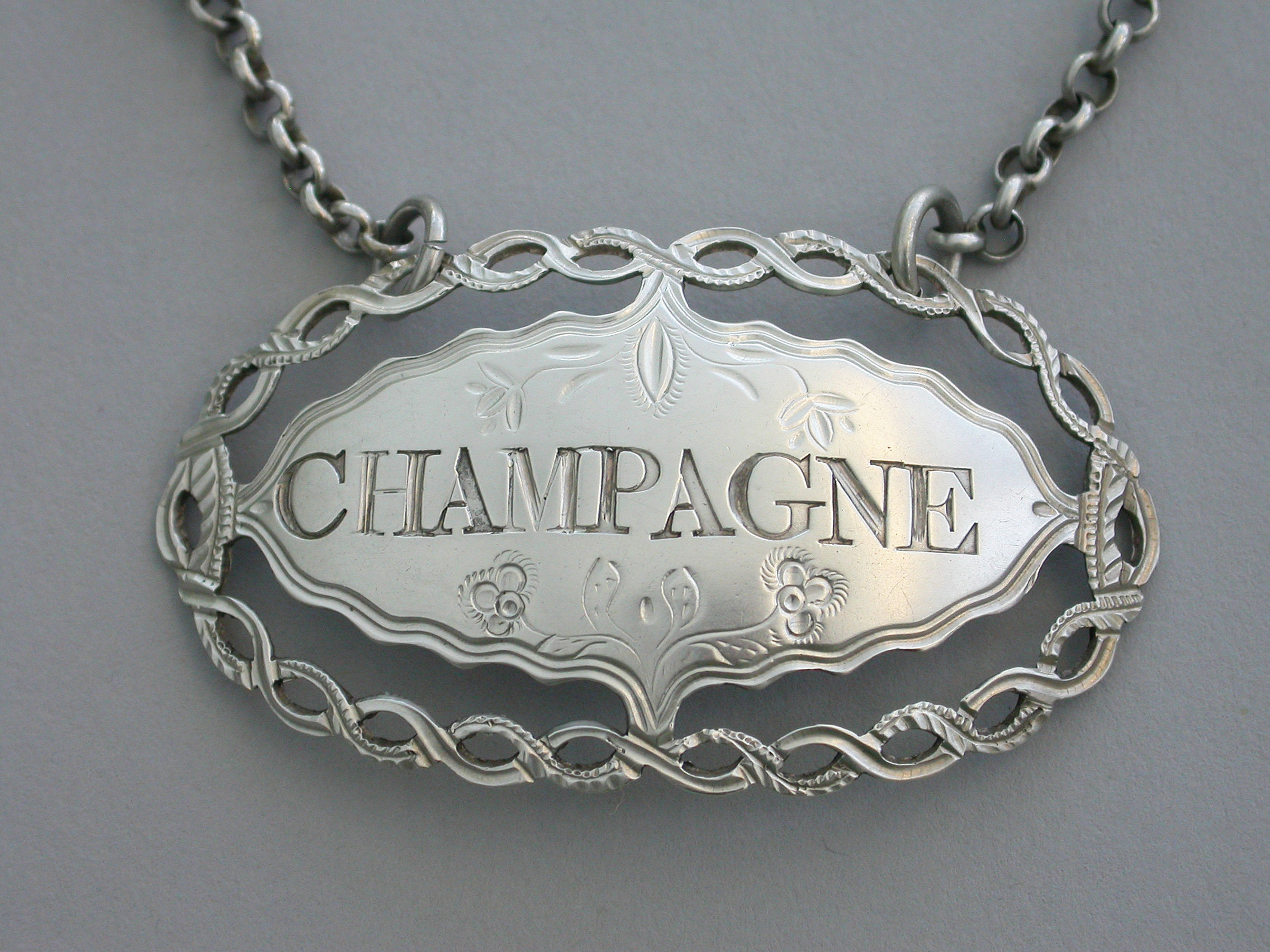 A very fine George III silver Wine Label of cut-out pierced oval form with bright-cut engraved decoration and pierced entwined cable border, incised for Champagne between foliate devices.