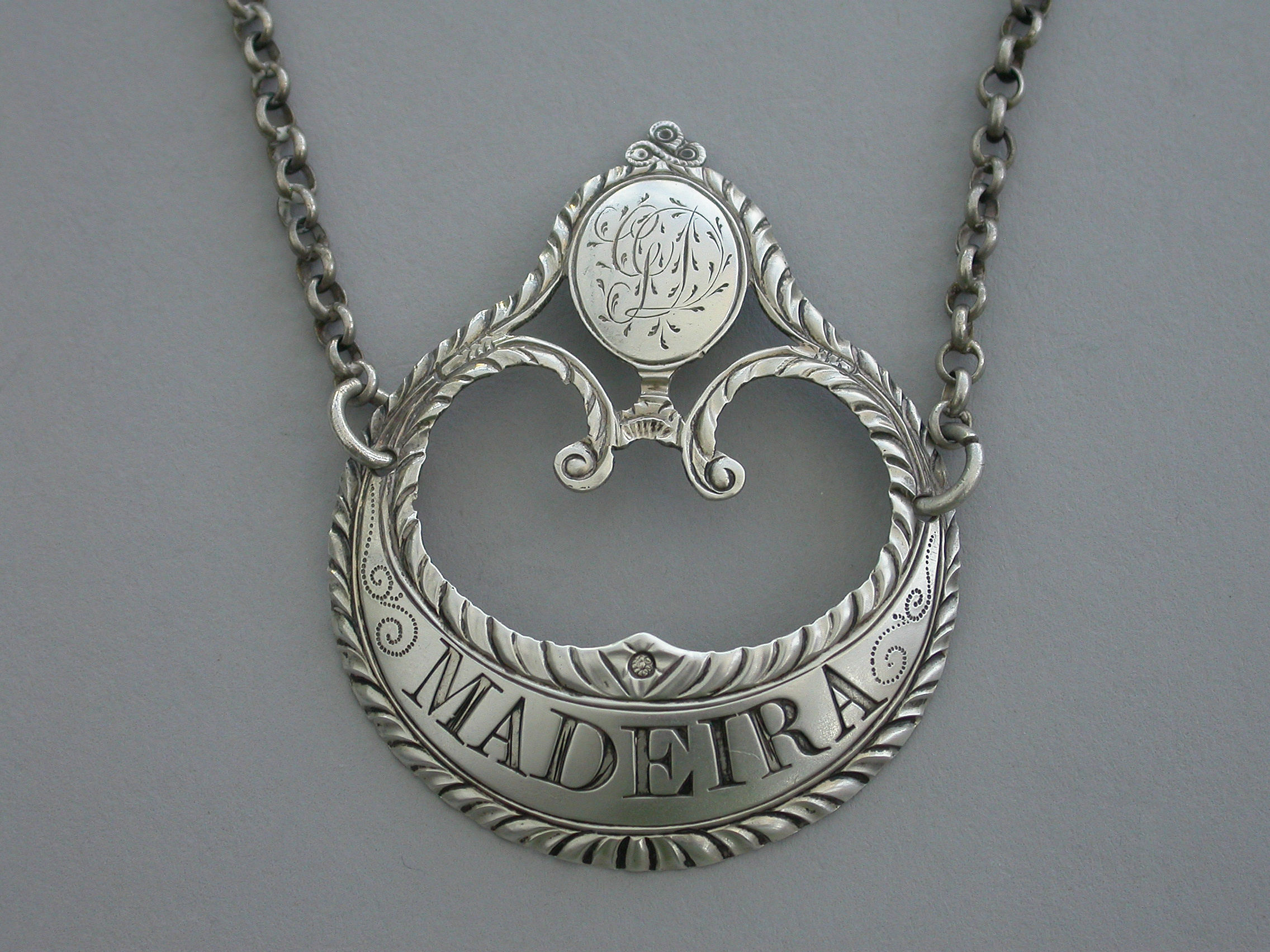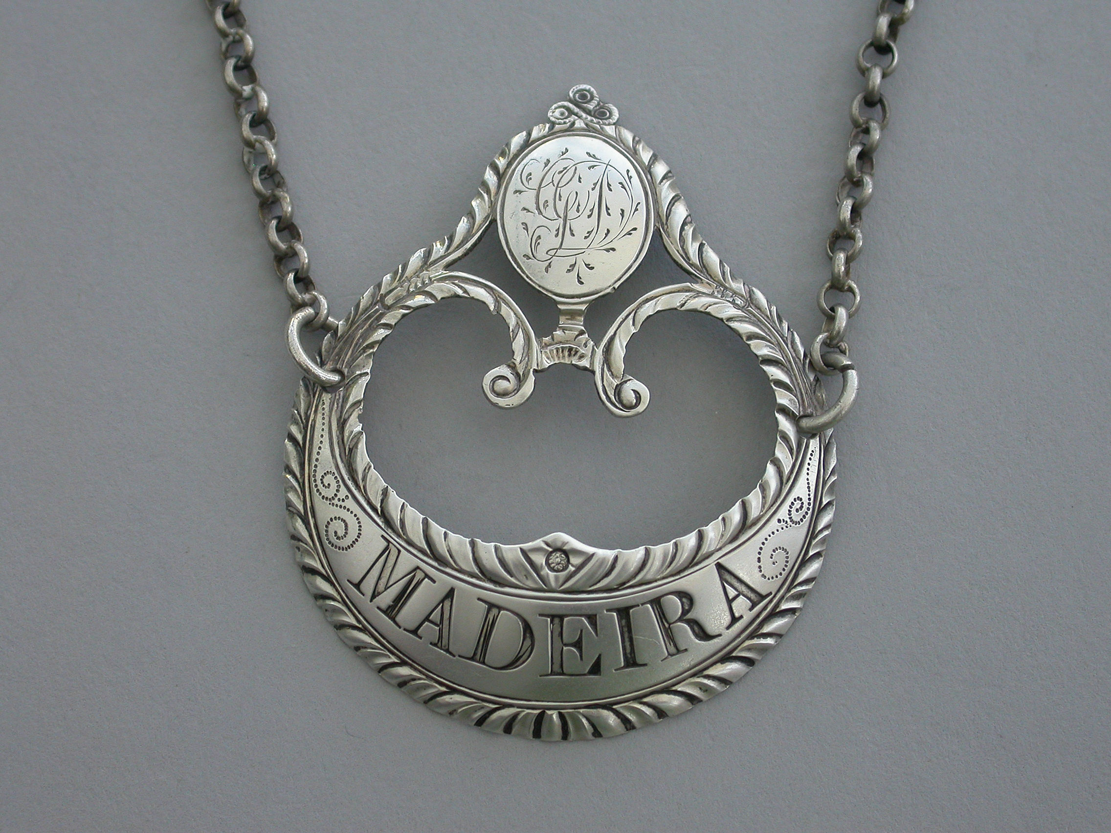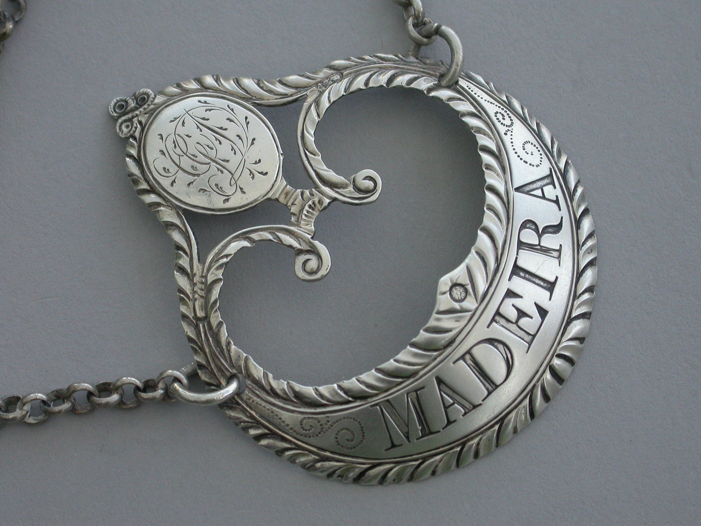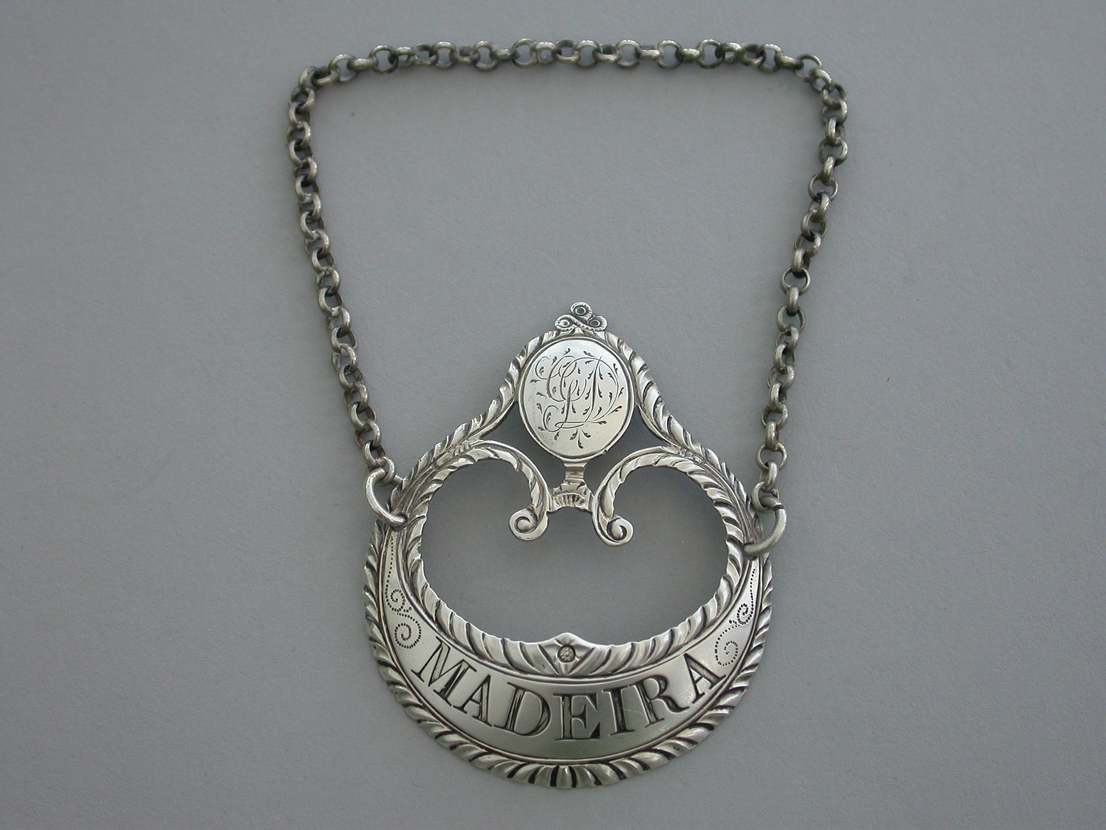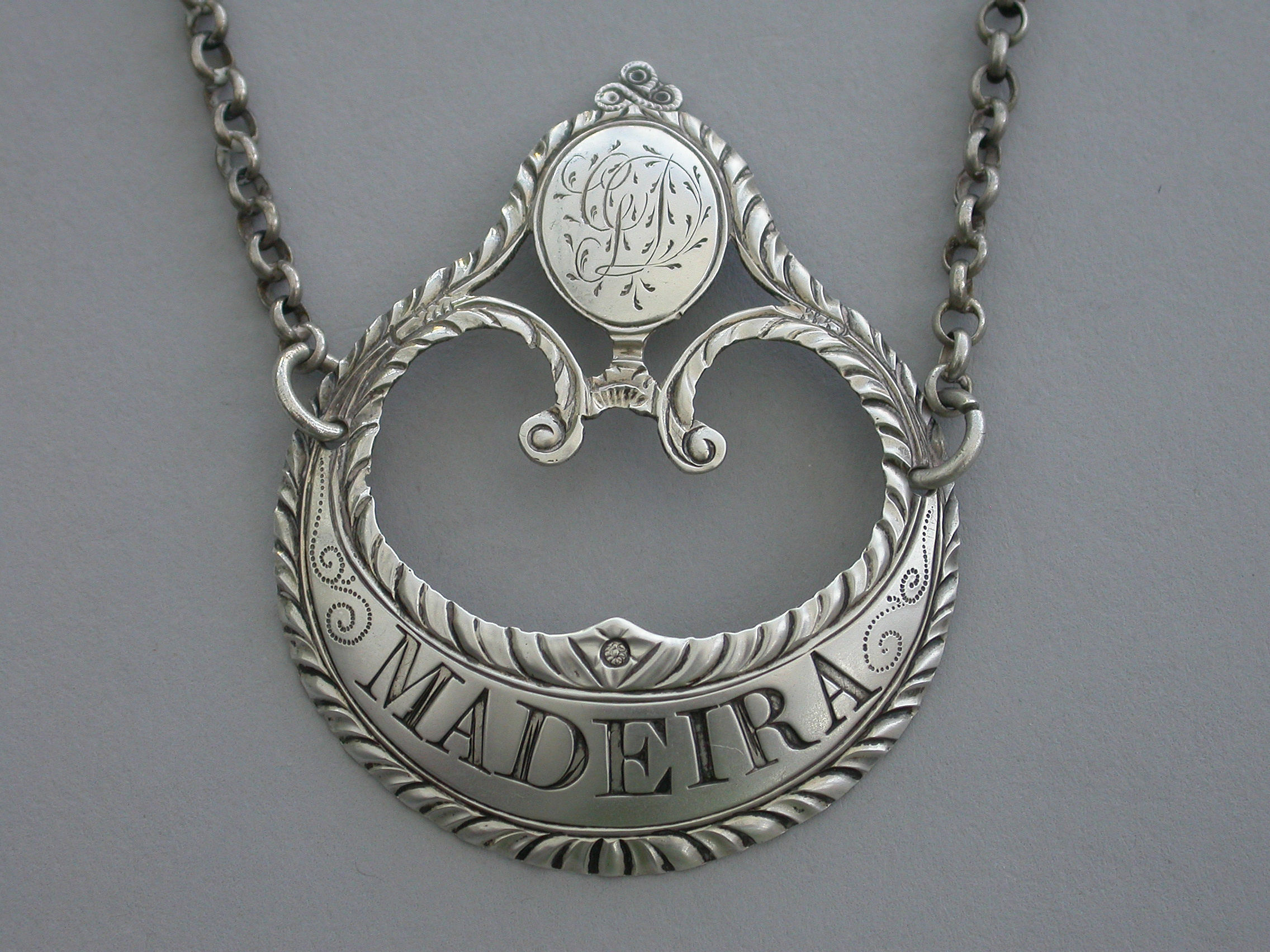 A fine George III silver Wine Label of enclosed crescent form with oval cartouche above engraved with contemporary initials, supported by swags with tied ribbon surmount, feather edge borders, incised for Madeira.