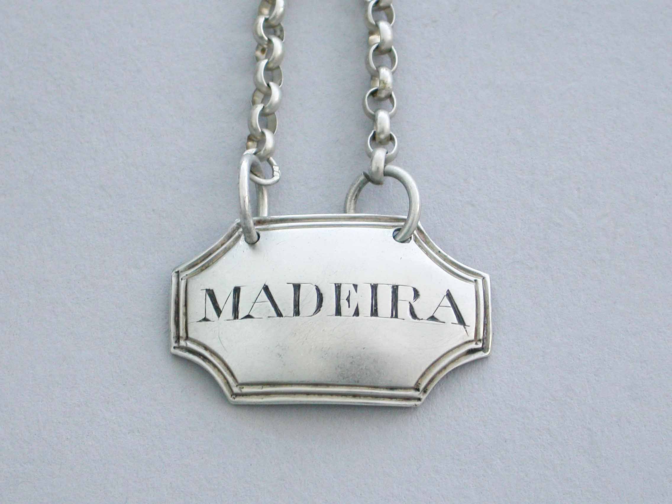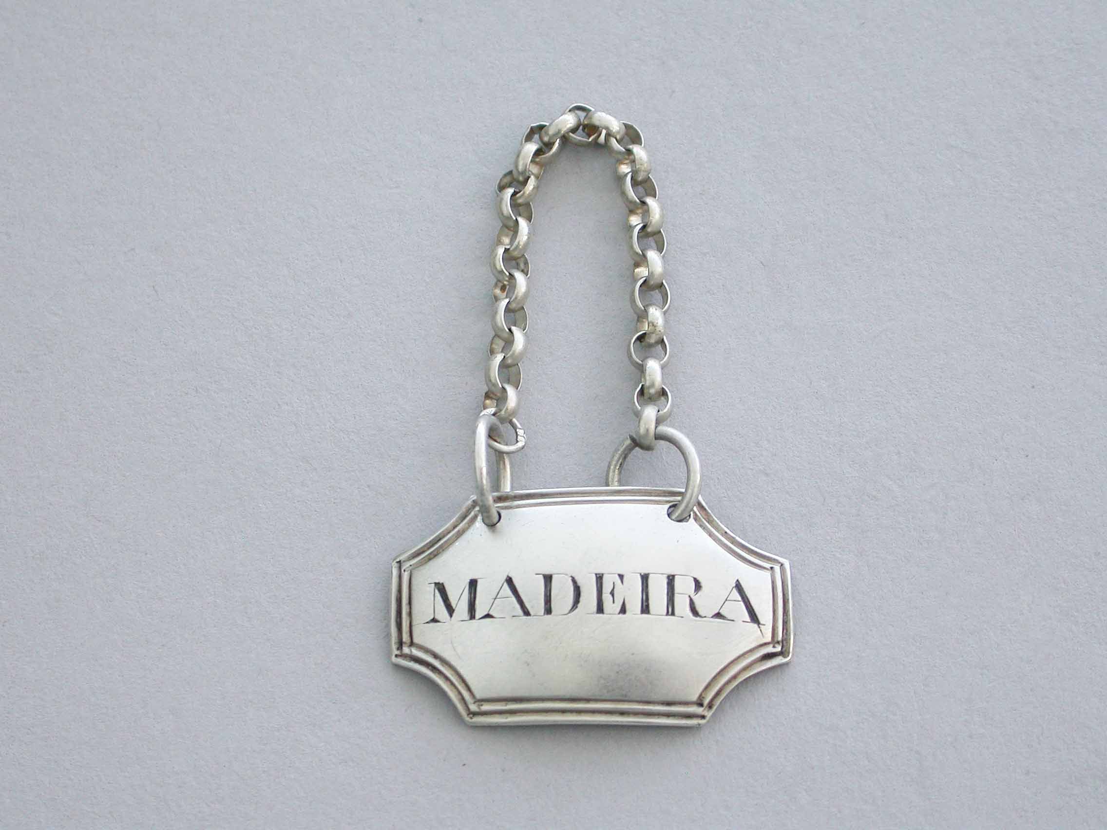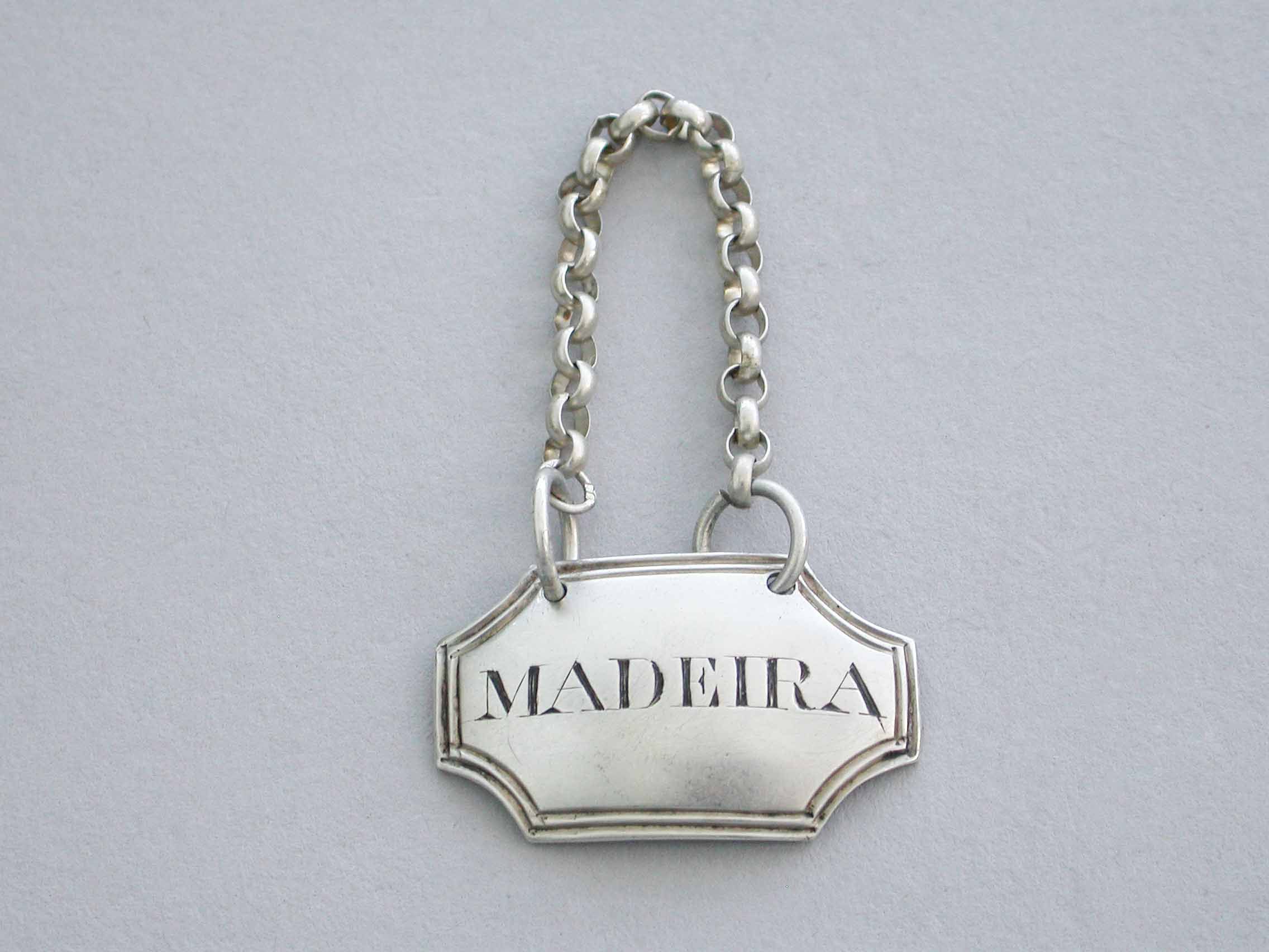A small George III silver Wine Label of curved rectangular form with concave cut-corners and double reeded border, incised for Madeira.