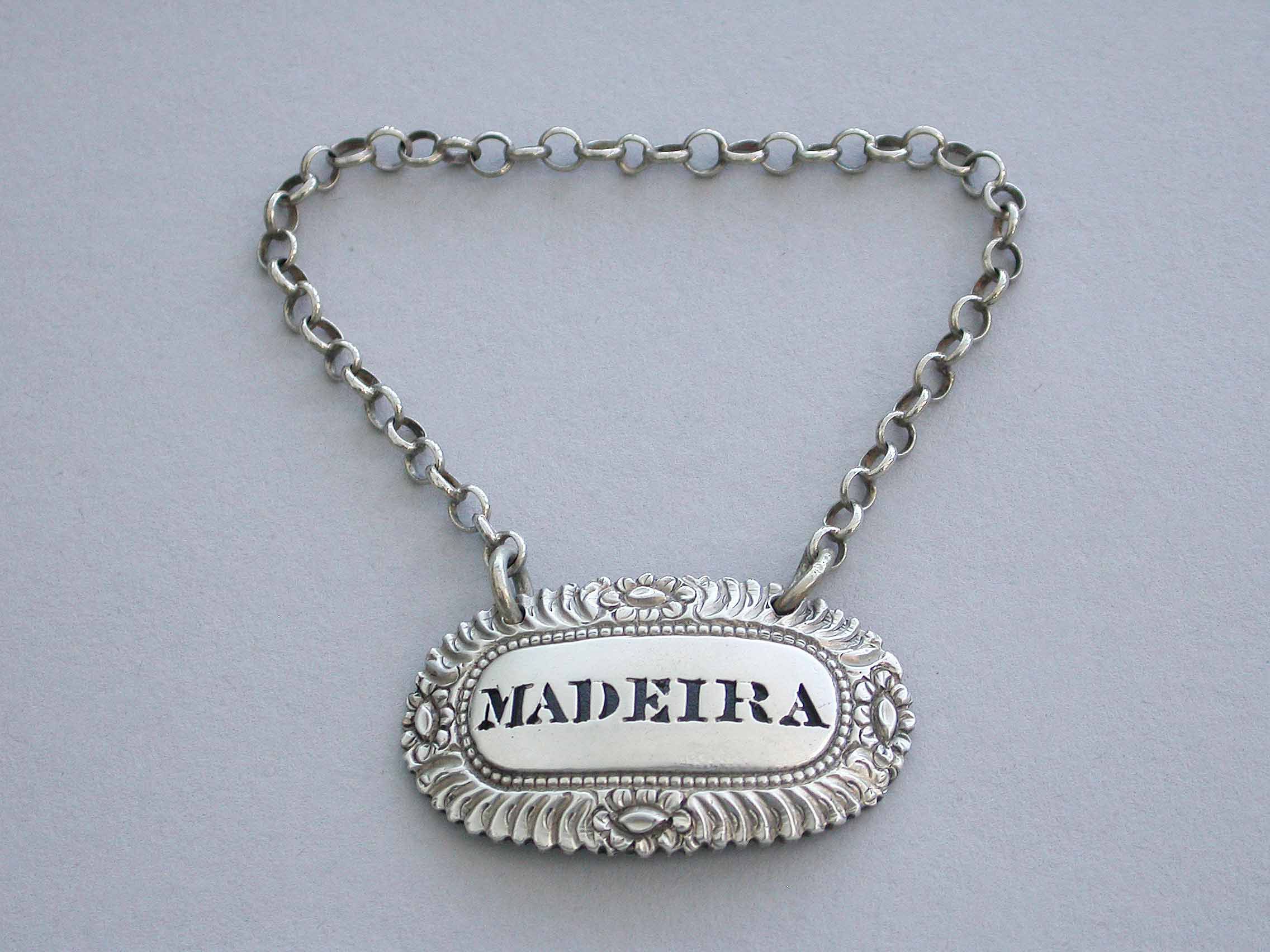 A small George IV cast silver Wine Label of oval form with gadrooned border interspersed by four flower heads, the plain name plate pierced for Madeira.