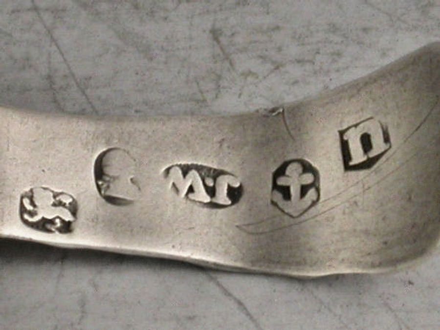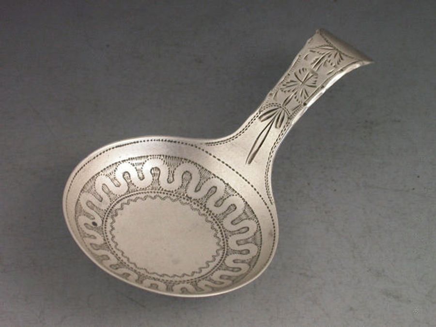 Small George III silver Caddy Spoon with circular bowl and curved Old English handle, bright cut engraved decoration.