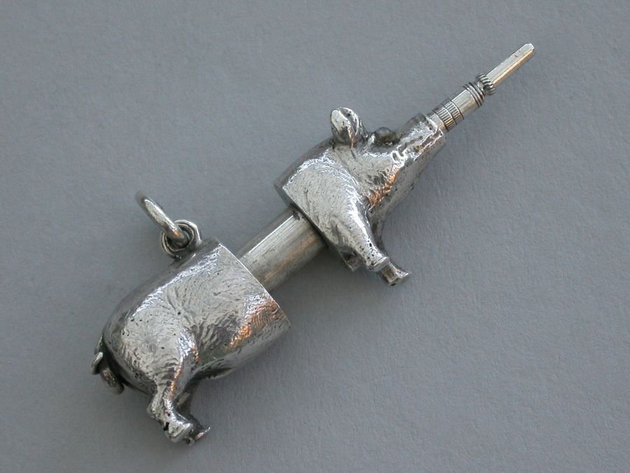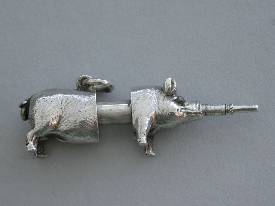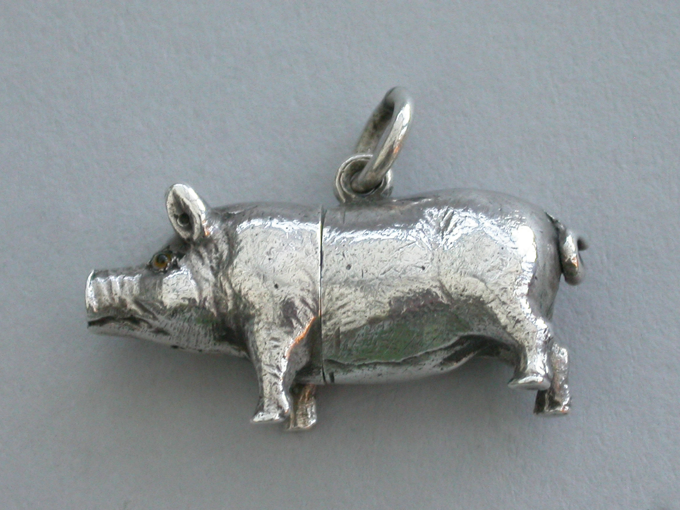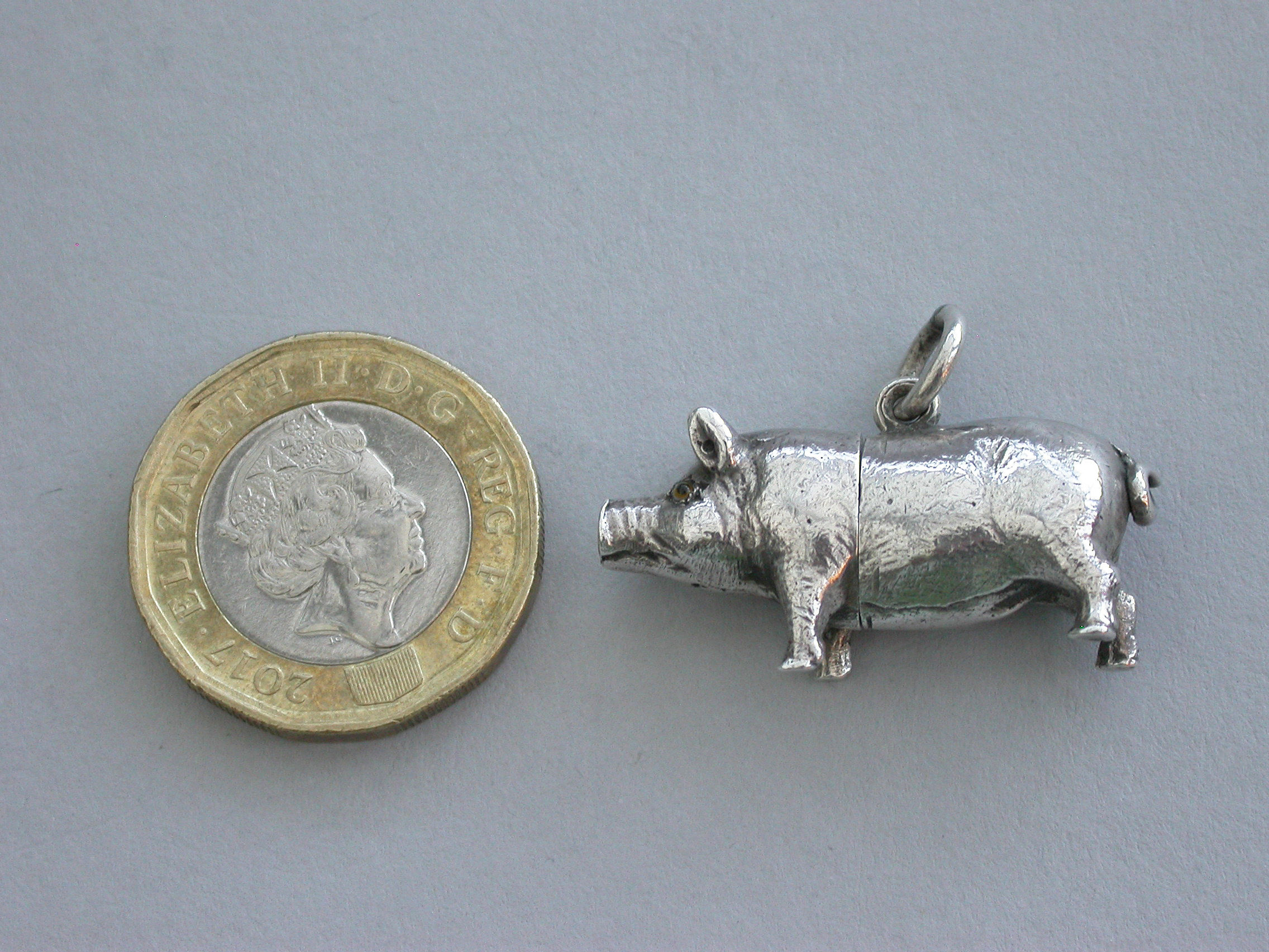 A rare Victorian novelty silver Propelling Pencil of small size, made in the form of a Pig, with glass eyes and attached suspension ring.