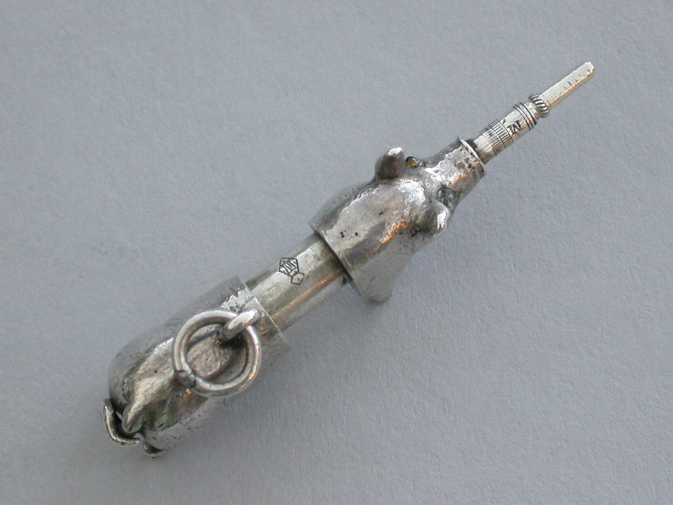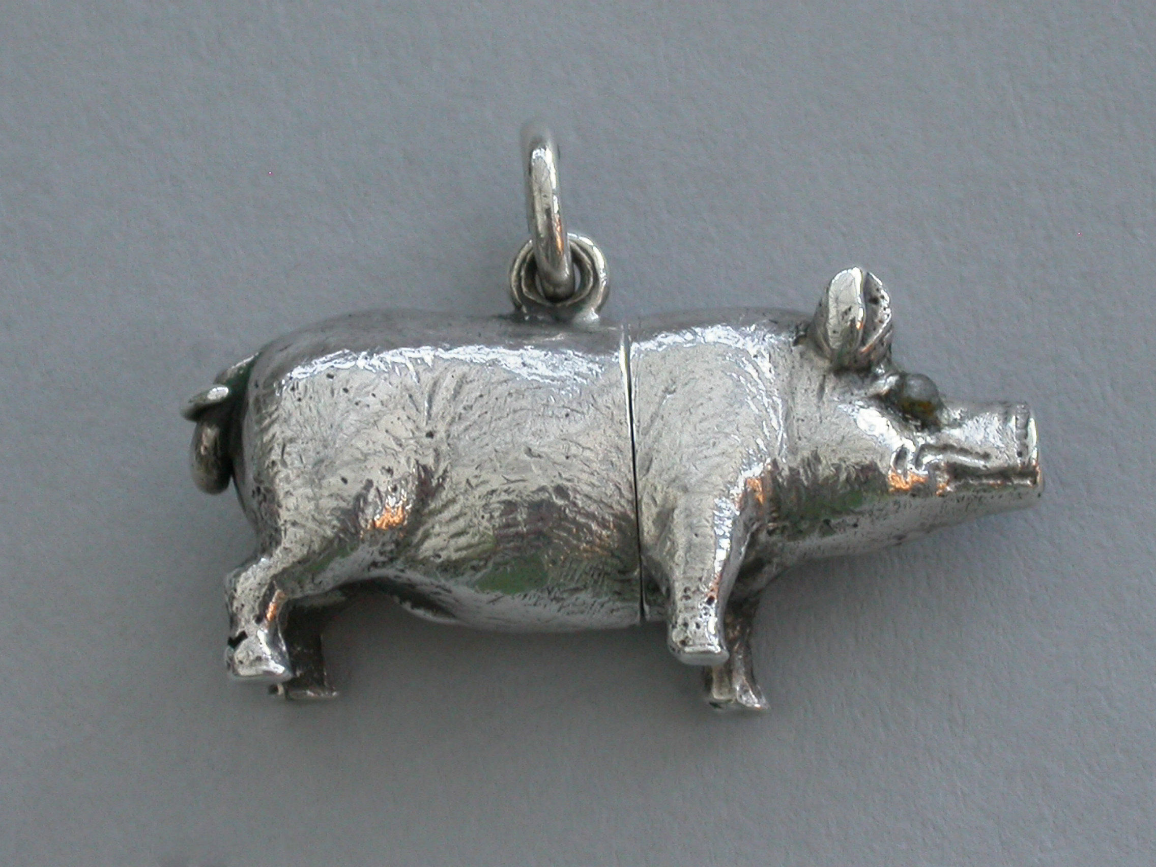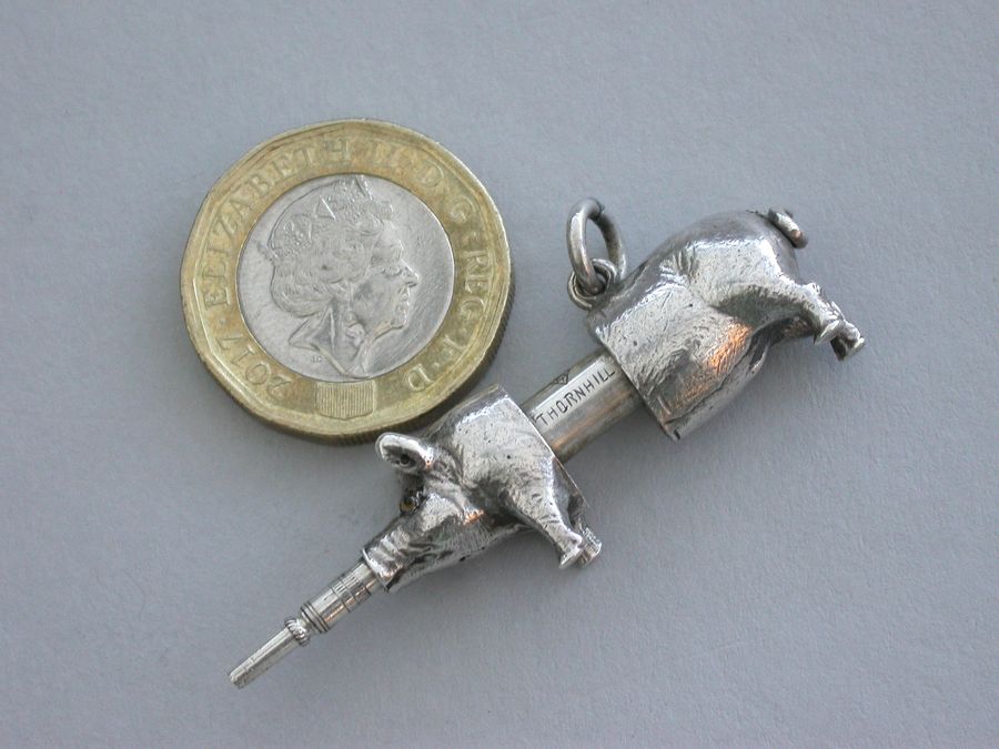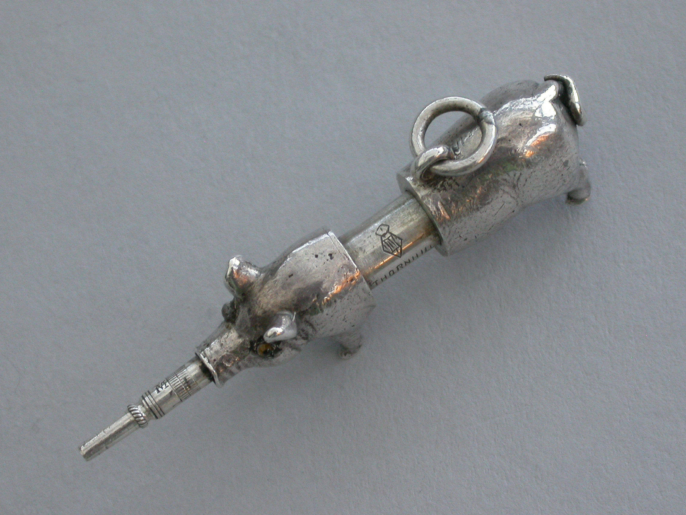 A rare Victorian novelty silver Propelling Pencil of small size, made in the form of a Pig, with glass eyes and attached suspension ring.