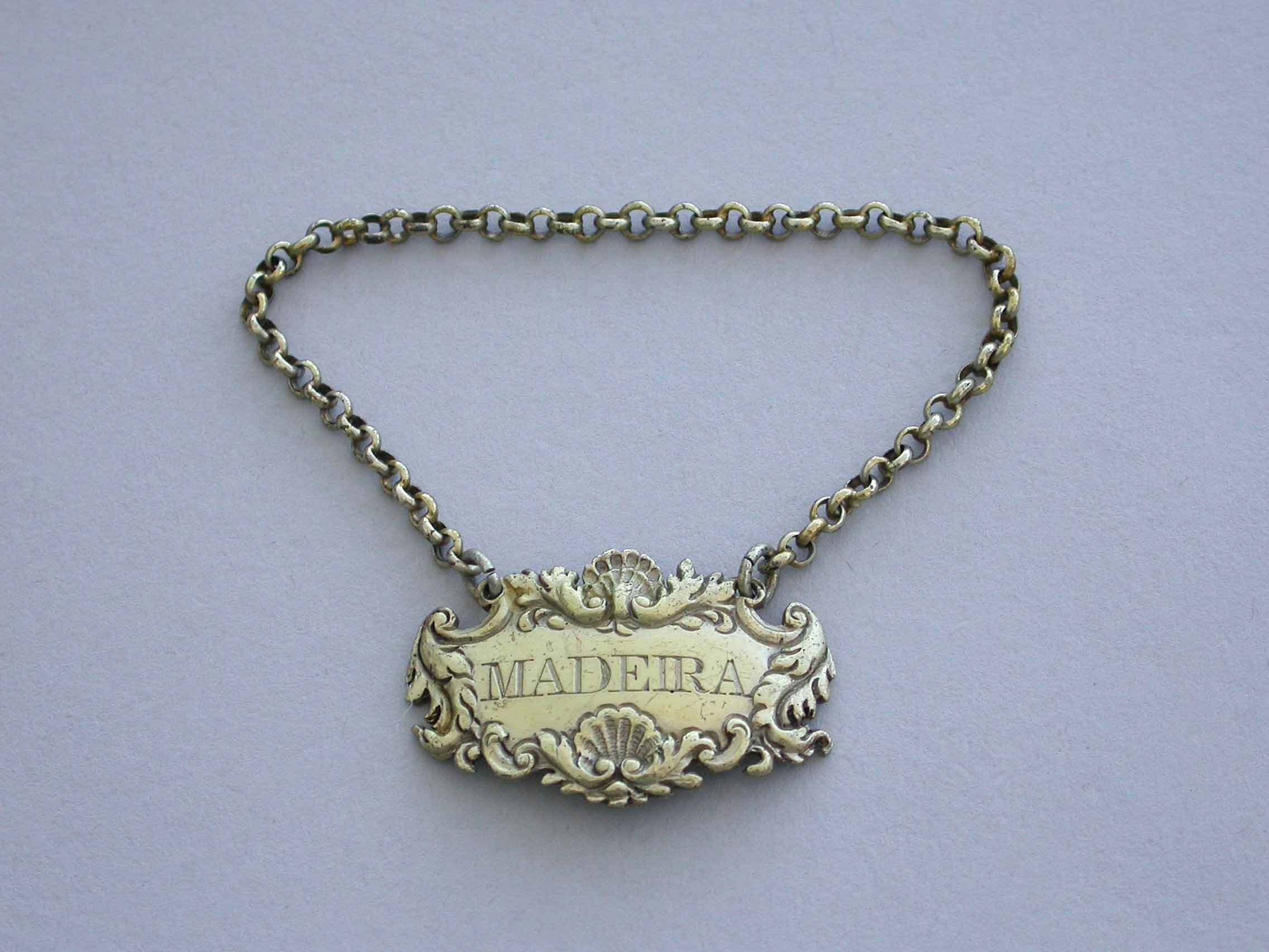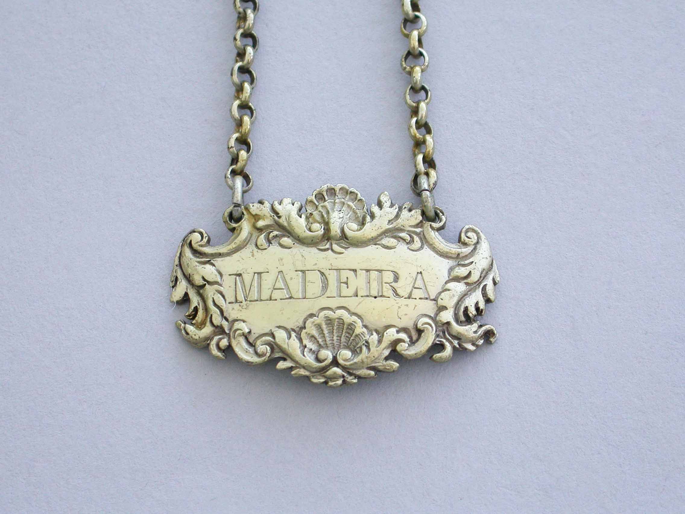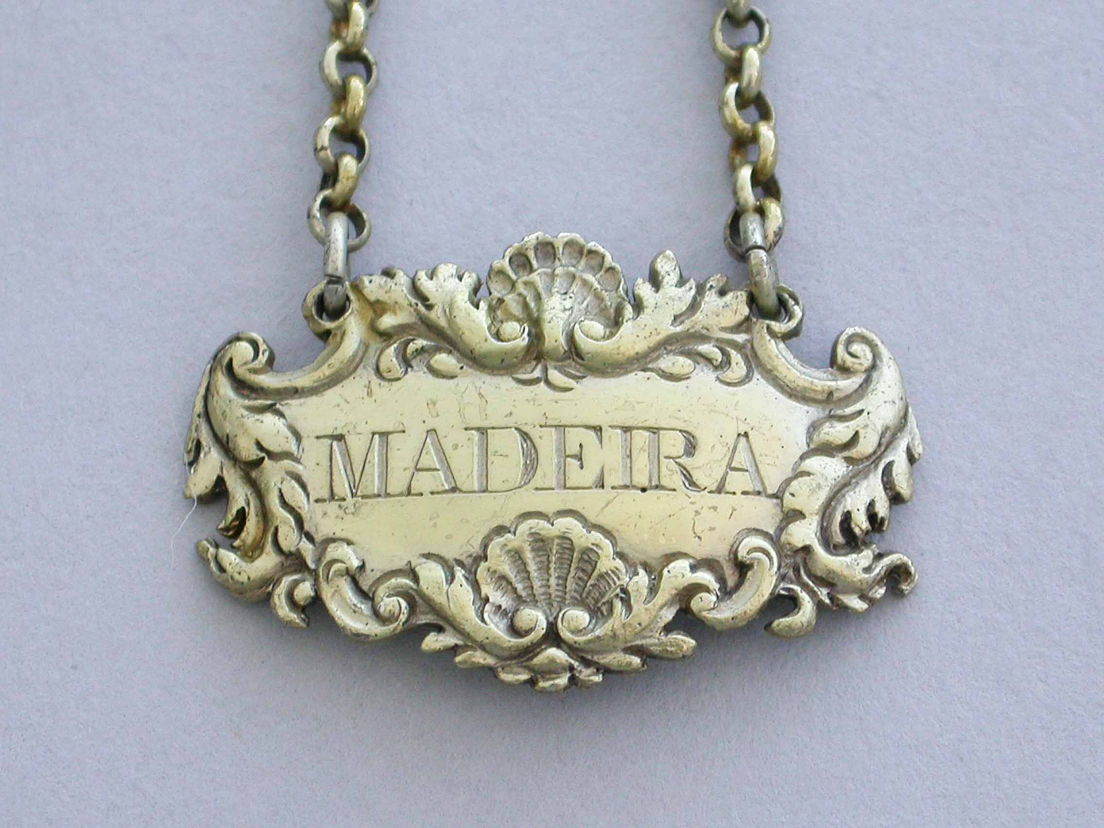 A small Victorian silver gilt Wine Label of cartouche form with shell, leaf and scroll border, incised for Madeira.