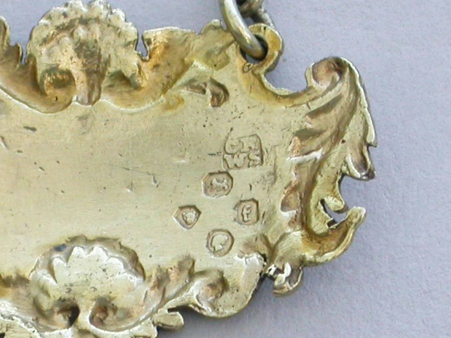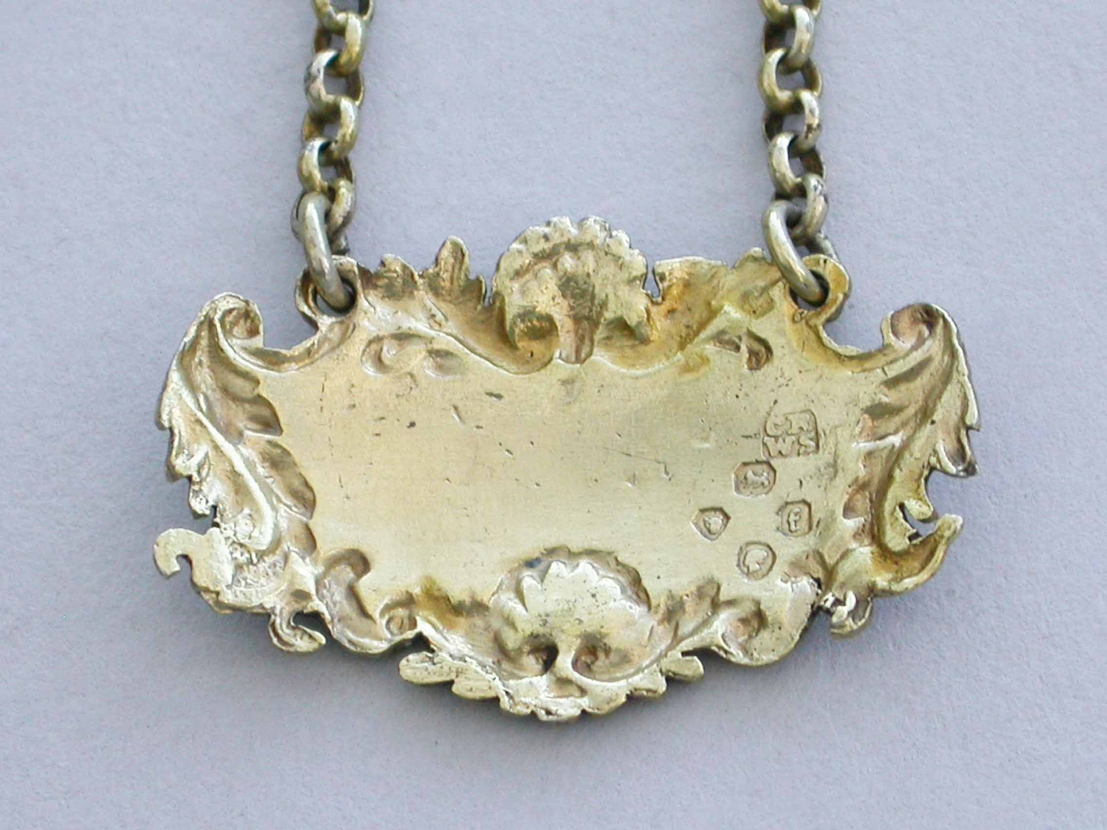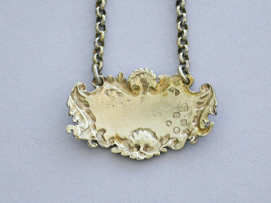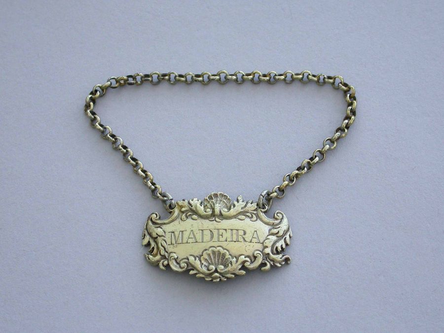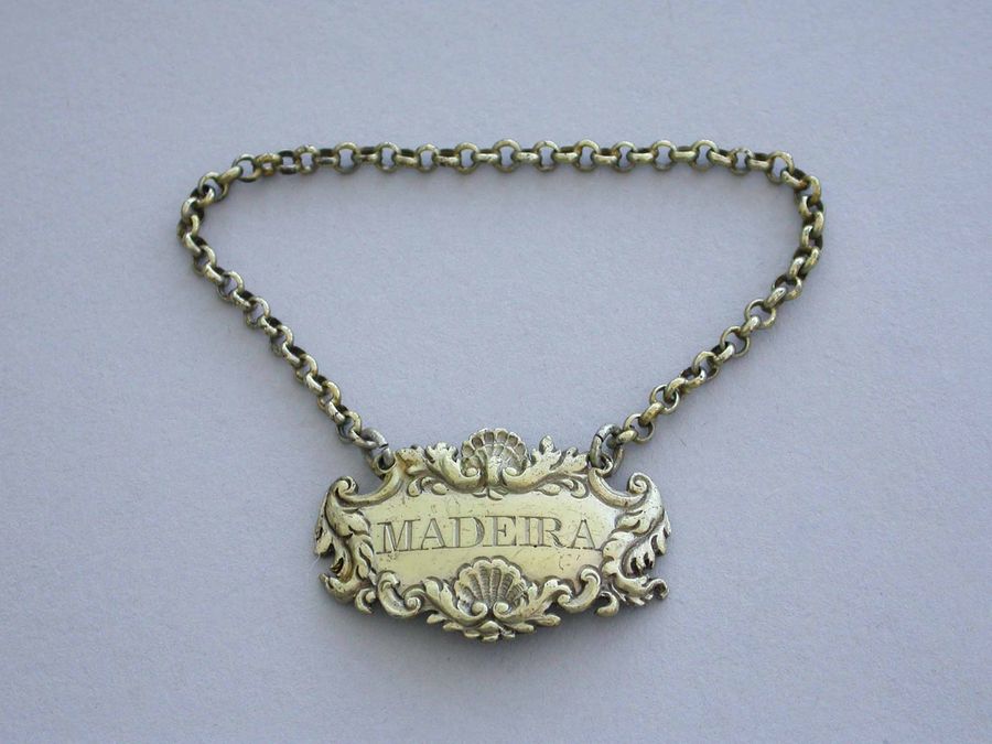A small Victorian silver gilt Wine Label of cartouche form with shell, leaf and scroll border, incised for Madeira.