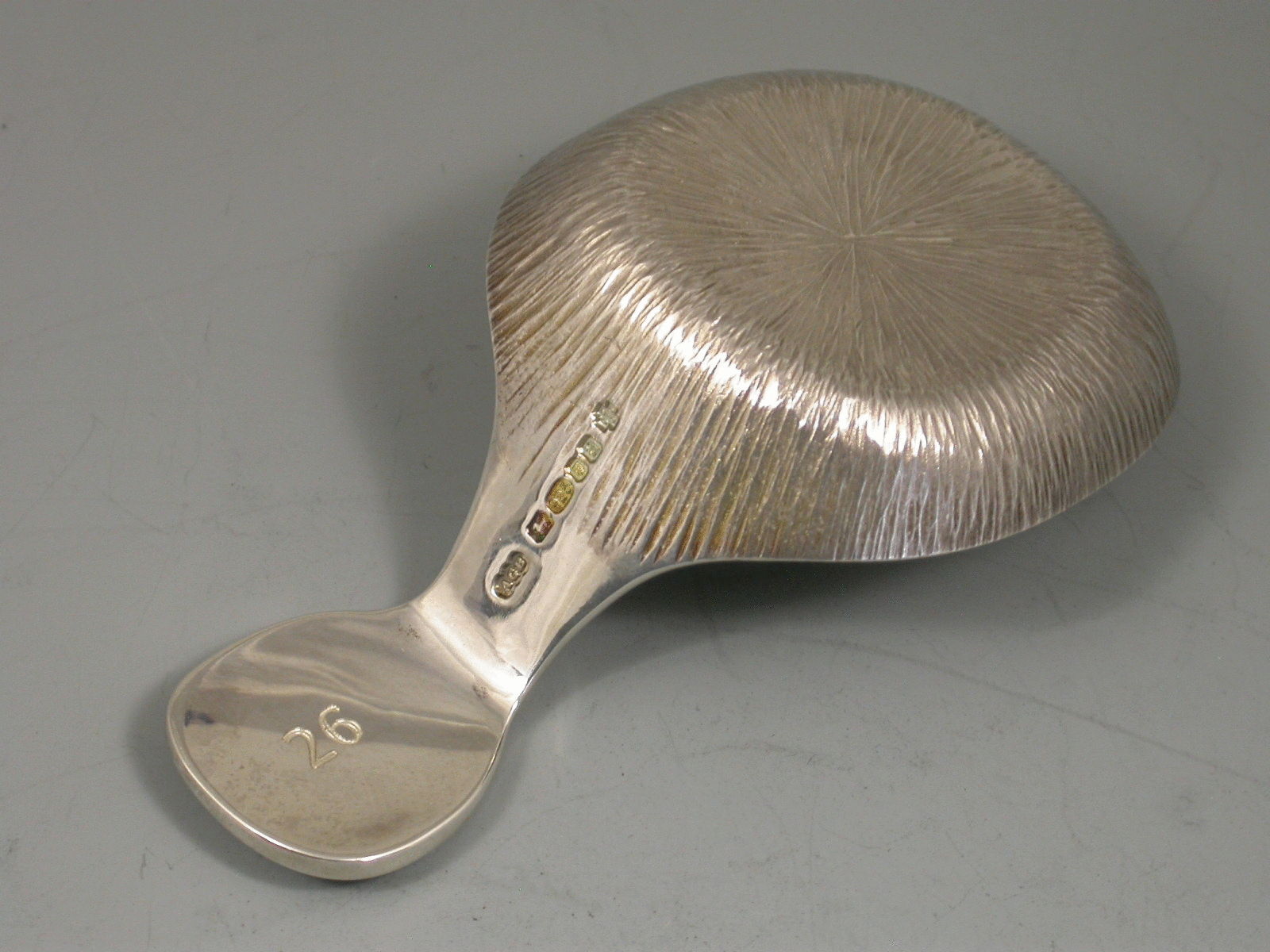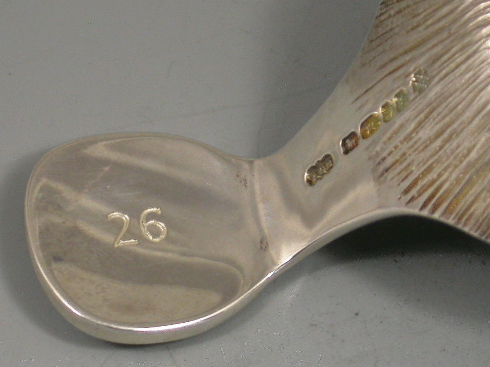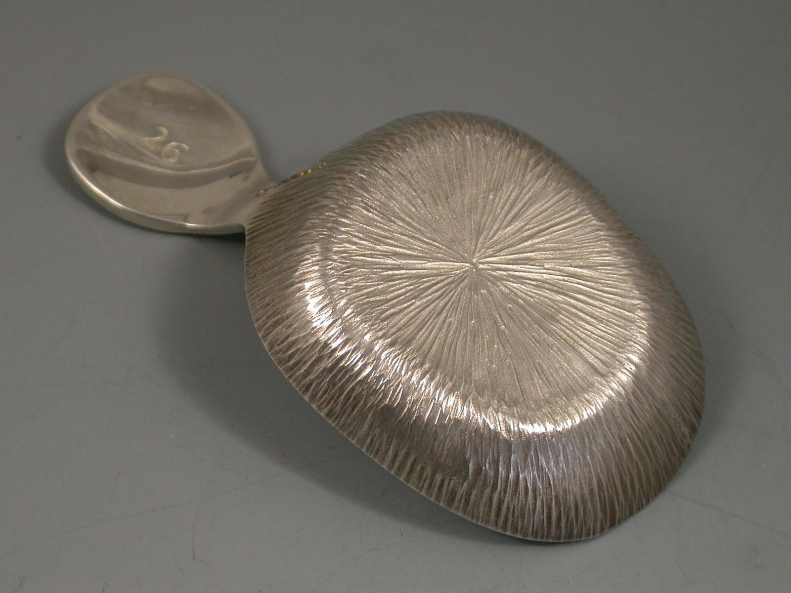 A fine quality heavy cast Commemorative silver Caddy Spoon produced for the Society of Caddy Spoon Collectors to celebrate the Millennium, the handle punched and gilded with the Societies eagles wing insignia, the bowl of 'frying pan' form, the base and outside of the bowl with textured bark design. Made as a limited edition, this one number 26.