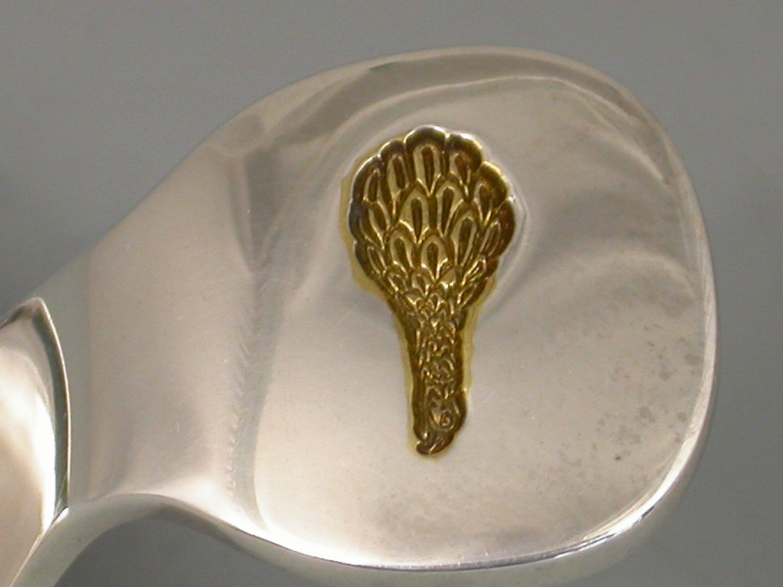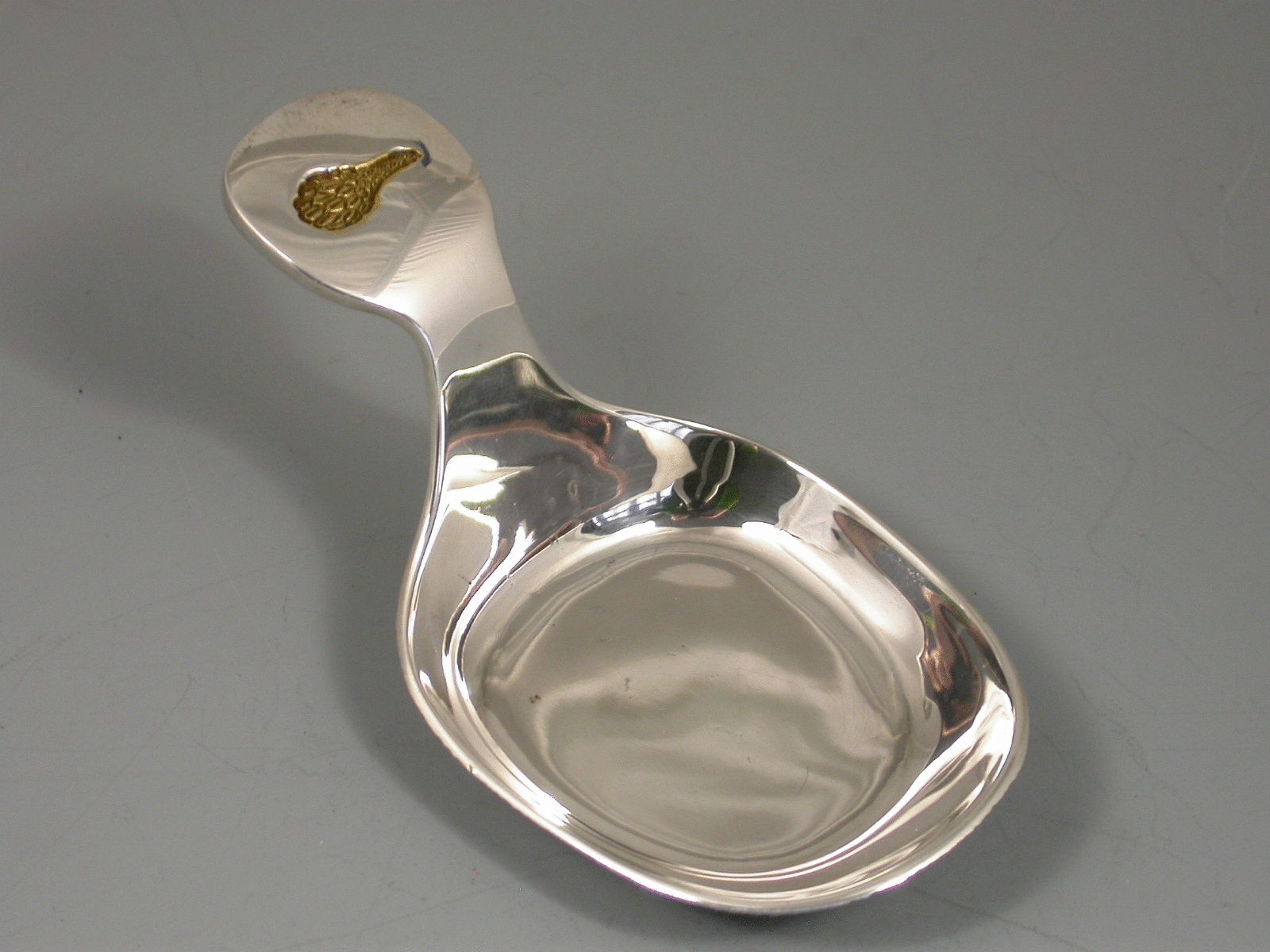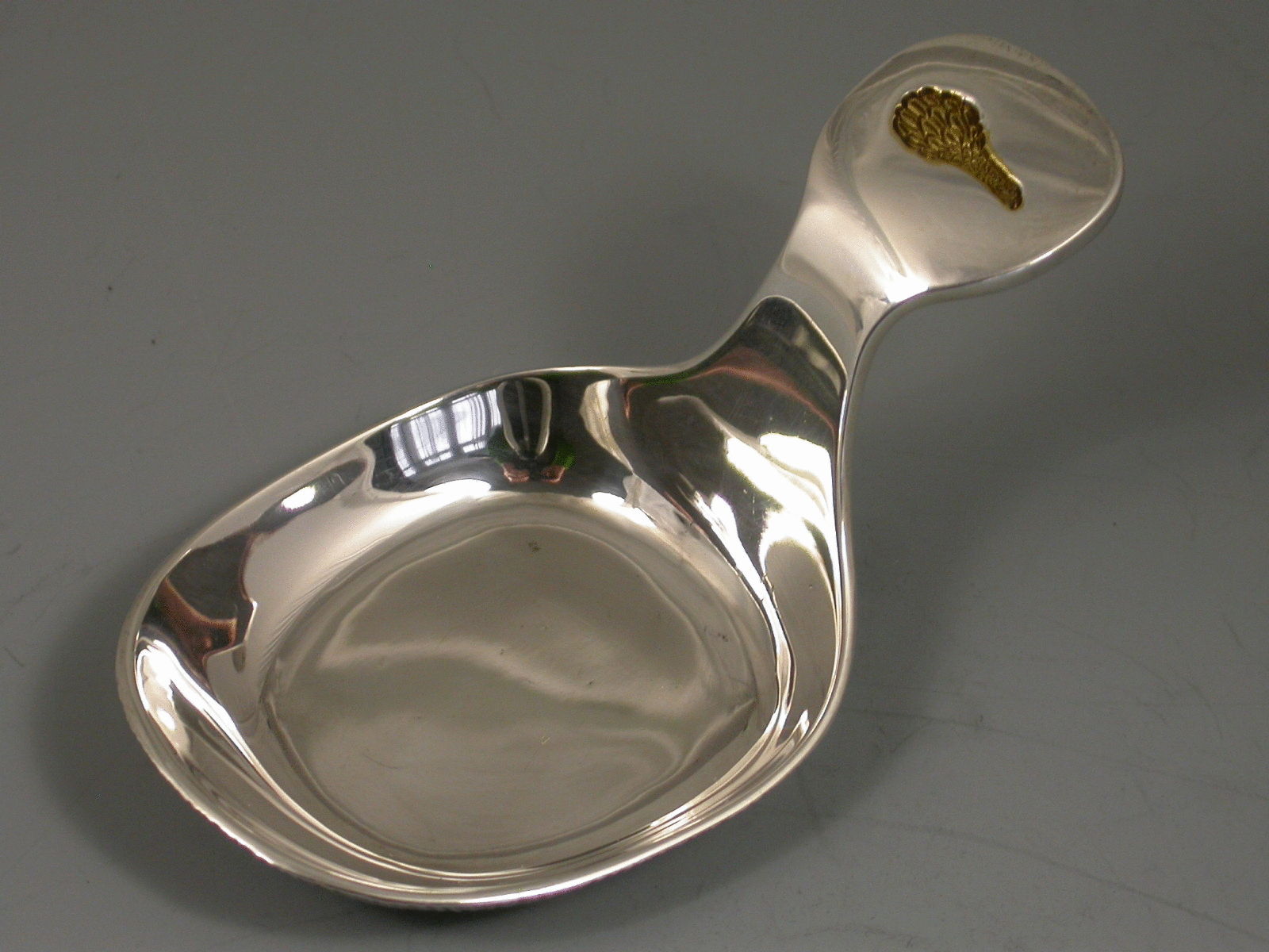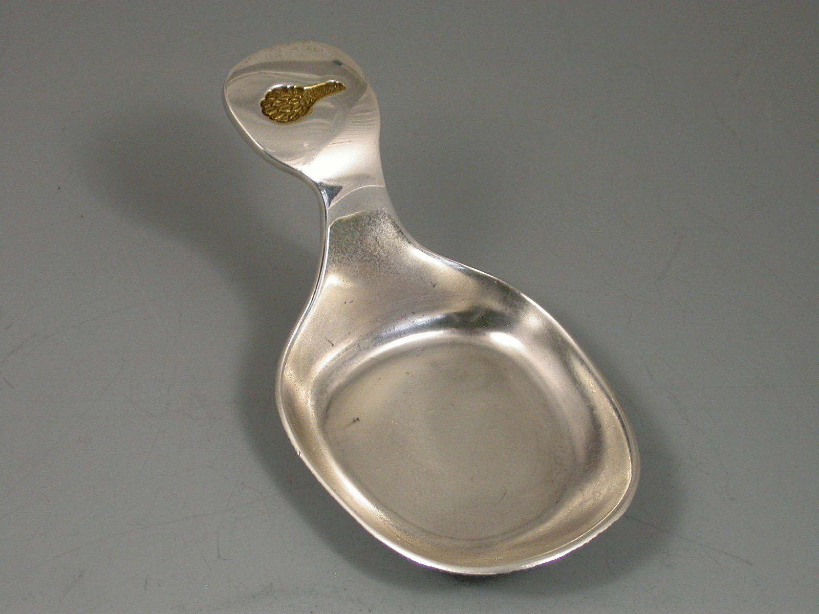 A fine quality heavy cast Commemorative silver Caddy Spoon produced for the Society of Caddy Spoon Collectors to celebrate the Millennium, the handle punched and gilded with the Societies eagles wing insignia, the bowl of 'frying pan' form, the base and outside of the bowl with textured bark design. Made as a limited edition, this one number 26.