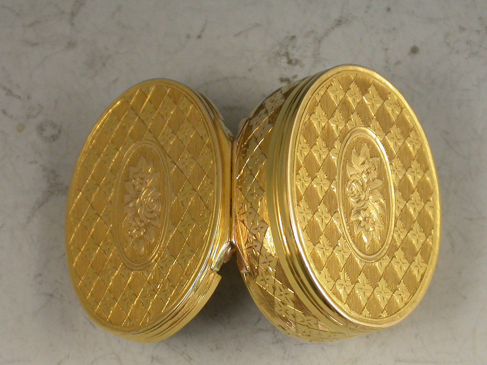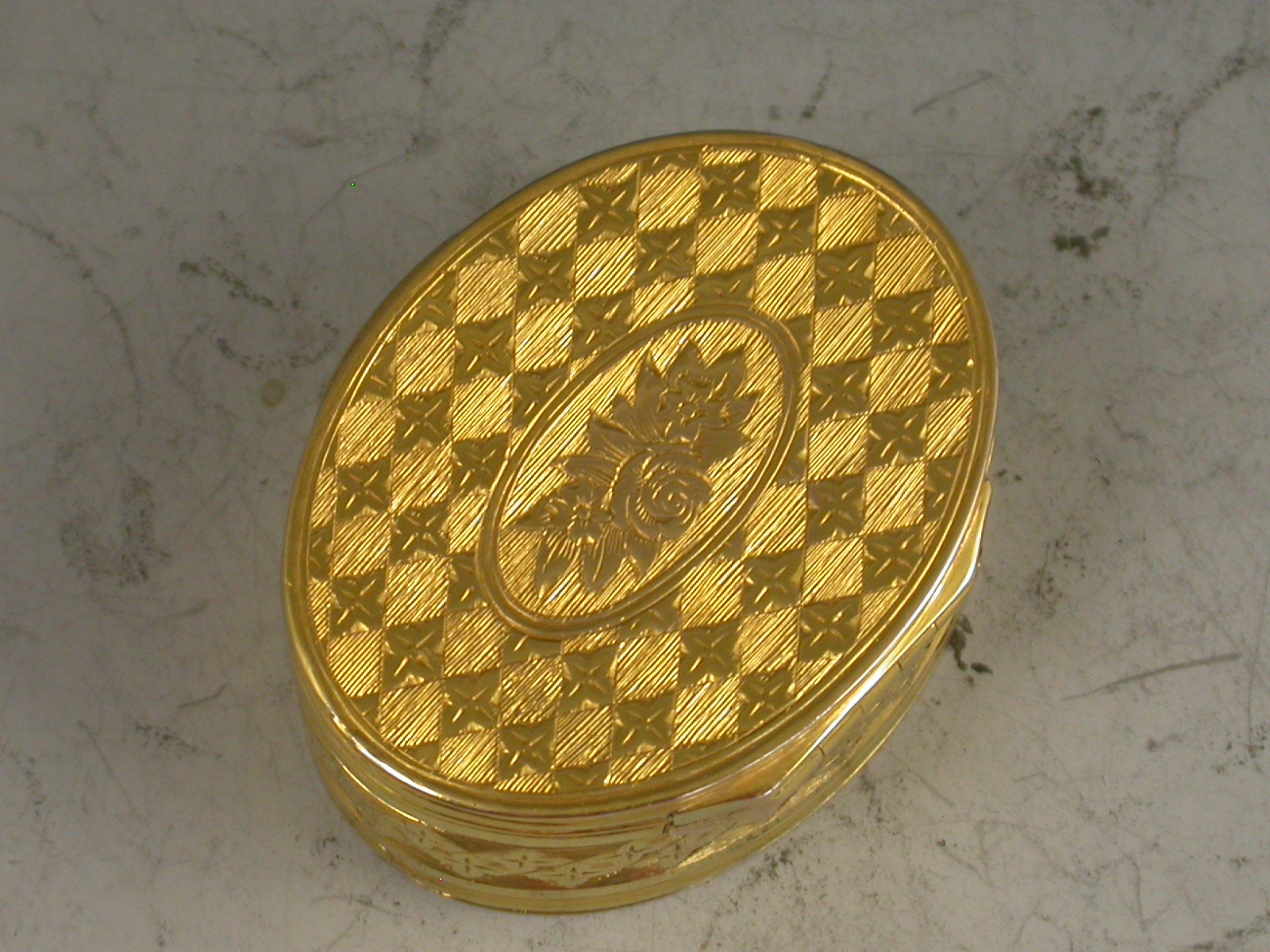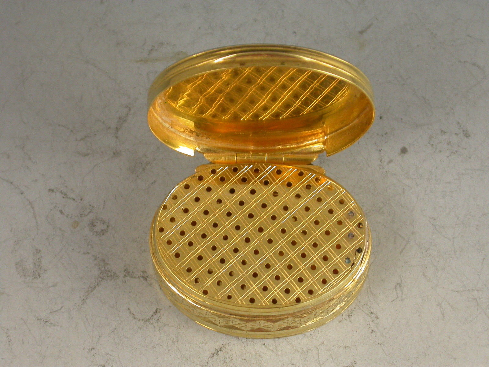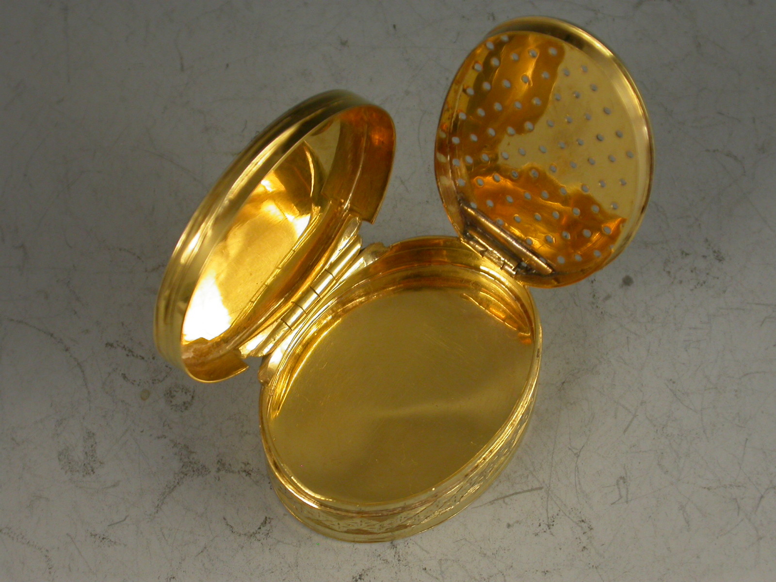 A very fine quality early 19th century gold Vinaigrette of oval form with exquisite checkerboard and floret type engraving, an oval cartouche to both the lid and the base engraved with a bouquet of flowers. Simply pierced internal hinged grille.