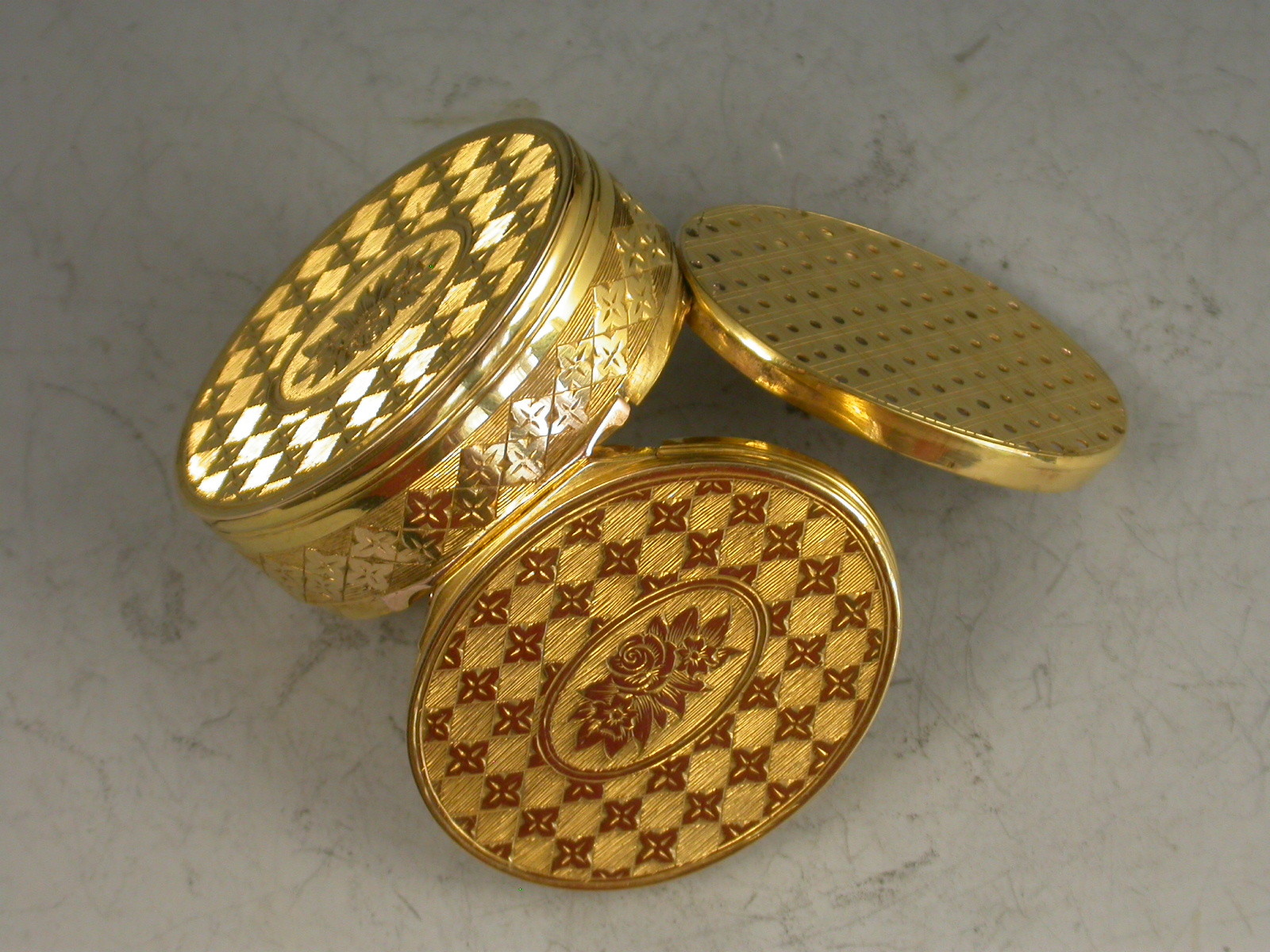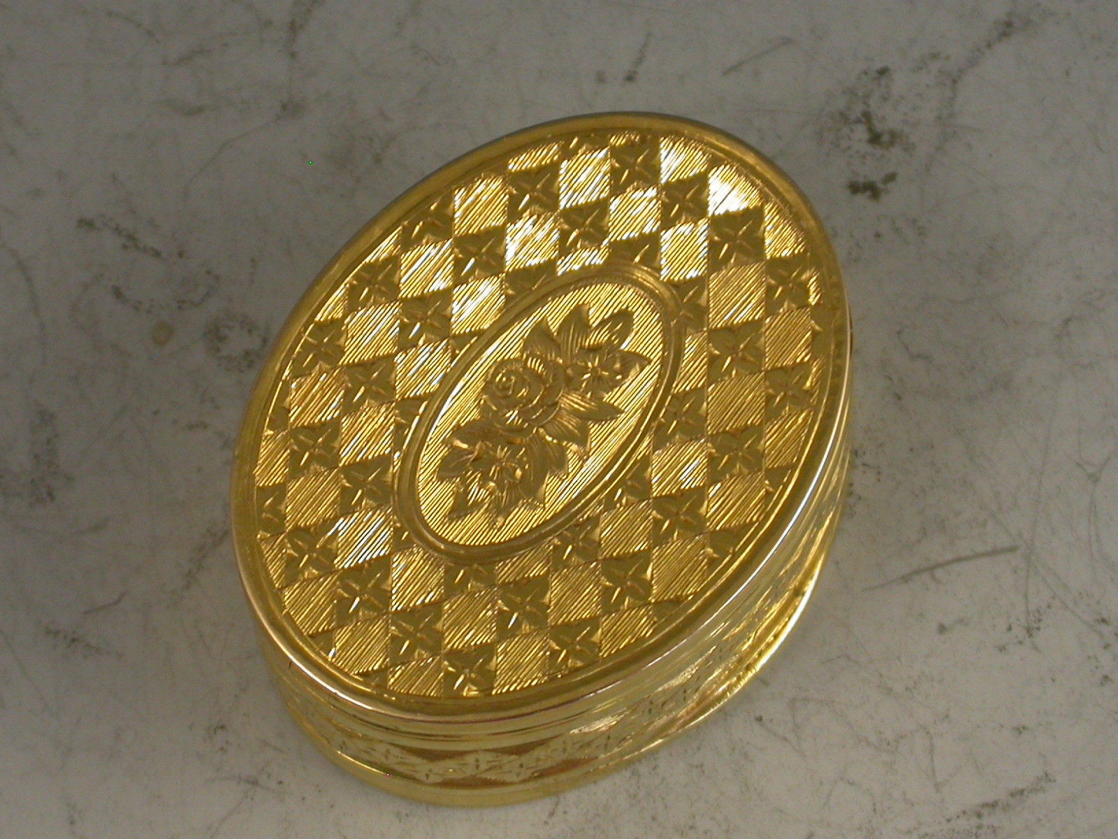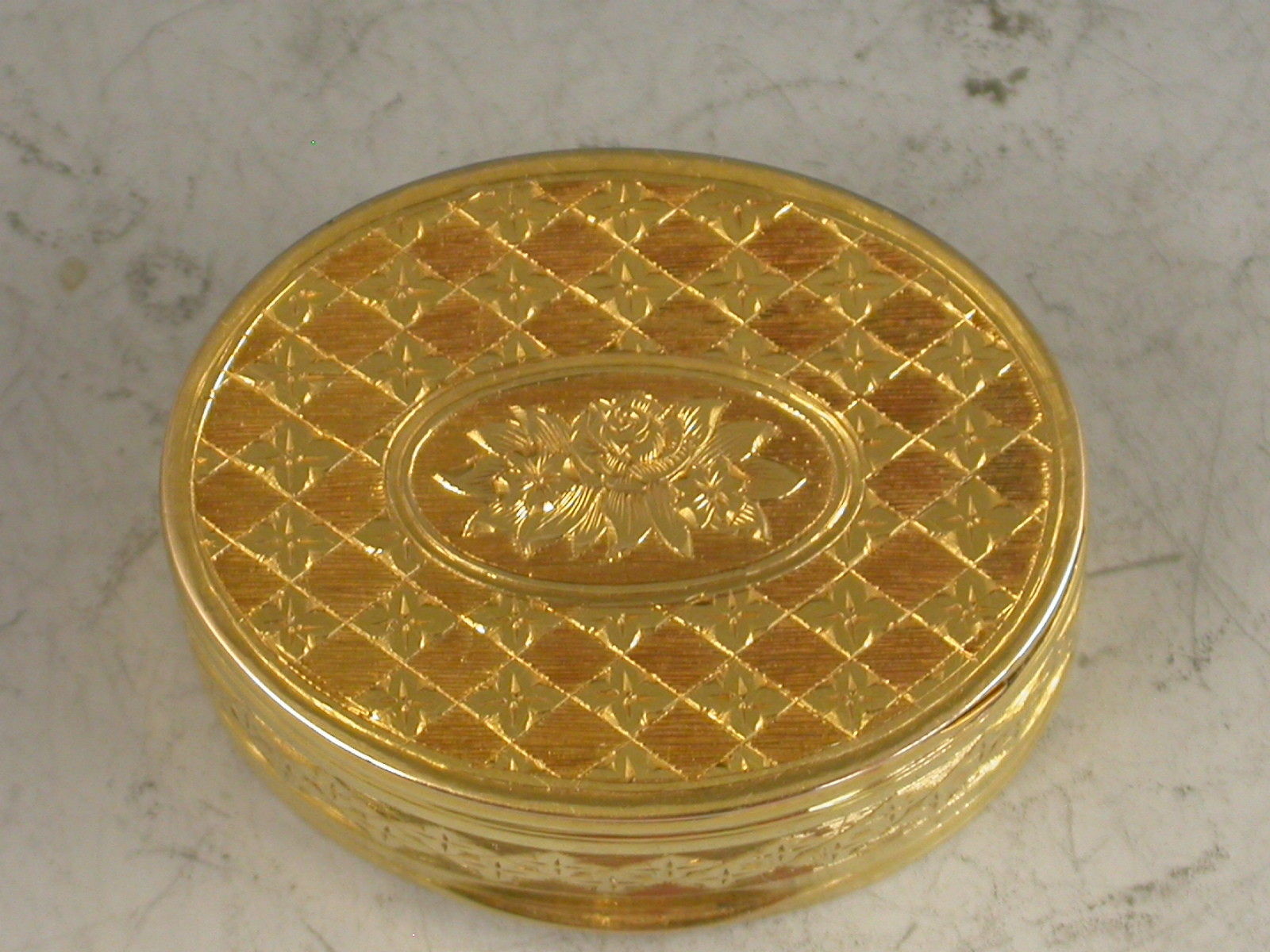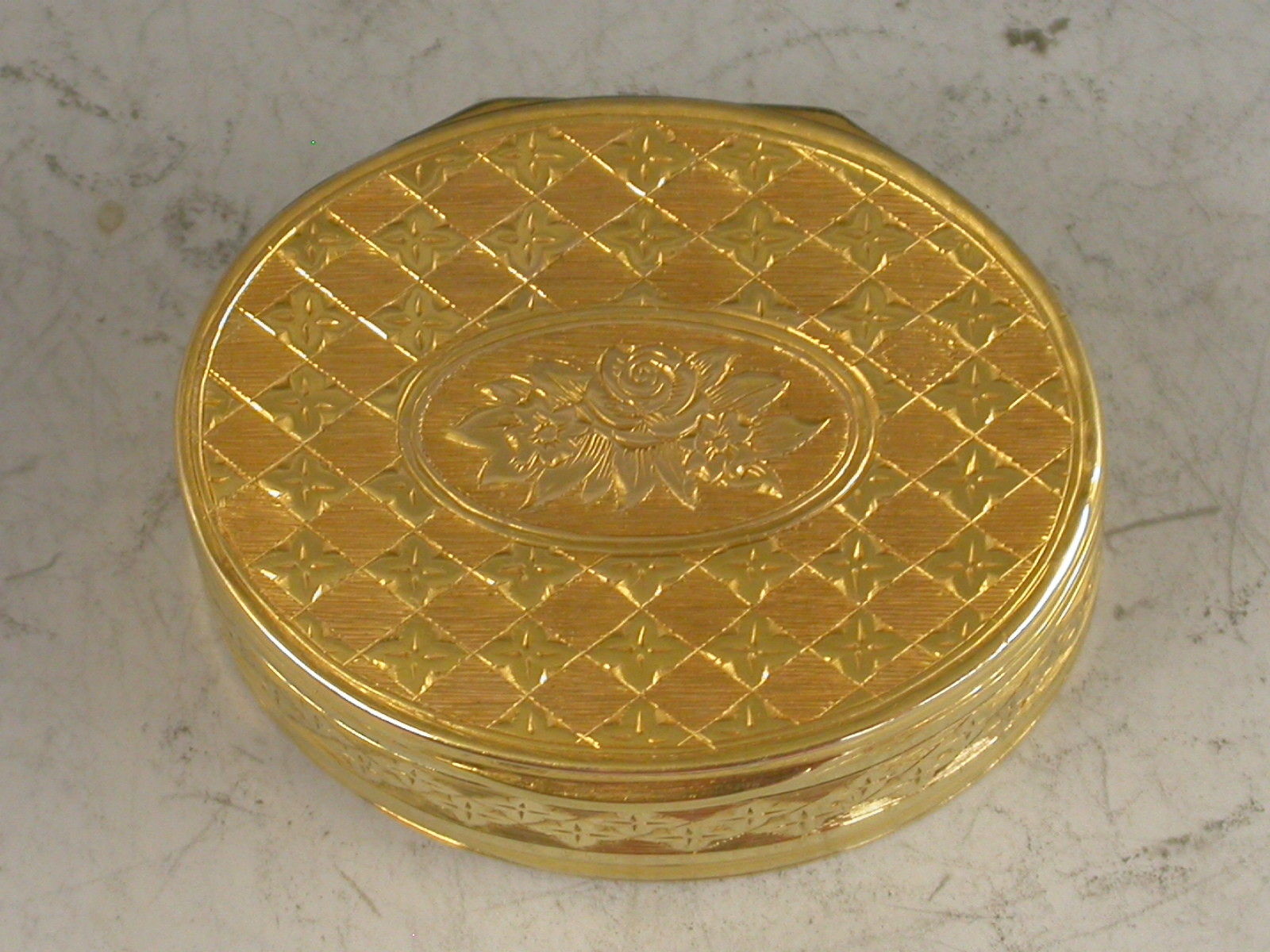 A very fine quality early 19th century gold Vinaigrette of oval form with exquisite checkerboard and floret type engraving, an oval cartouche to both the lid and the base engraved with a bouquet of flowers. Simply pierced internal hinged grille.