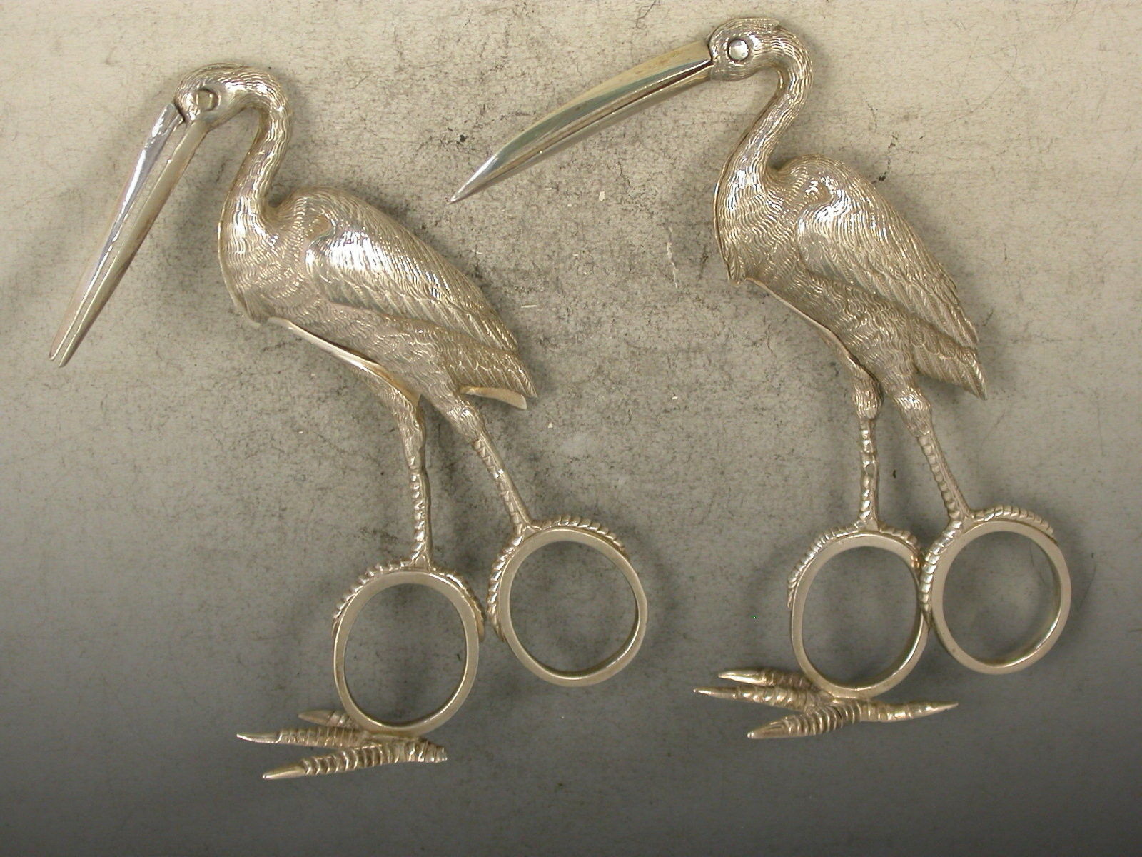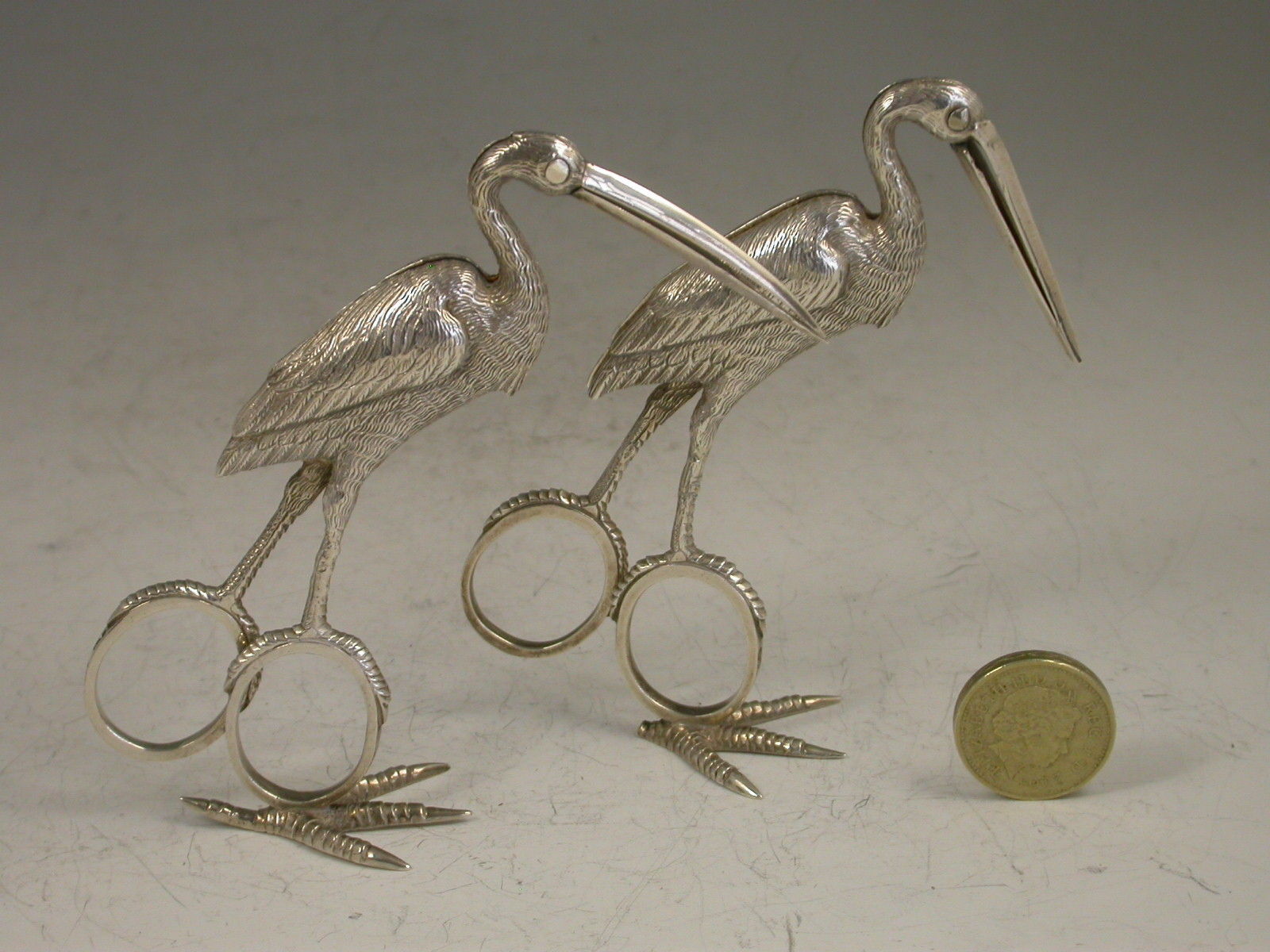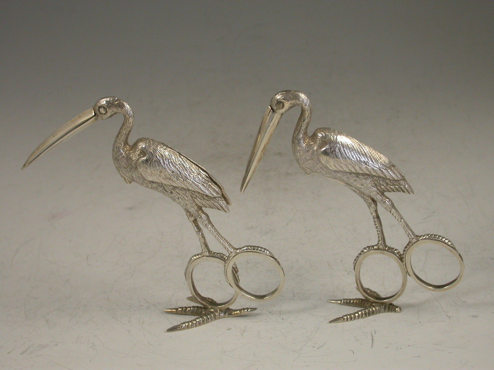 Two pairs of exceptional quality Victorian heavy cast silver Ribbon Threaders of a large size, made in the form of Storks with finely detailed plumage, standing on four claw feet.