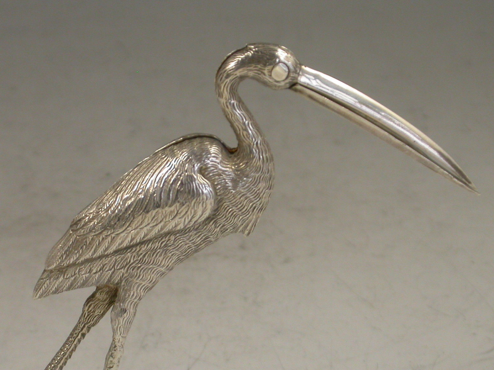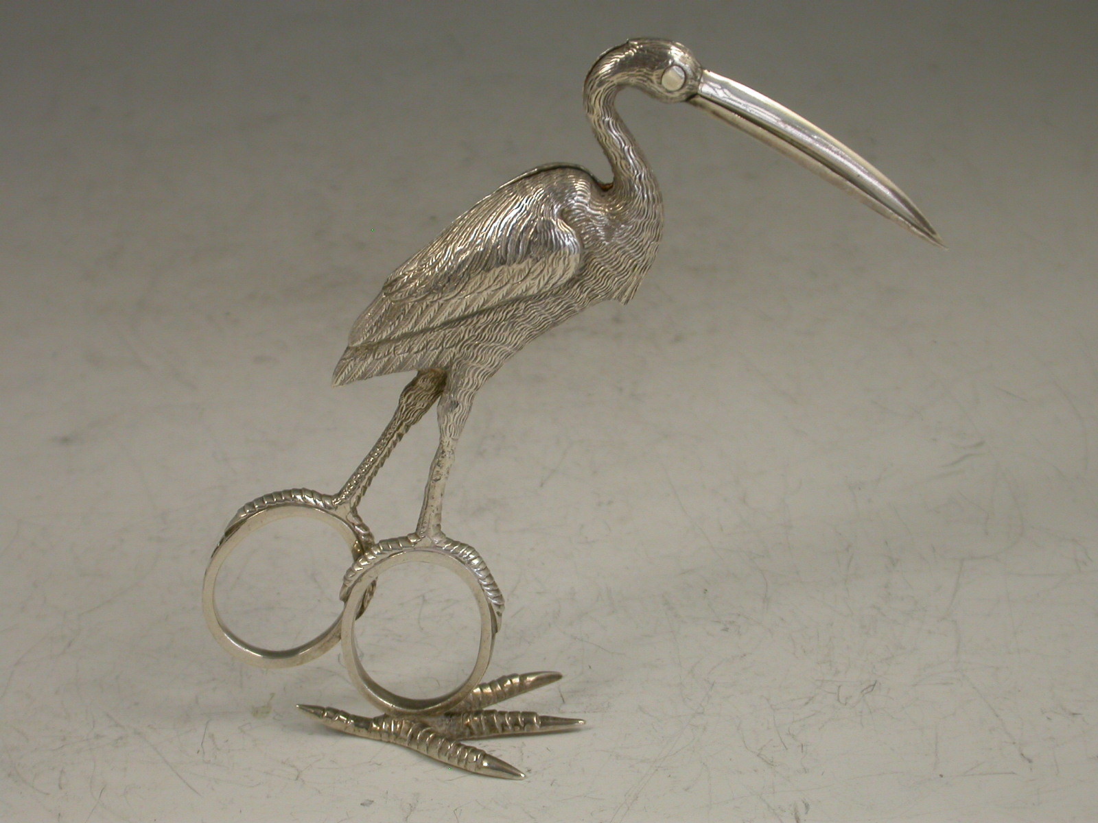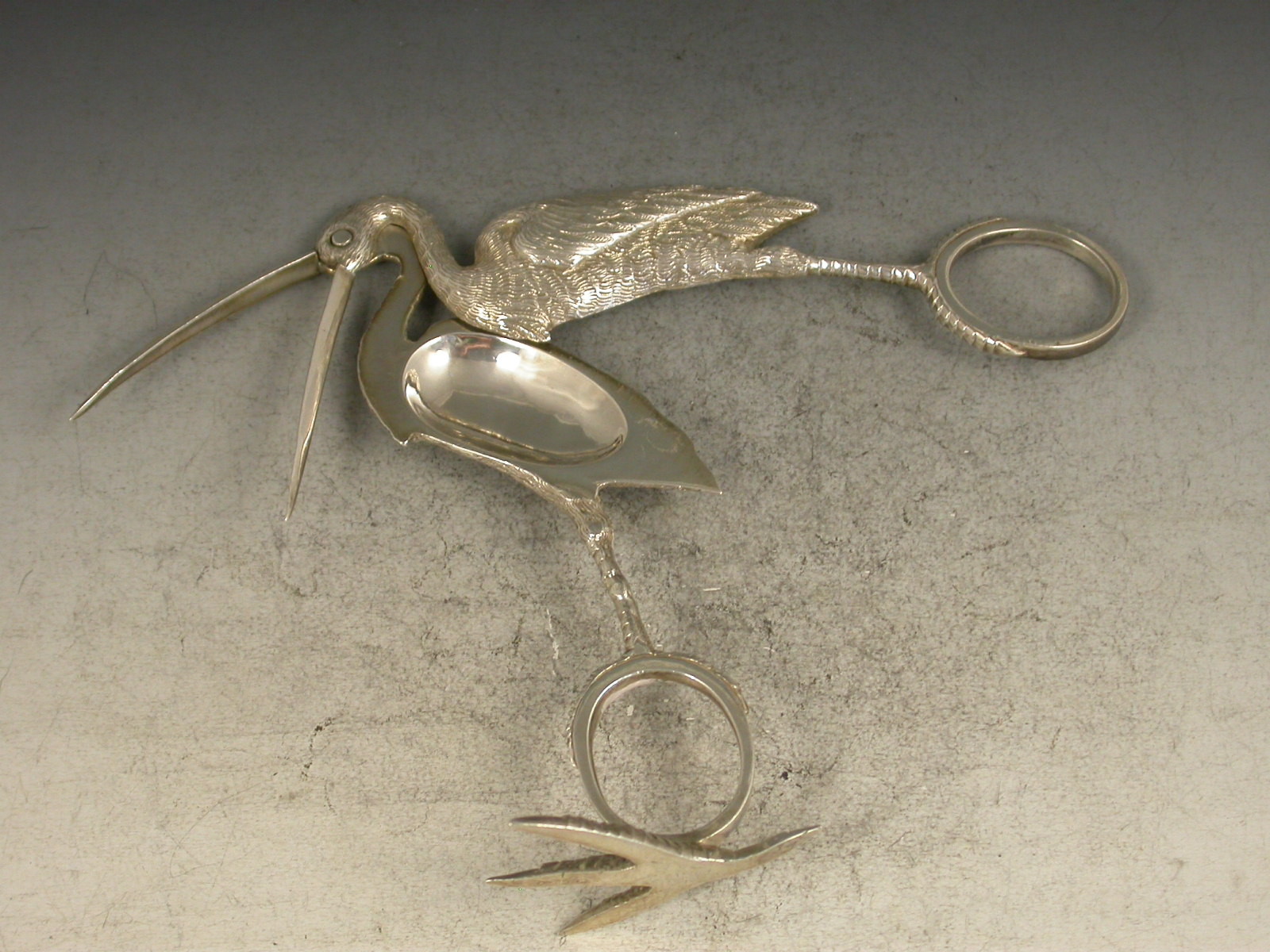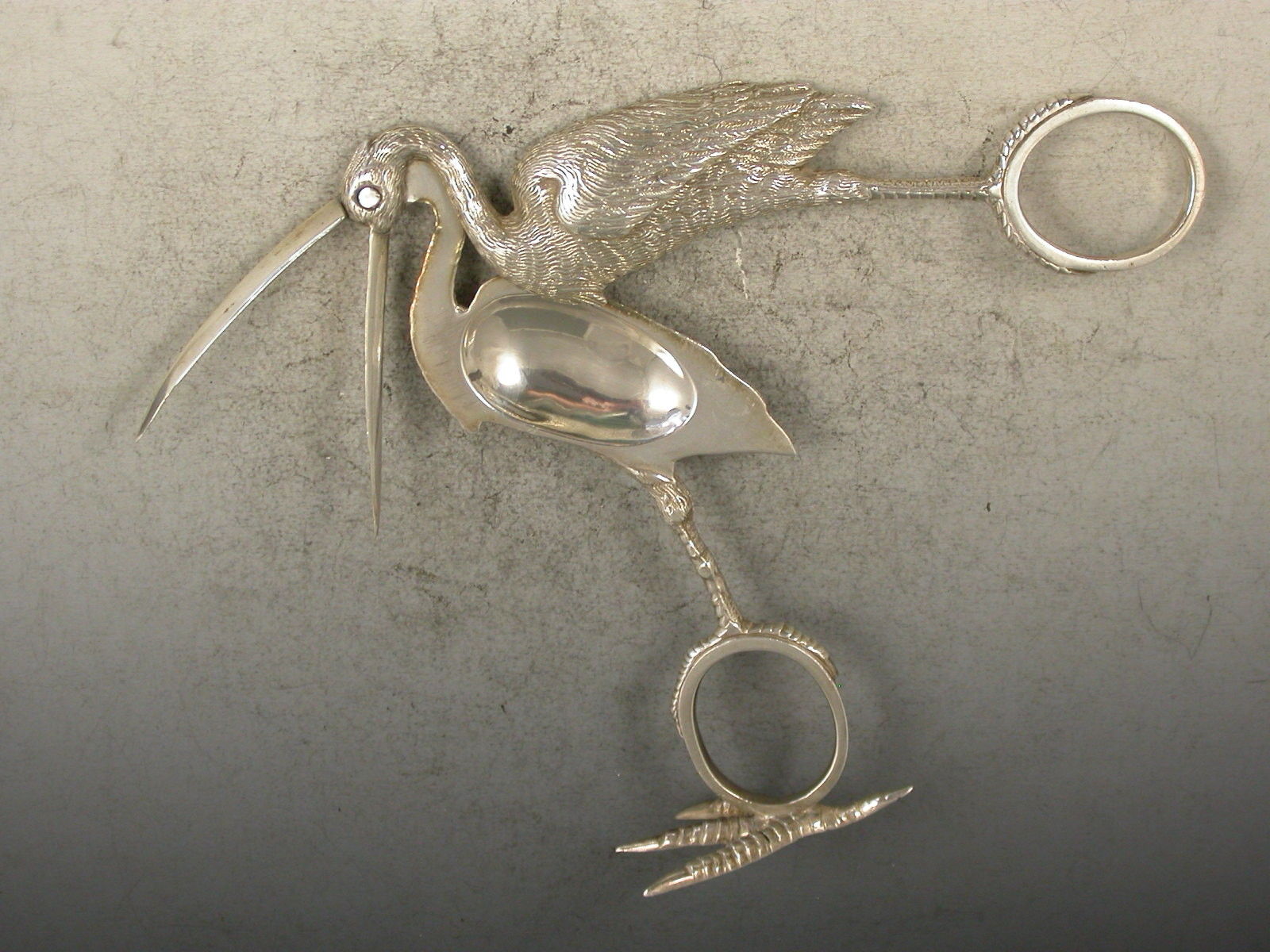 Two pairs of exceptional quality Victorian heavy cast silver Ribbon Threaders of a large size, made in the form of Storks with finely detailed plumage, standing on four claw feet.