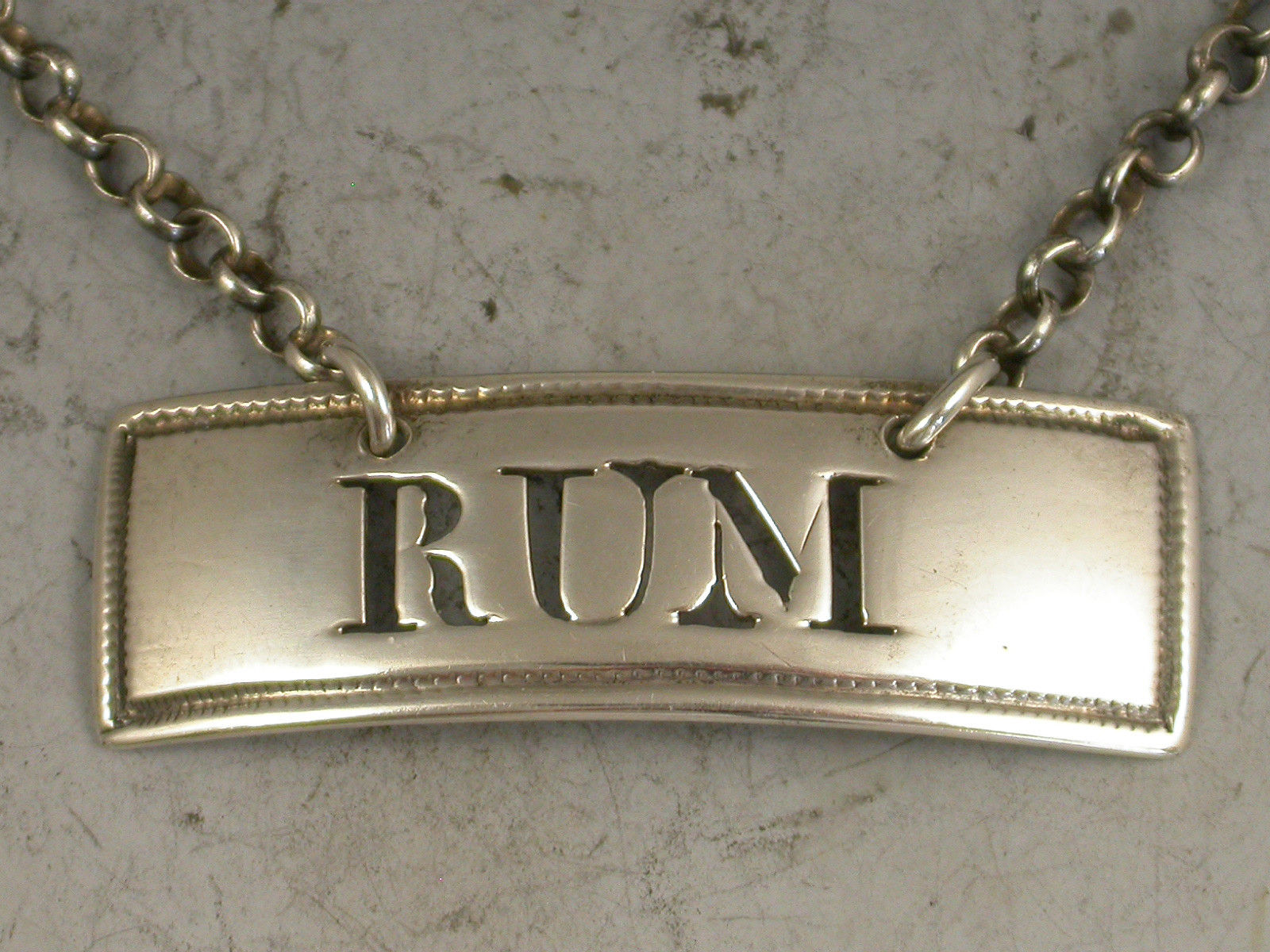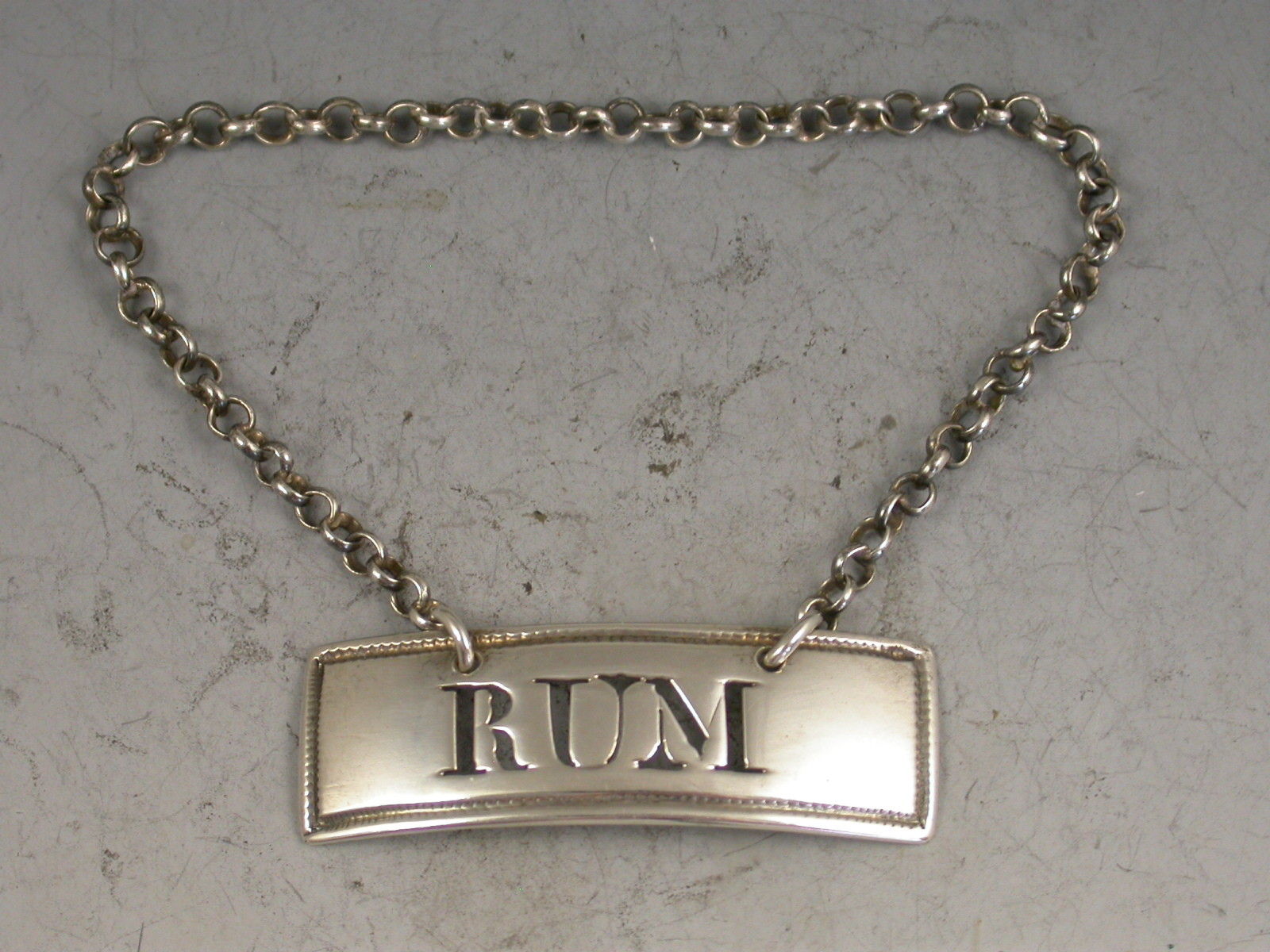An unusual Georgian silver Wine Label of curved narrow rectangular form with 'crimped' border, pierced for Rum.