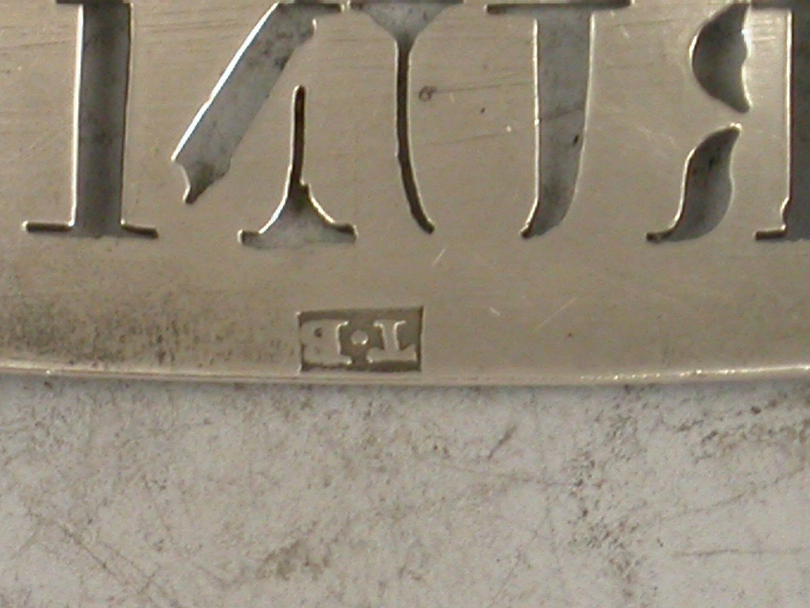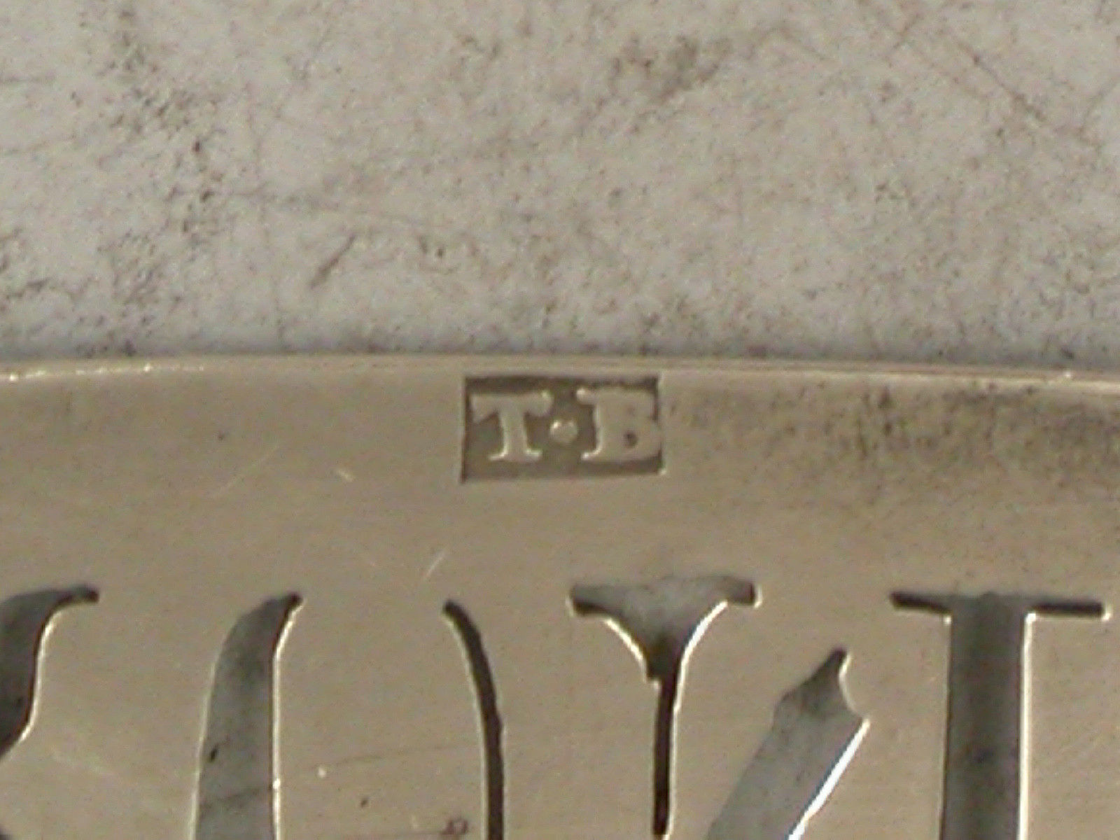 Makers mark only - 'T.B', possibly for Thomas Wilkes Barker of London c1810, but looks earlier and possibly Provincial. (See a very similar pair for Madeira and Port with another unattributed makers mark - 'B over T.I' Stock No: TRS170614A.)