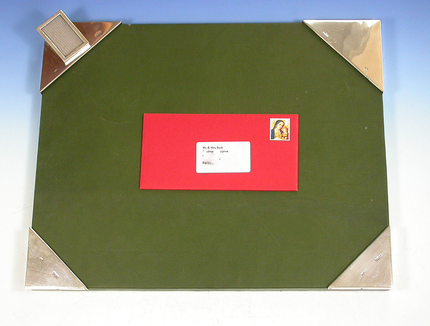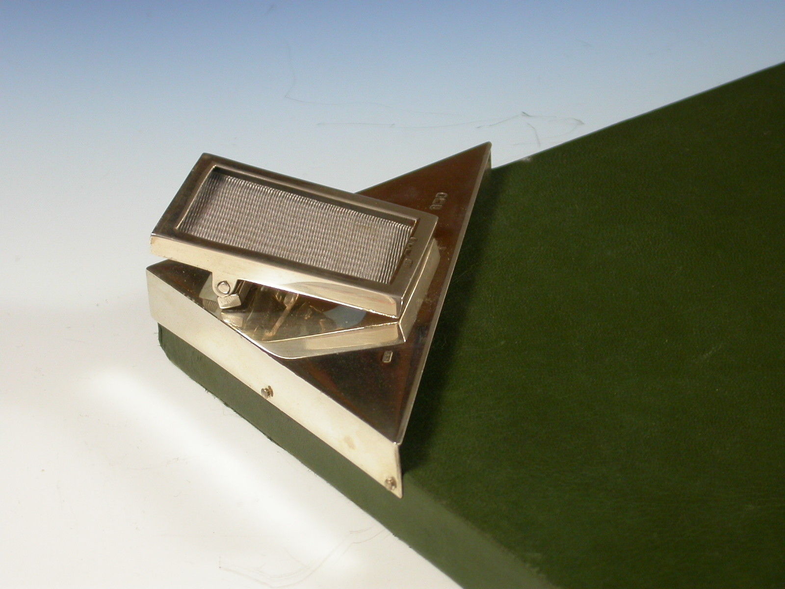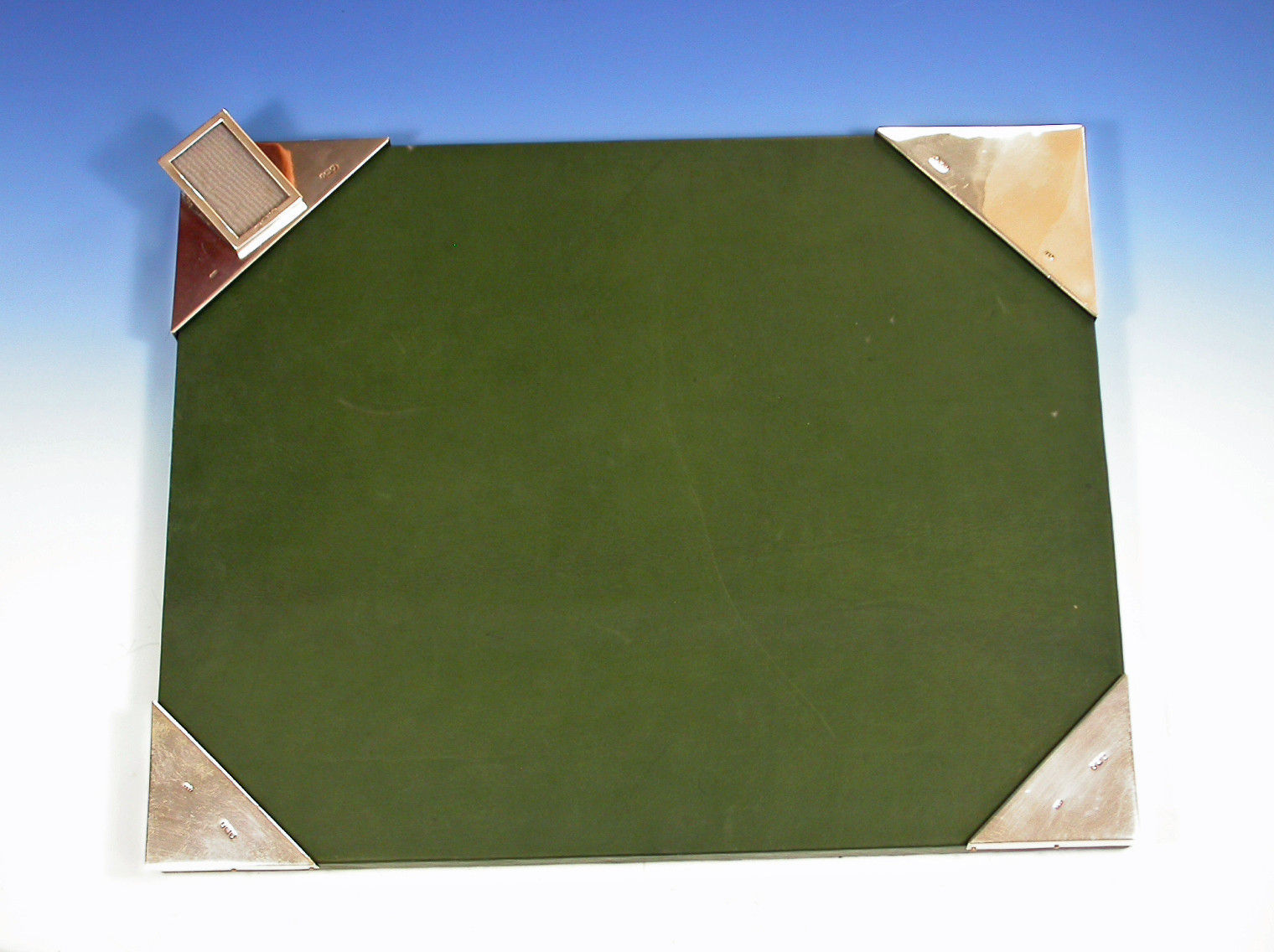An unusual early Edwardian silver mounted green leather covered Desk Blotter, the blotting paper held in place by four triangular silver mounts to the corners, one surmounted by a sprung silver letter clip / photo frame.
