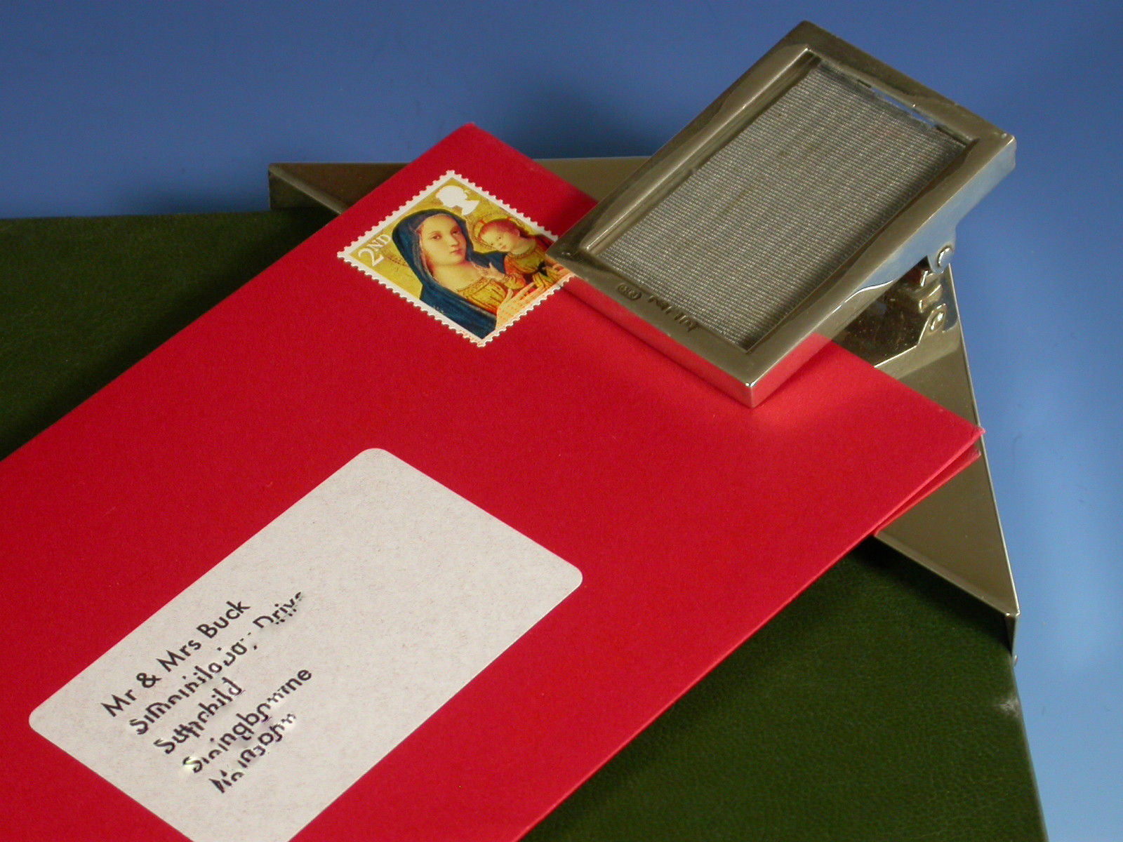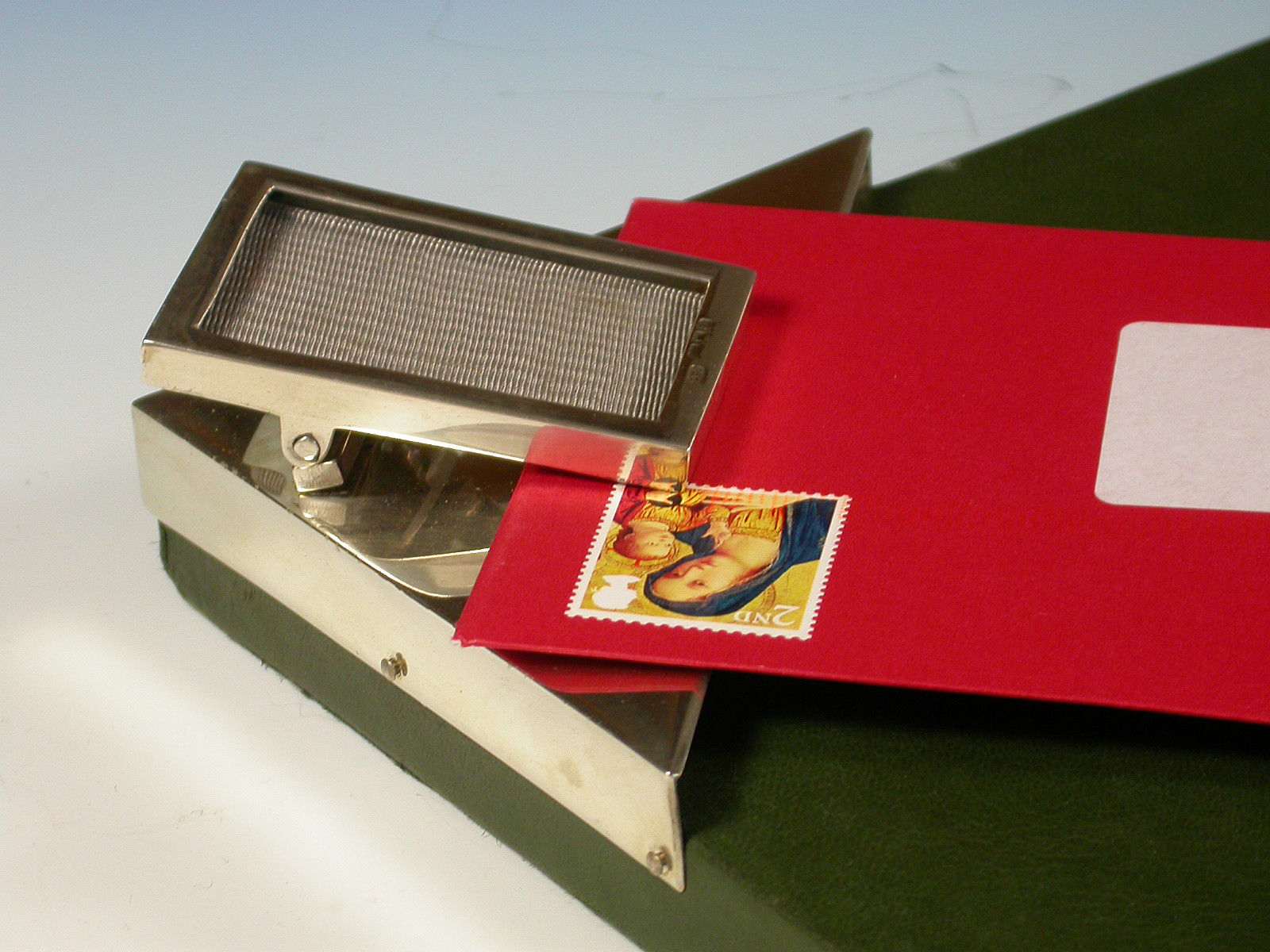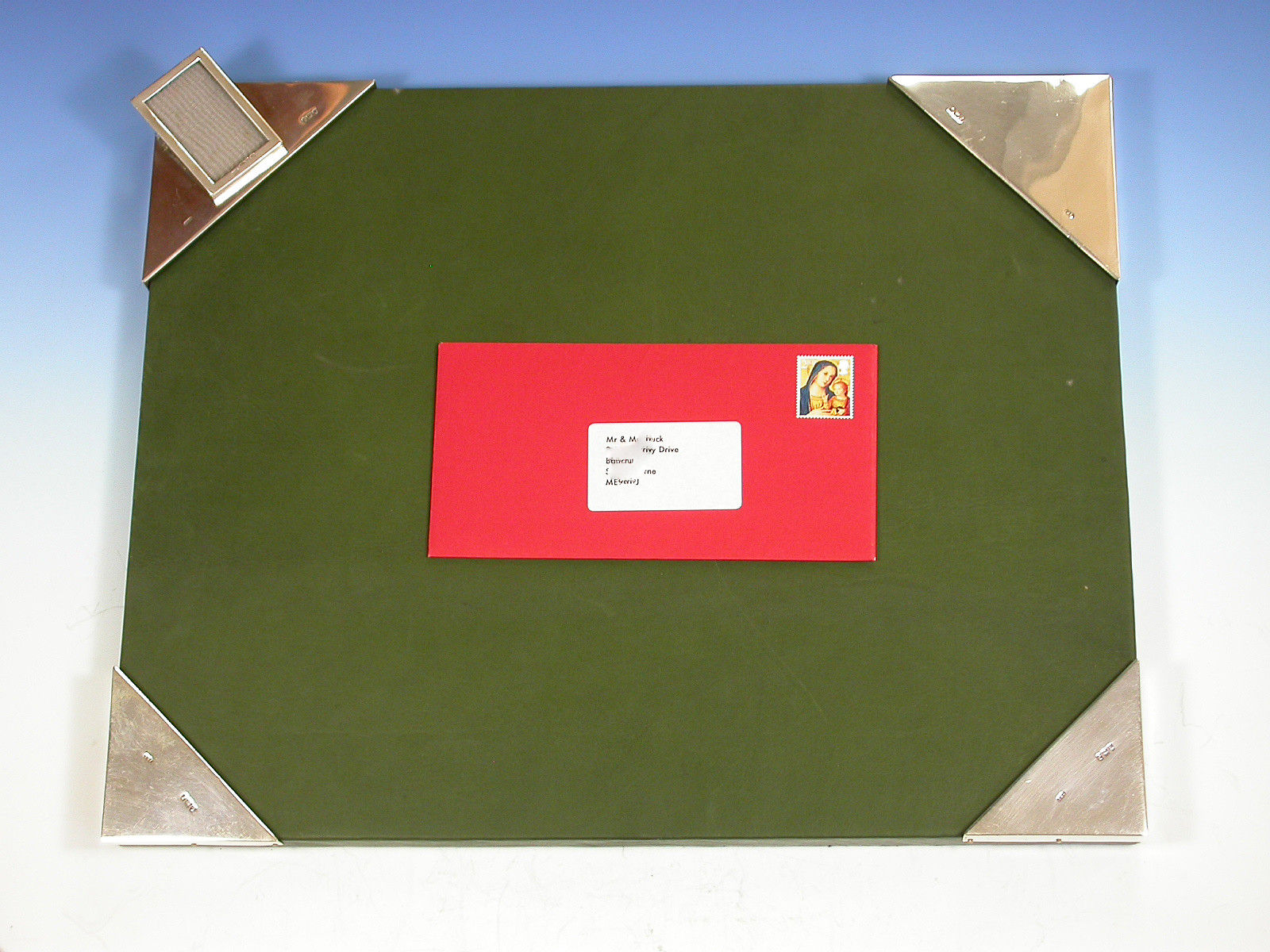 An unusual early Edwardian silver mounted green leather covered Desk Blotter, the blotting paper held in place by four triangular silver mounts to the corners, one surmounted by a sprung silver letter clip / photo frame.