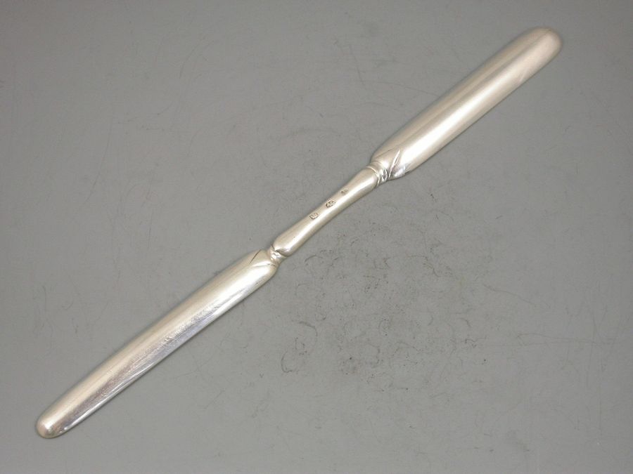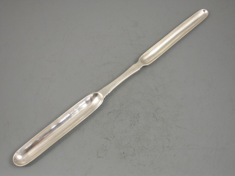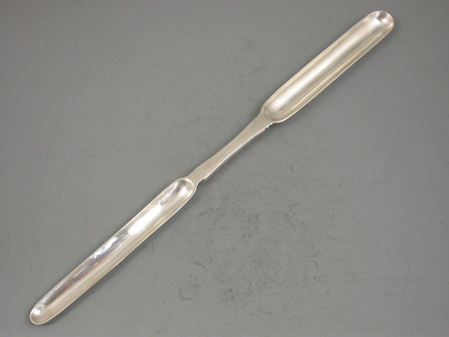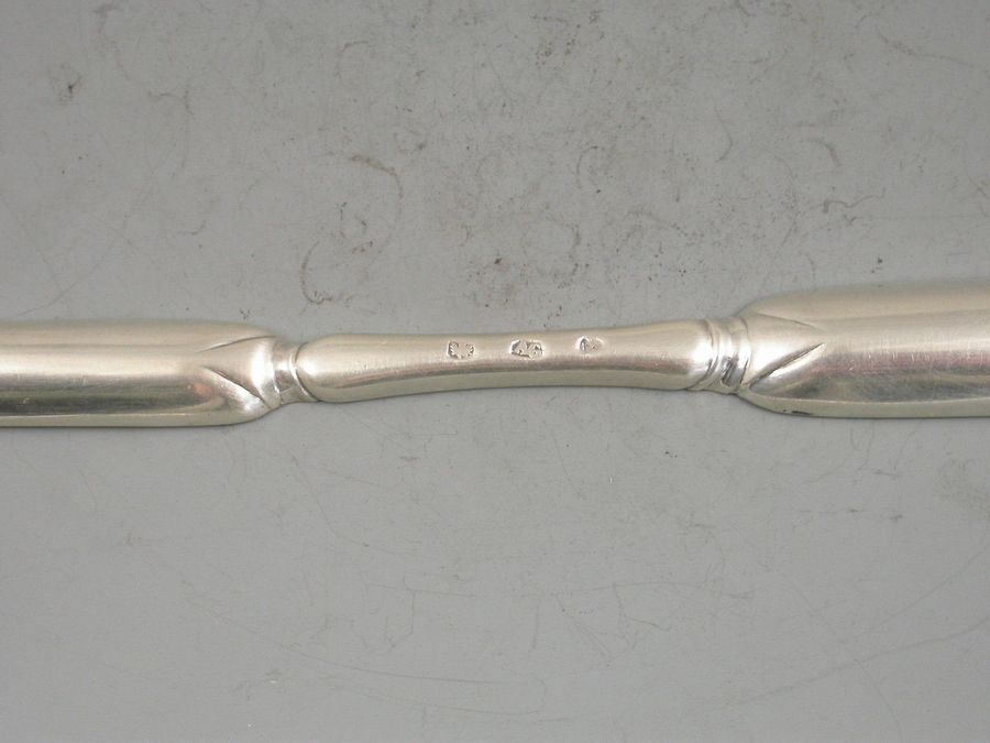 A rare and unusual 18th century Scottish silver Marrow Scoop, the stem of baluster form with twin collars and miniature rat-tails to the two bowls.