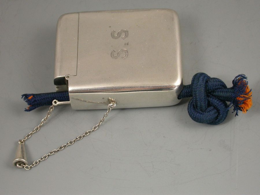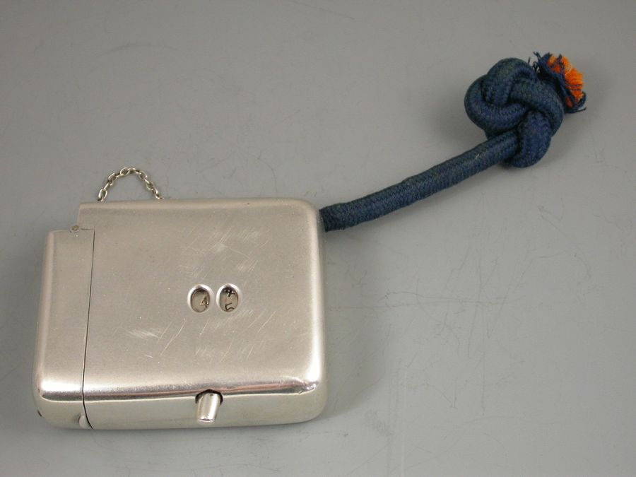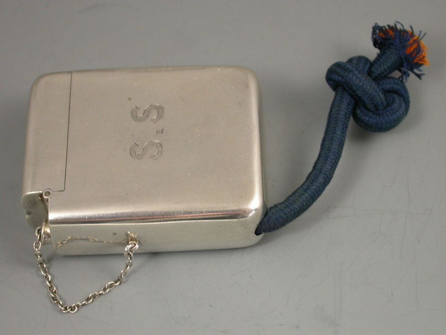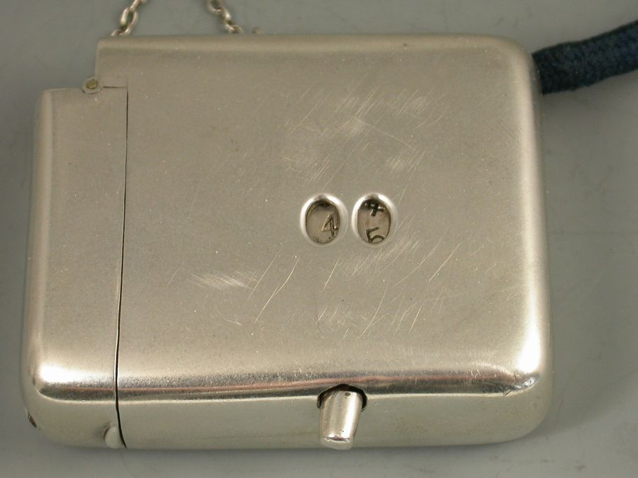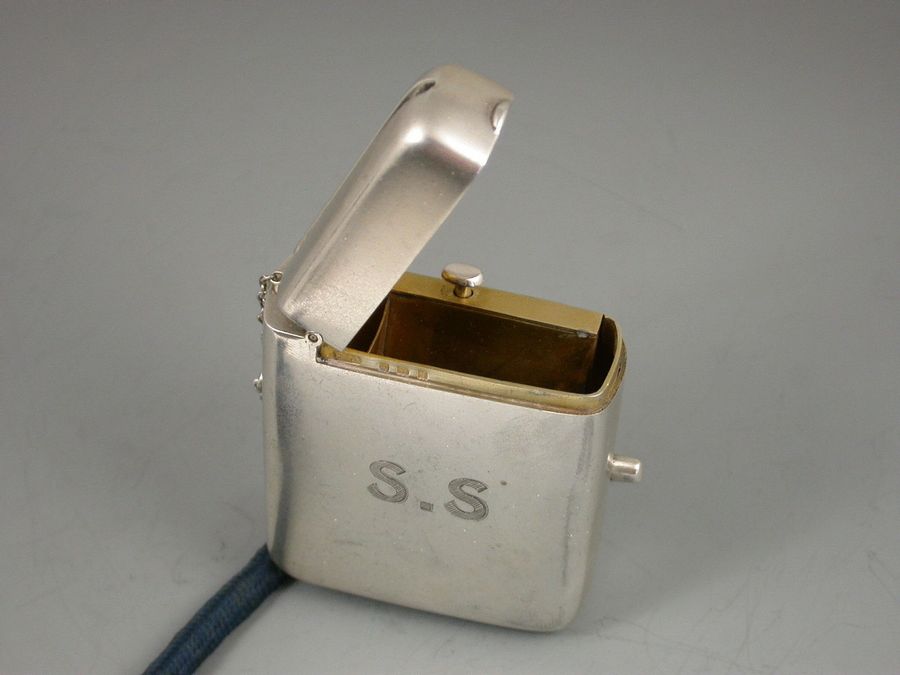 A very unusual and large Edwardian silver heavy duty Vesta Box with slow match or taper tube to one side sealed by a stopper on a chain. Two manually operated push button counter devices (one inside the cover) operating rotating counter dials, one for tens and one for units, the numbers appearing in oval apertures to one side. The front engraved with initials 'S.S'. Possibly a game counter for shot birds or perhaps a device for counting passengers boarding a ship.