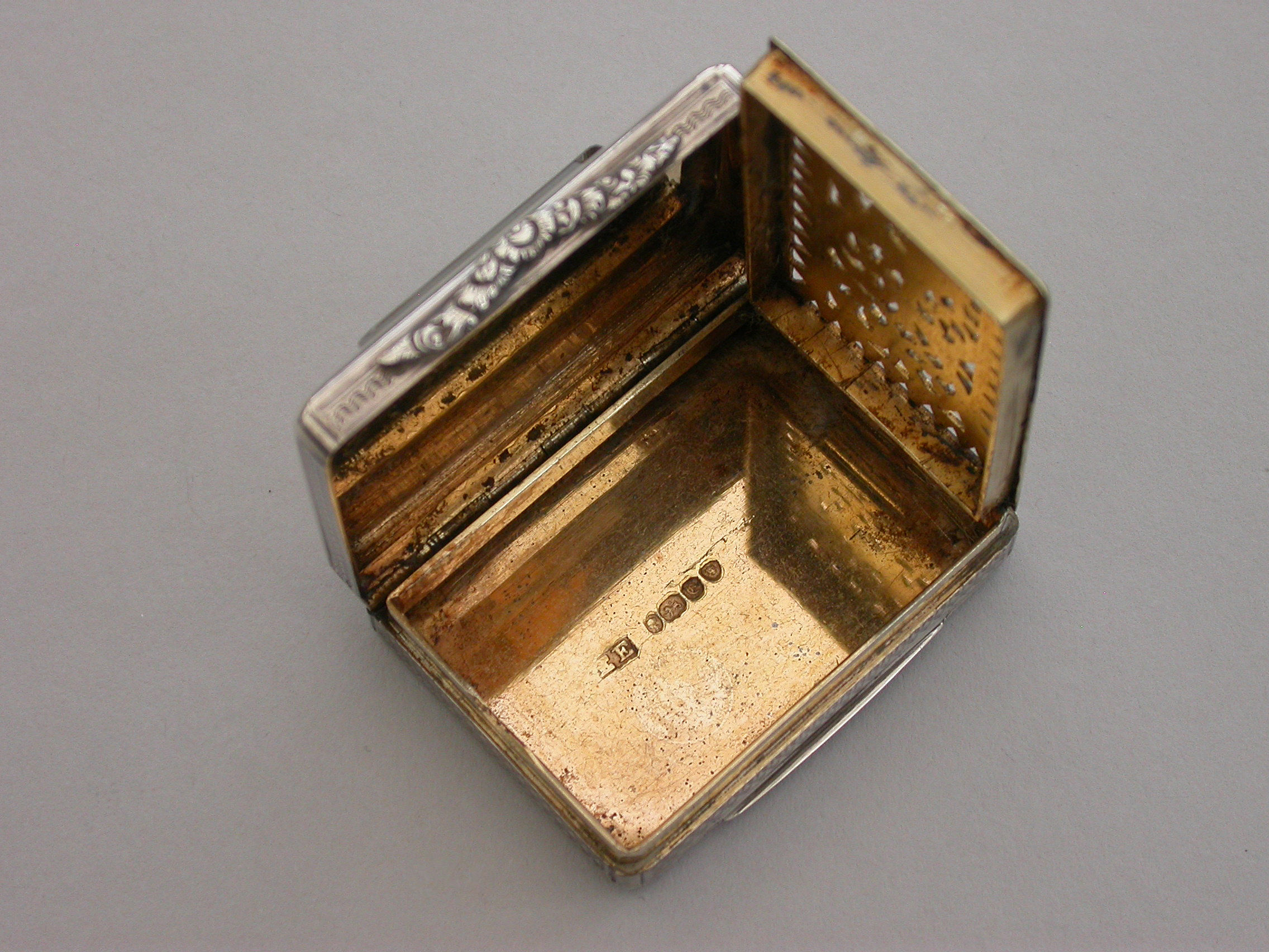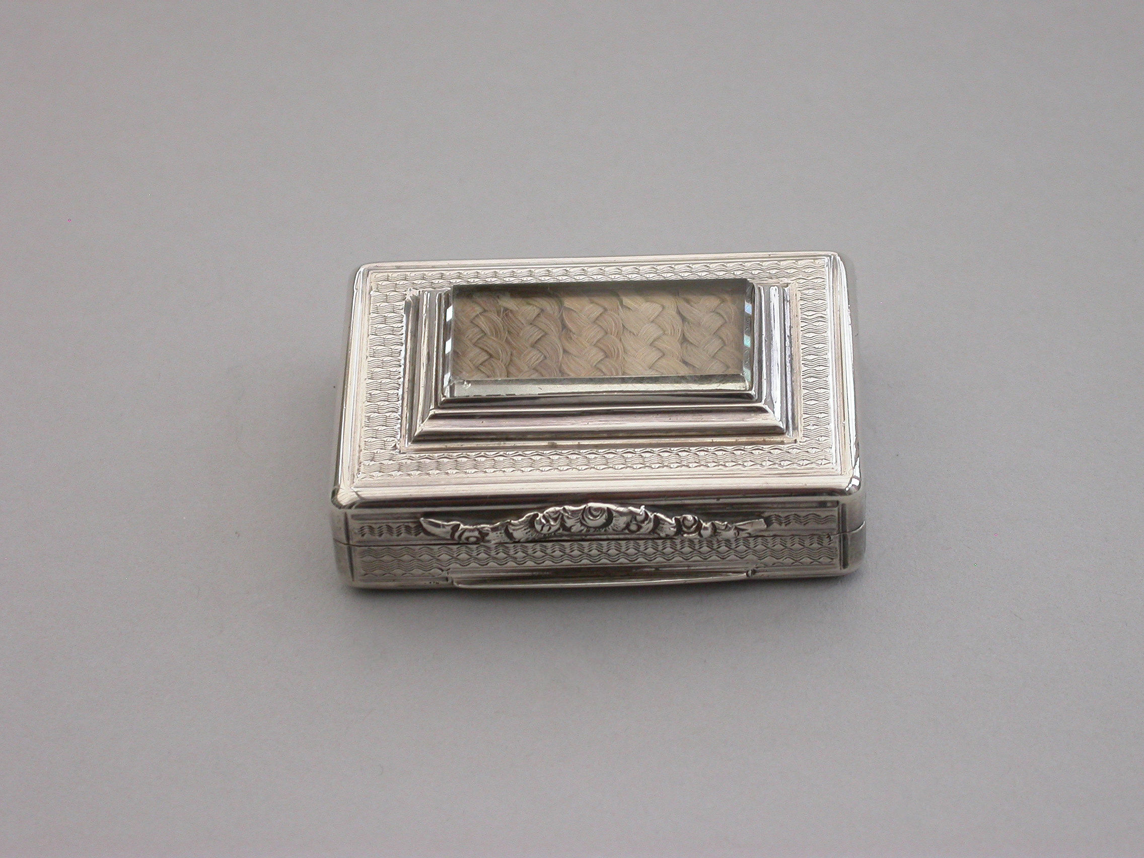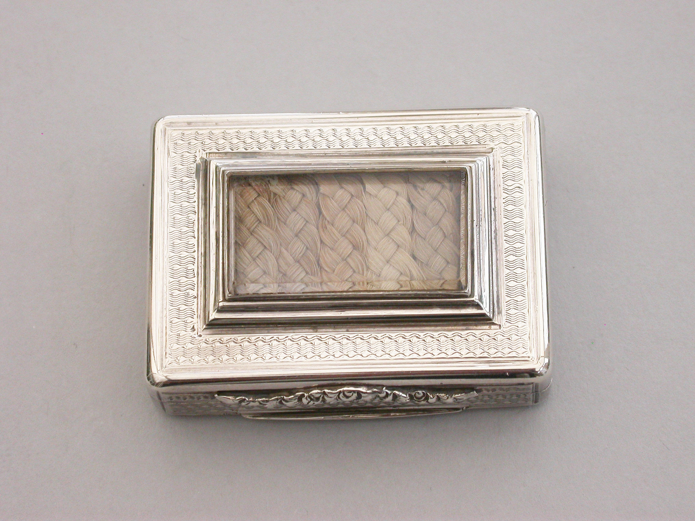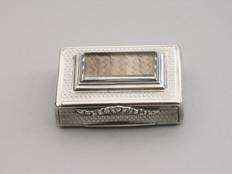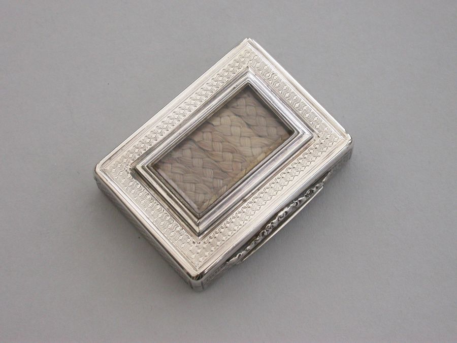 A fine quality and unusual early Victorian silver Memorial Vinaigrette of large rounded rectangular form with raised serpentine thumbpiece, engine turned decoration to the lid, sides and base, a ""locket"" of five strips of plaited hair inset into the cover behind a beveled glass panel, the silver gilt interior with finely pierced grille with ""dog-tooth"" border.