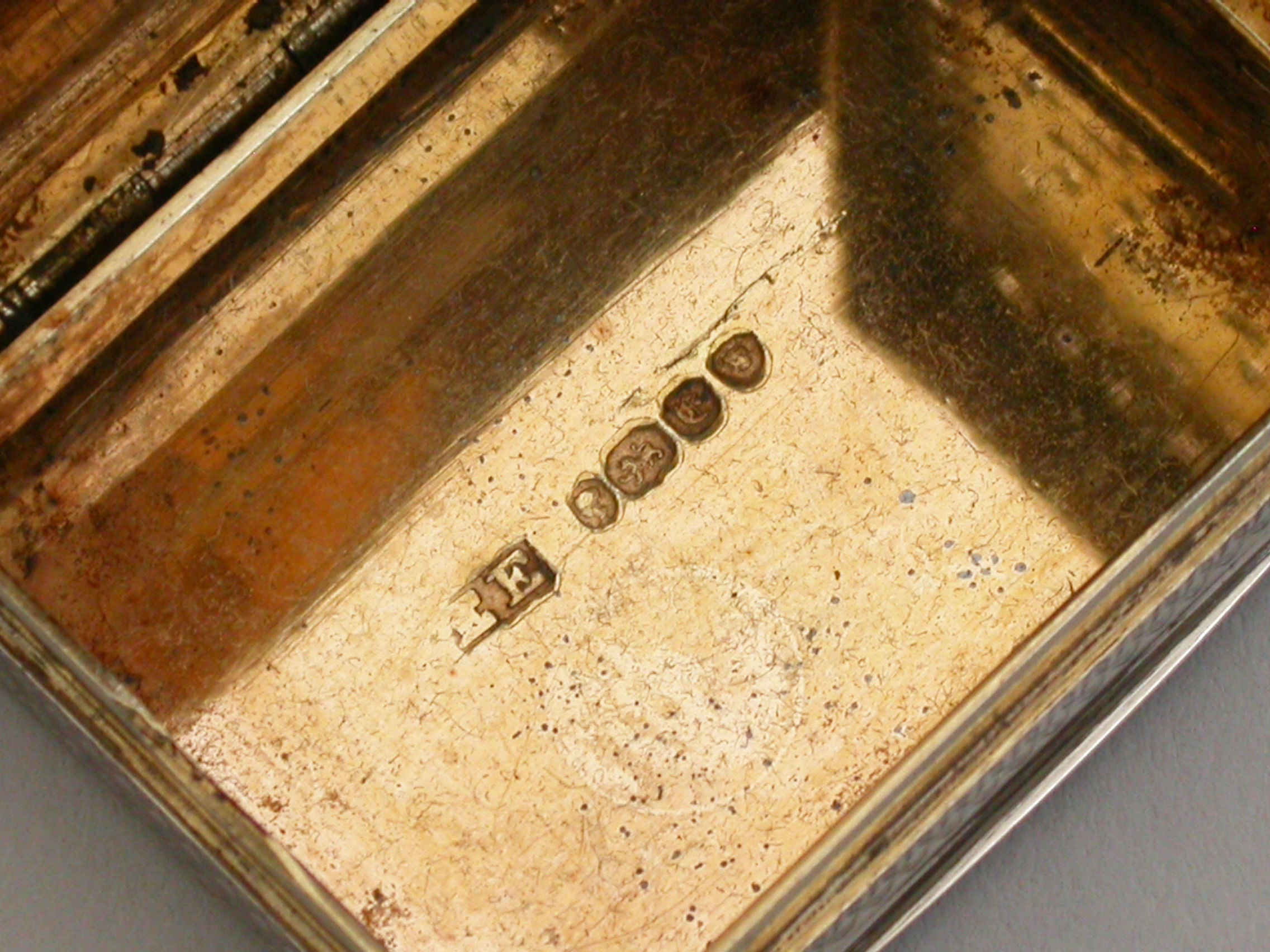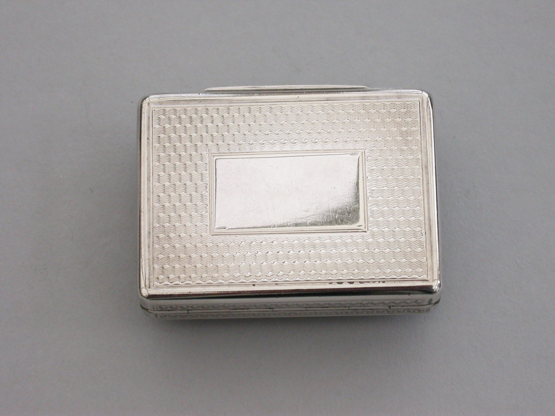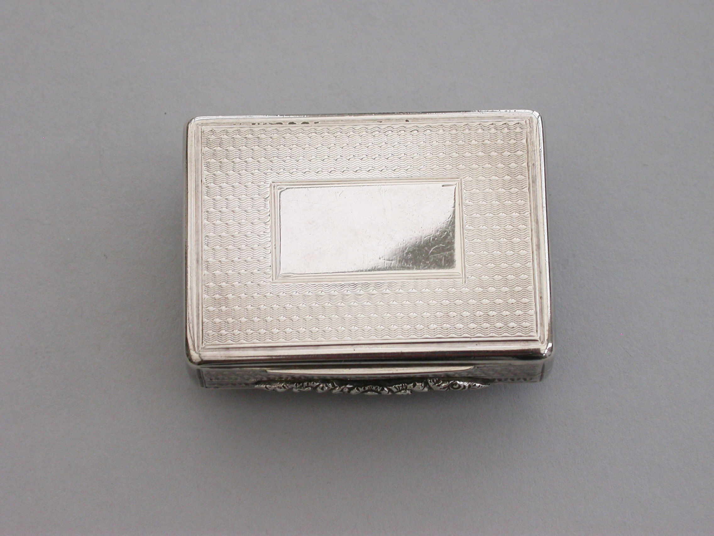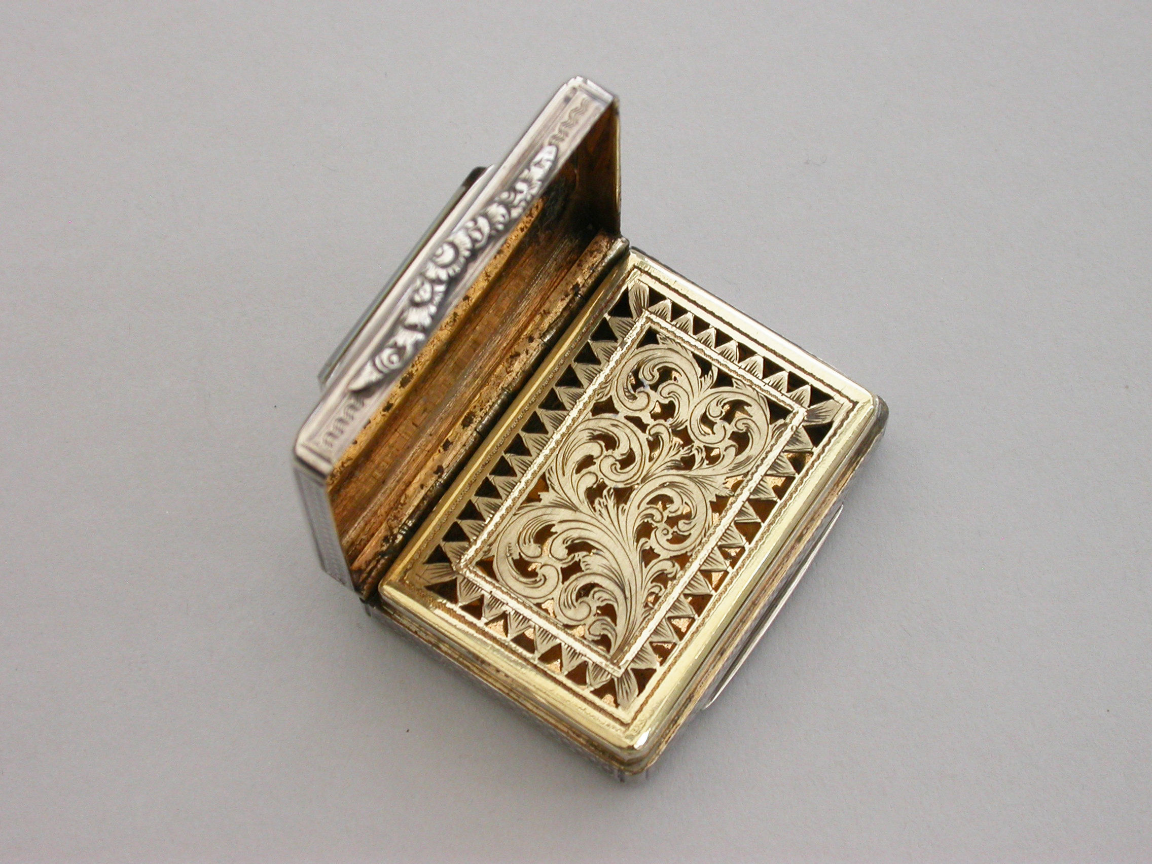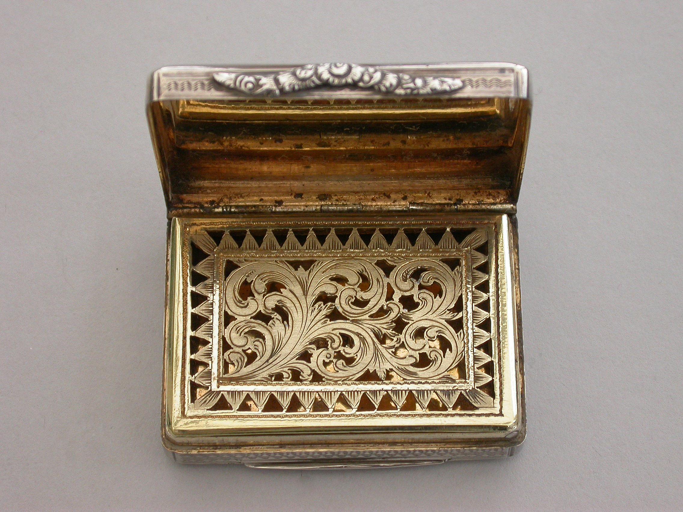 A fine quality and unusual early Victorian silver Memorial Vinaigrette of large rounded rectangular form with raised serpentine thumbpiece, engine turned decoration to the lid, sides and base, a ""locket"" of five strips of plaited hair inset into the cover behind a beveled glass panel, the silver gilt interior with finely pierced grille with ""dog-tooth"" border.